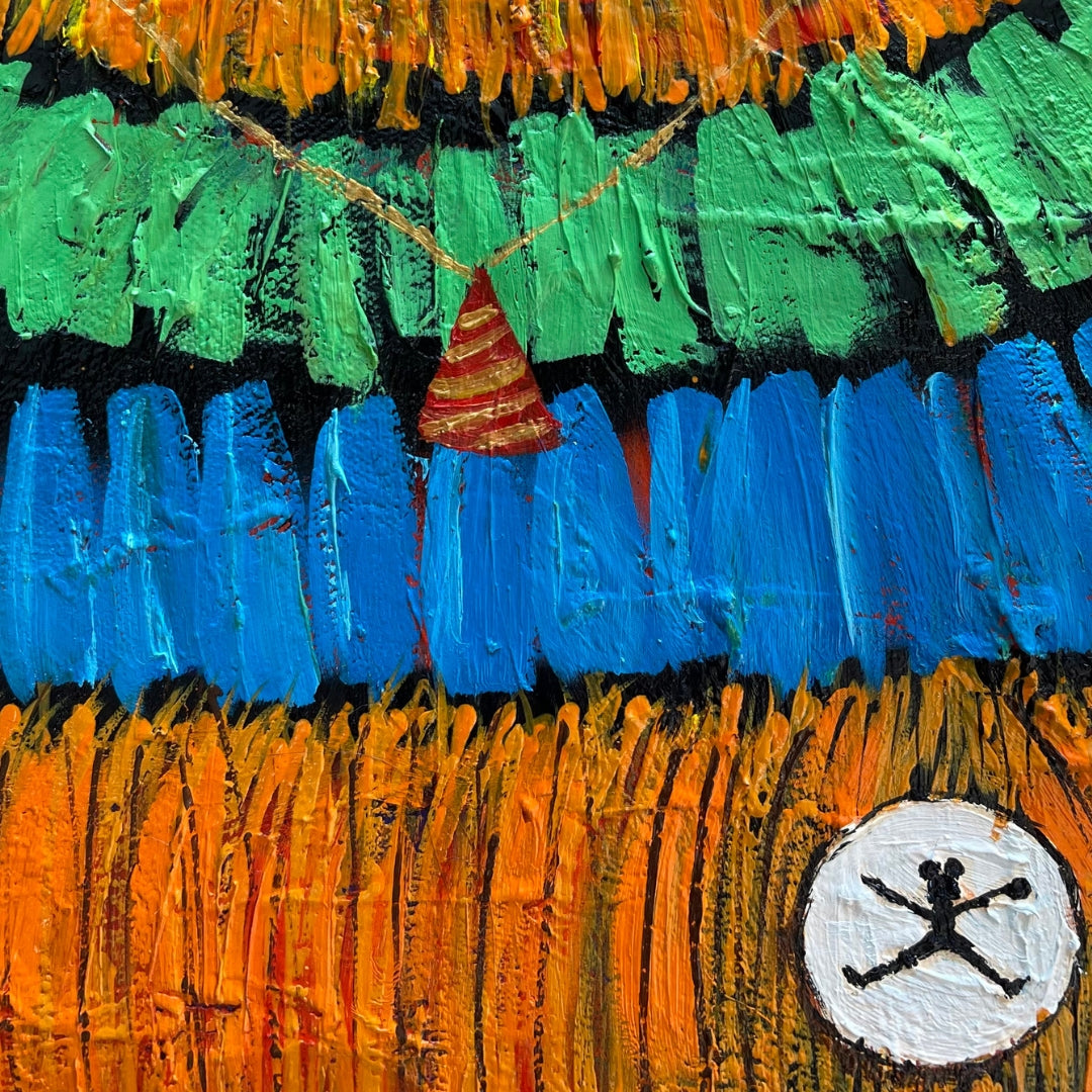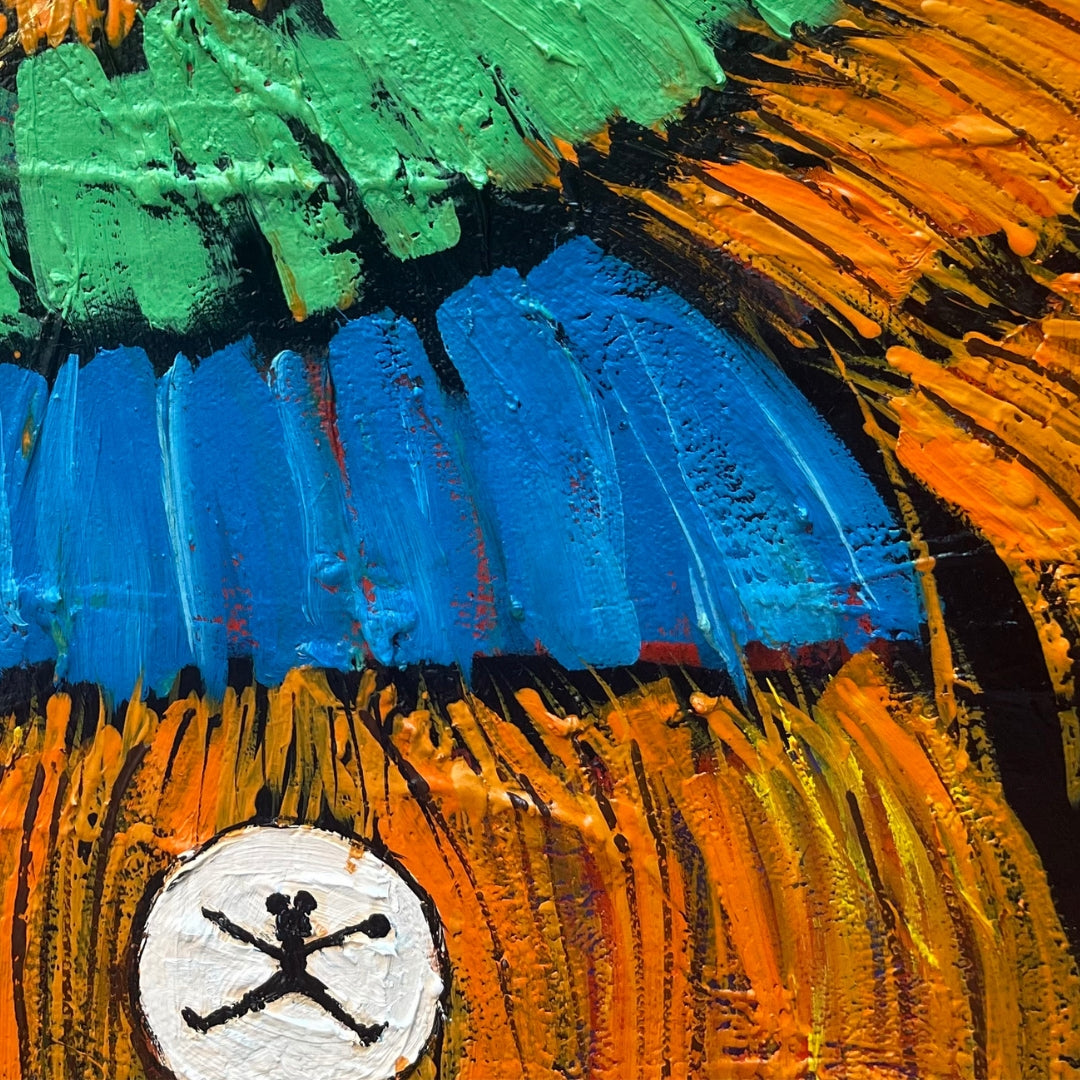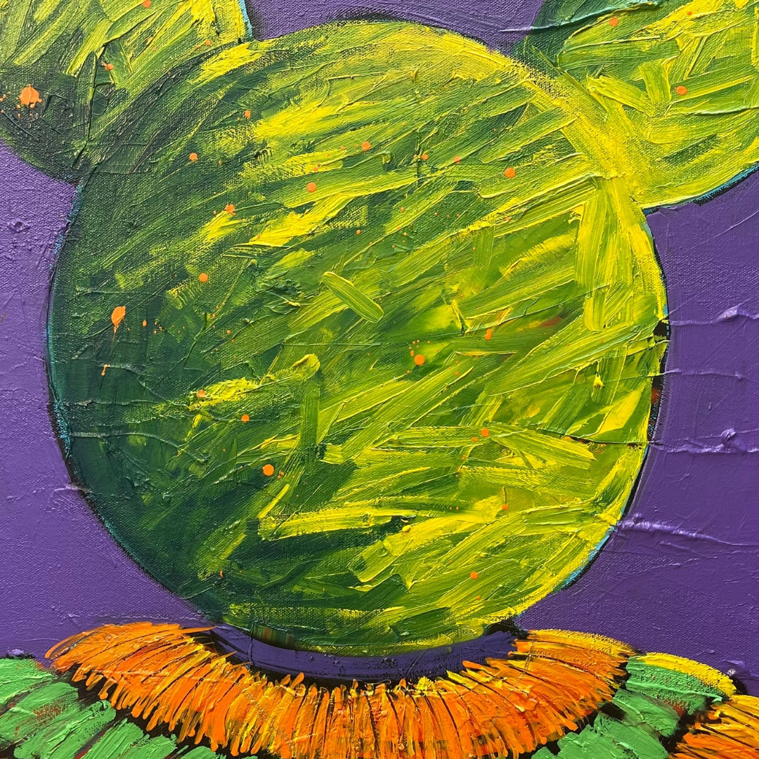 “M&J” nace de un recuerdo personal. De niño Jordan era mi ídolo; sus tenis eran un trofeo inalcanzable para mi en aquel entonces. Esta figura se viste desde un imaginario cercano a mis raíces del norte de Sonora, mezclando infancia, identidad y calle. Soy yo: urbano, colorido, con actitud y memorias aun vivas."