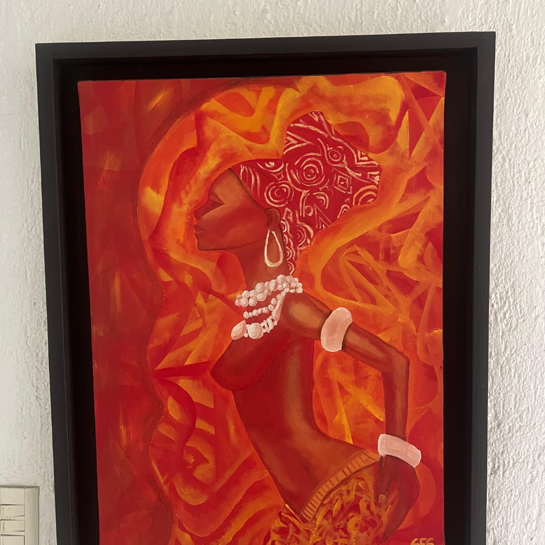 Es una poderosa representación de la fertilidad y la conexión con la Madre Tierra, reflejando la esencia de la cultura africana. En esta pintura, la figura femenina se erige como un símbolo de vida y abundancia, mostrando la fortaleza y la resiliencia de las mujeres en la sociedad.