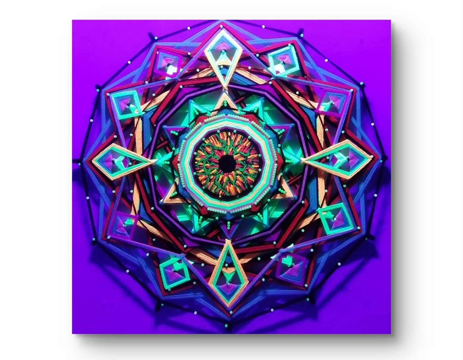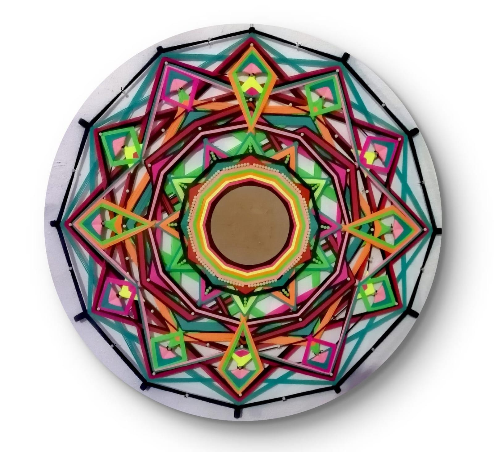 Mandala diseño Huichol con hilos de color neón que al ser puestas en la luz negra dan otro efecto de color iluminante en el lugar. se pueden hacer mas pequeños. se puede vender digitalmente también.