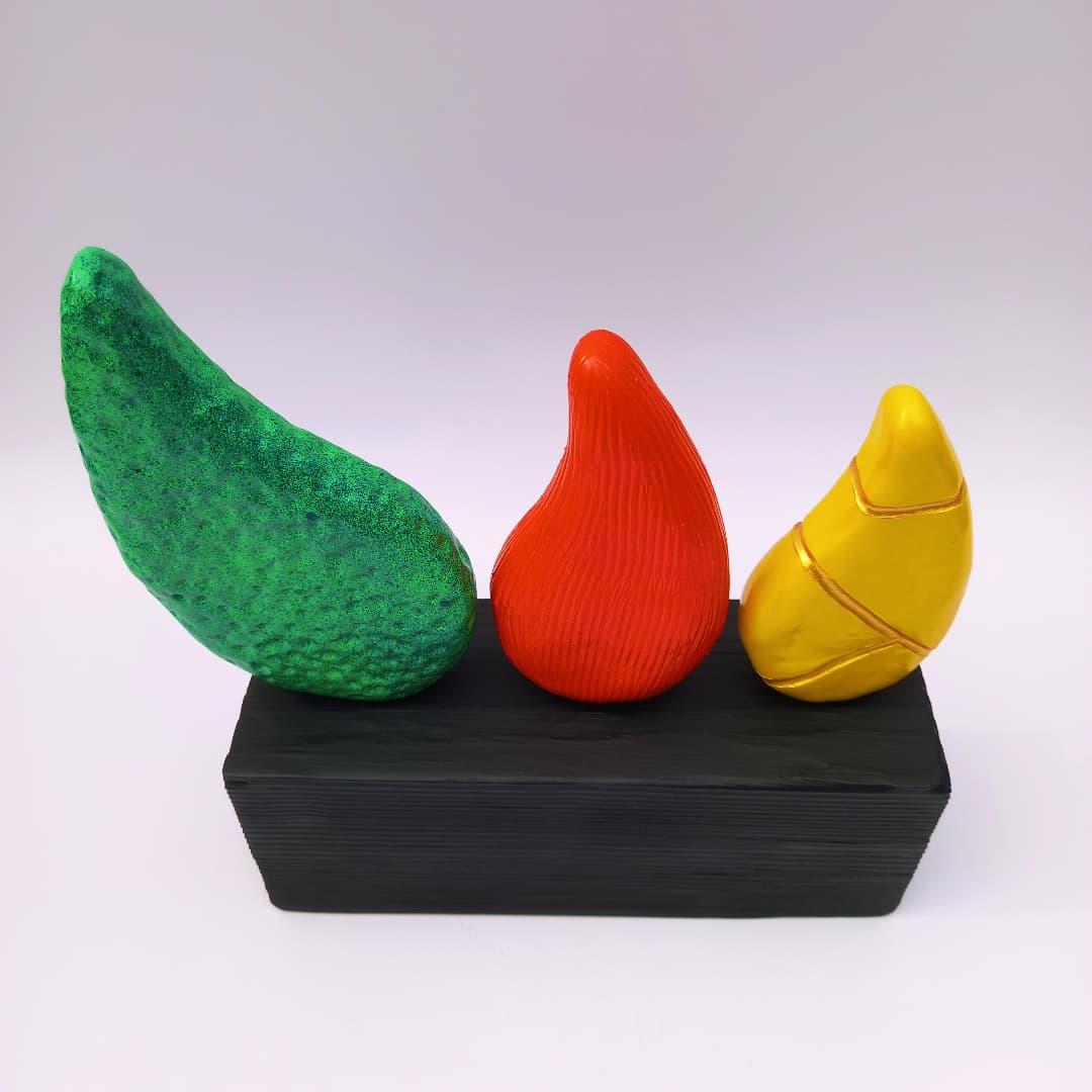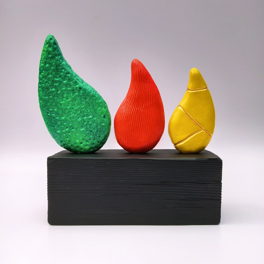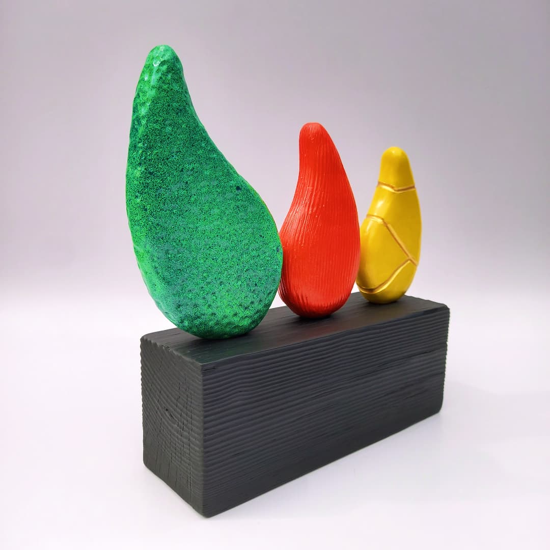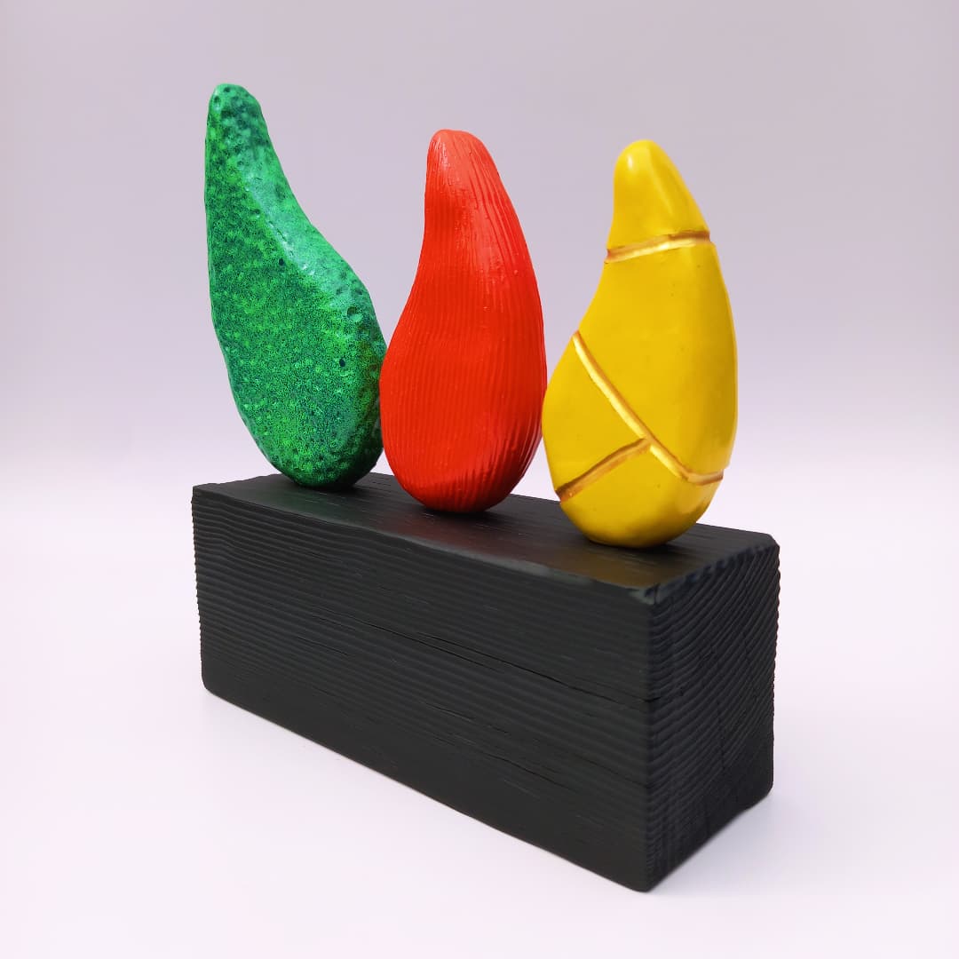 "Manguitos" es una escultura pequeña de 20x15 cm, compuesta por tres figuras de plastilina epóxica con diferentes texturas y colores vibrantes, dispuestas sobre una base de madera texturizada. Su diseño combina lo decorativo con una exploración de la forma, el volumen y la percepción táctil, creando una pieza equilibrada, visualmente llamativa y llena de contraste.
