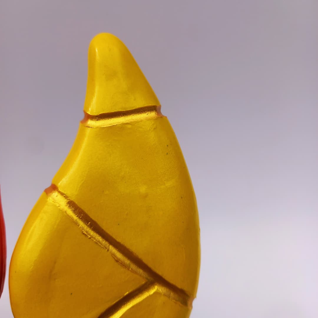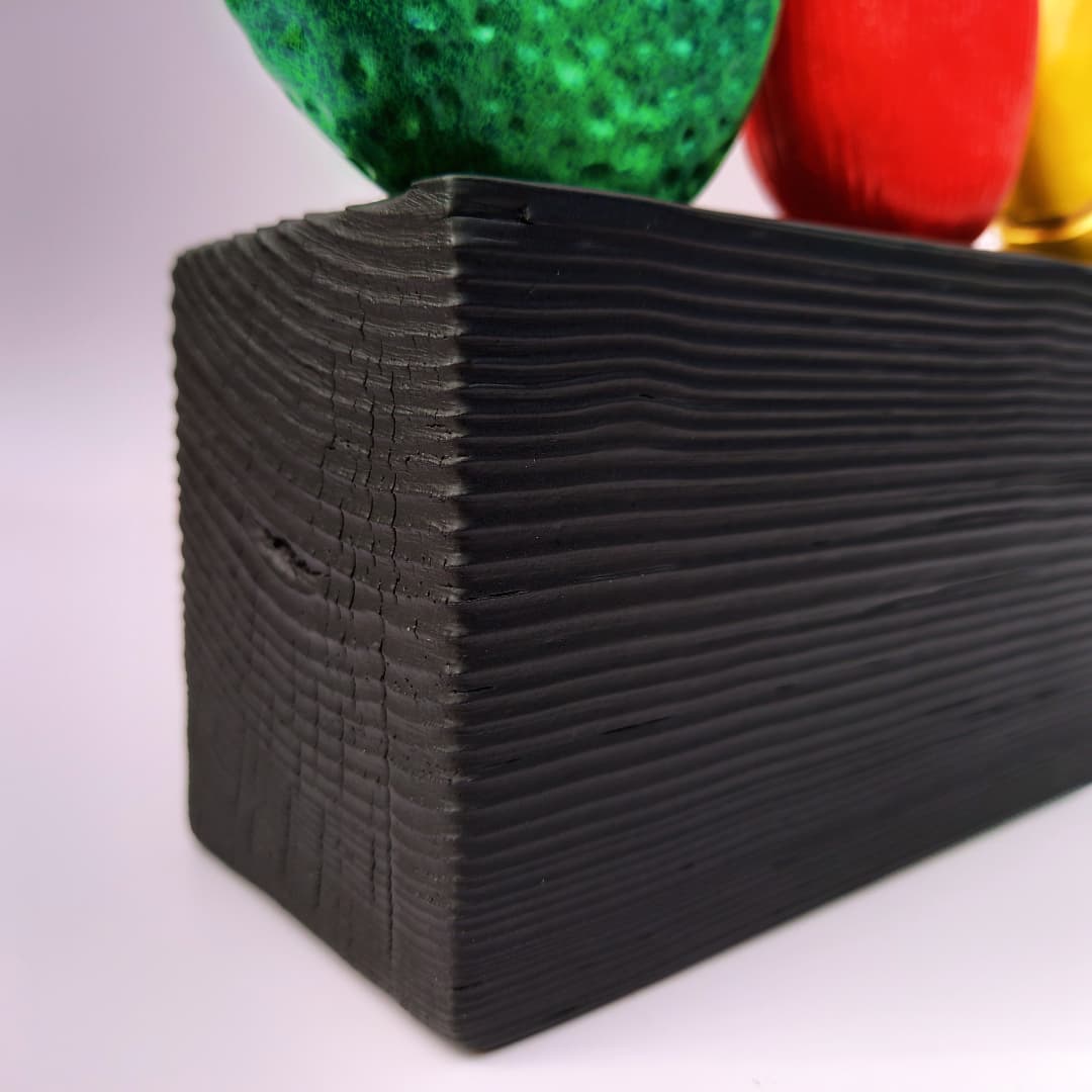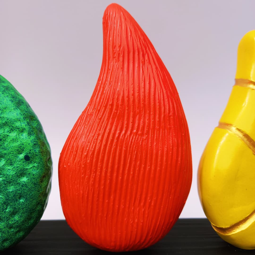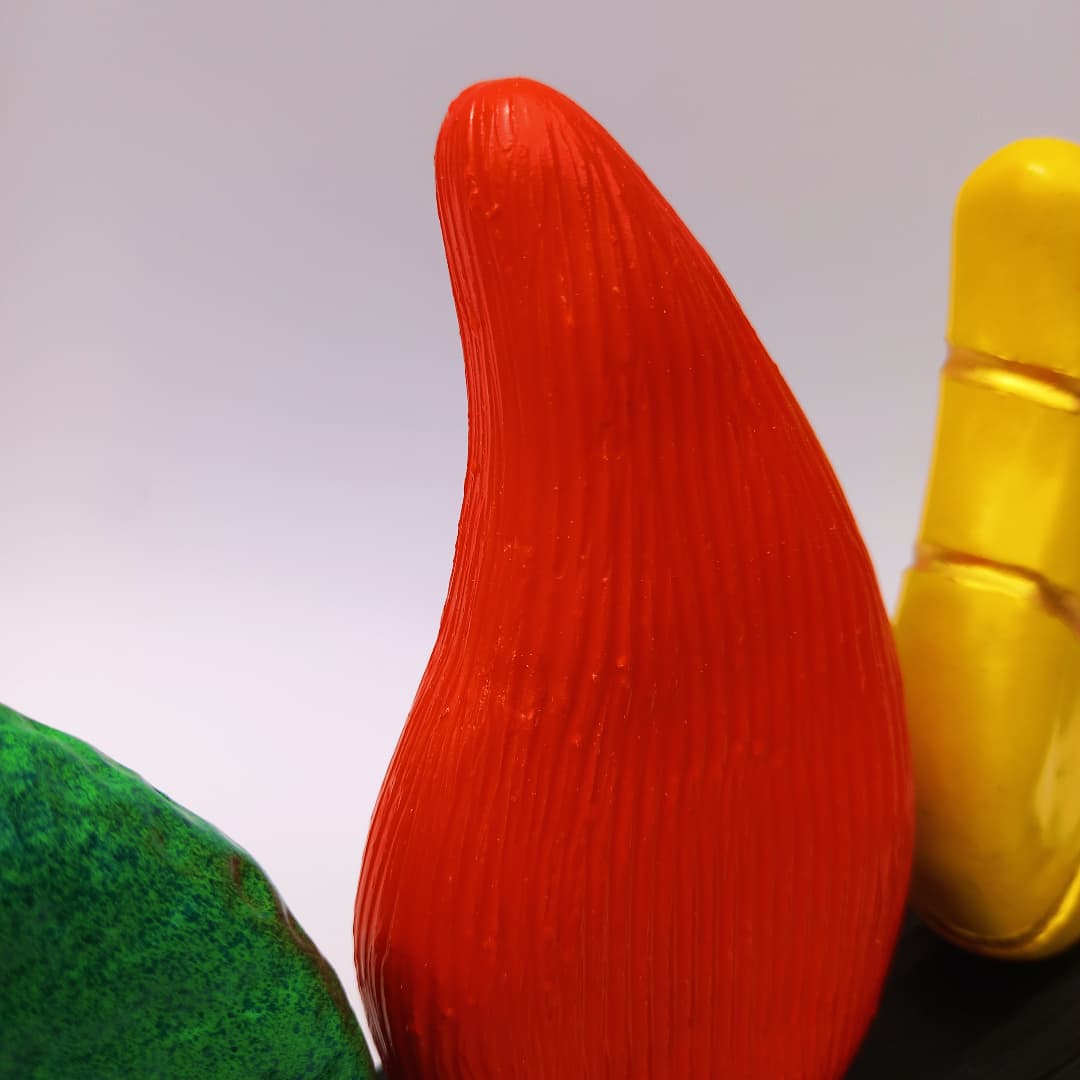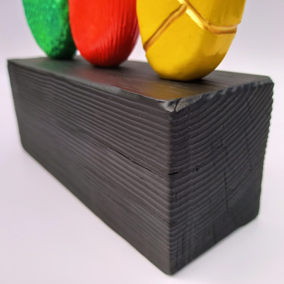 "Manguitos" es una escultura pequeña de 20x15 cm, compuesta por tres figuras de plastilina epóxica con diferentes texturas y colores vibrantes, dispuestas sobre una base de madera texturizada. Su diseño combina lo decorativo con una exploración de la forma, el volumen y la percepción táctil, creando una pieza equilibrada, visualmente llamativa y llena de contraste.