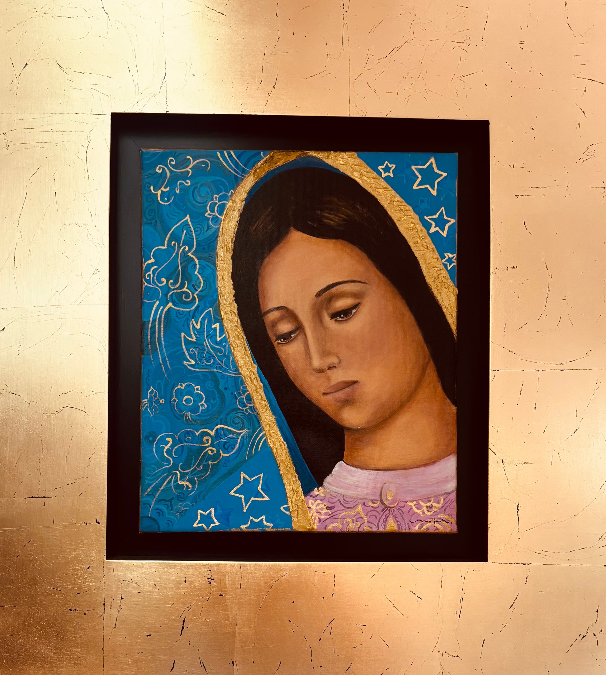 La Virgen de Guadalupe en su mirada nos transmite ternura y serenidad, su manto nos cubre y protege con amor. En esta obra el cielo es una abstracción del manto, simbolizando lo eterno e infinito de su esencia.