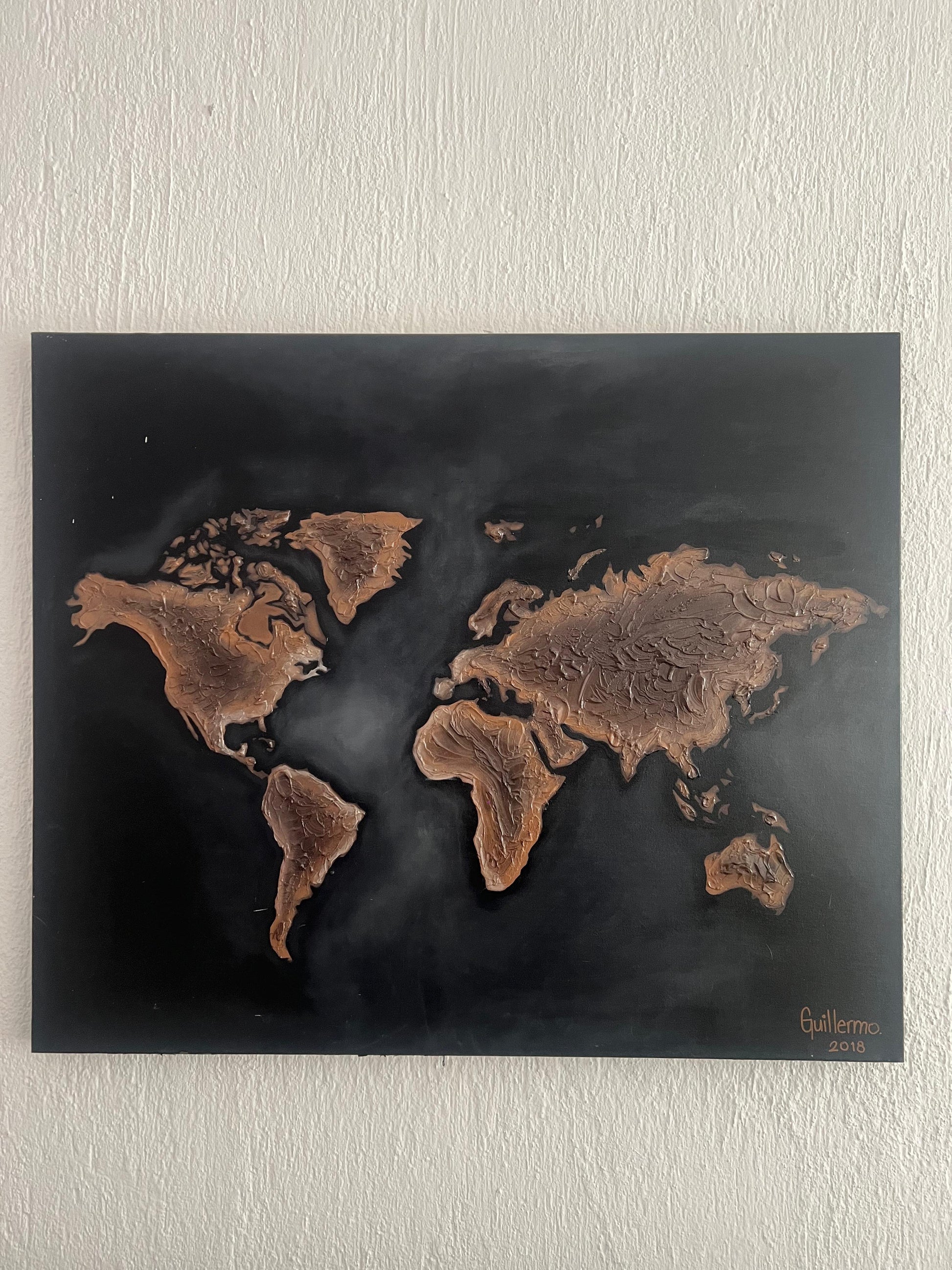 Mapa del mundo creado con textura, ideal para una oficina o sala de estar. Los colores negros y cafés hacen que sea muy combinable con casi todos los espacios.
