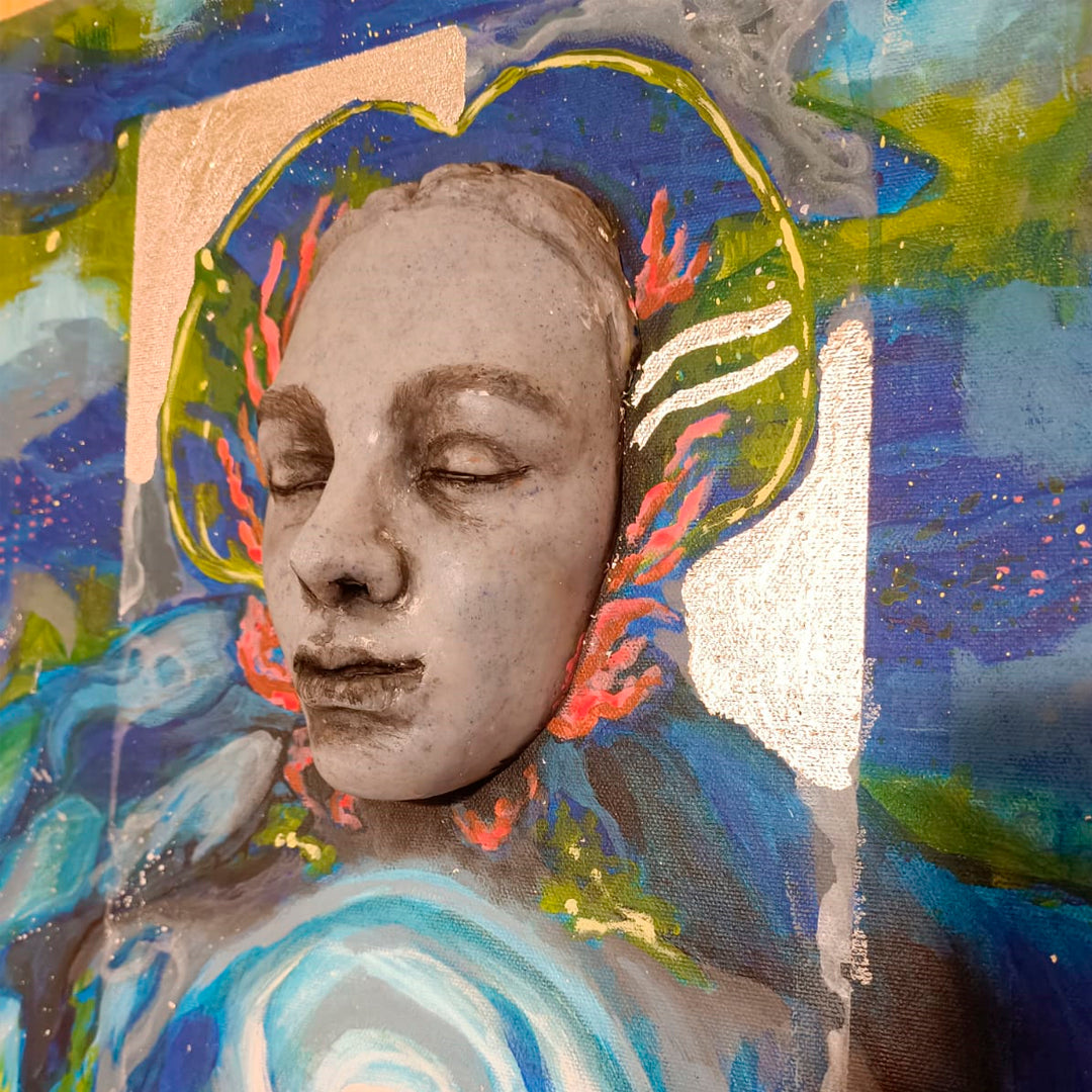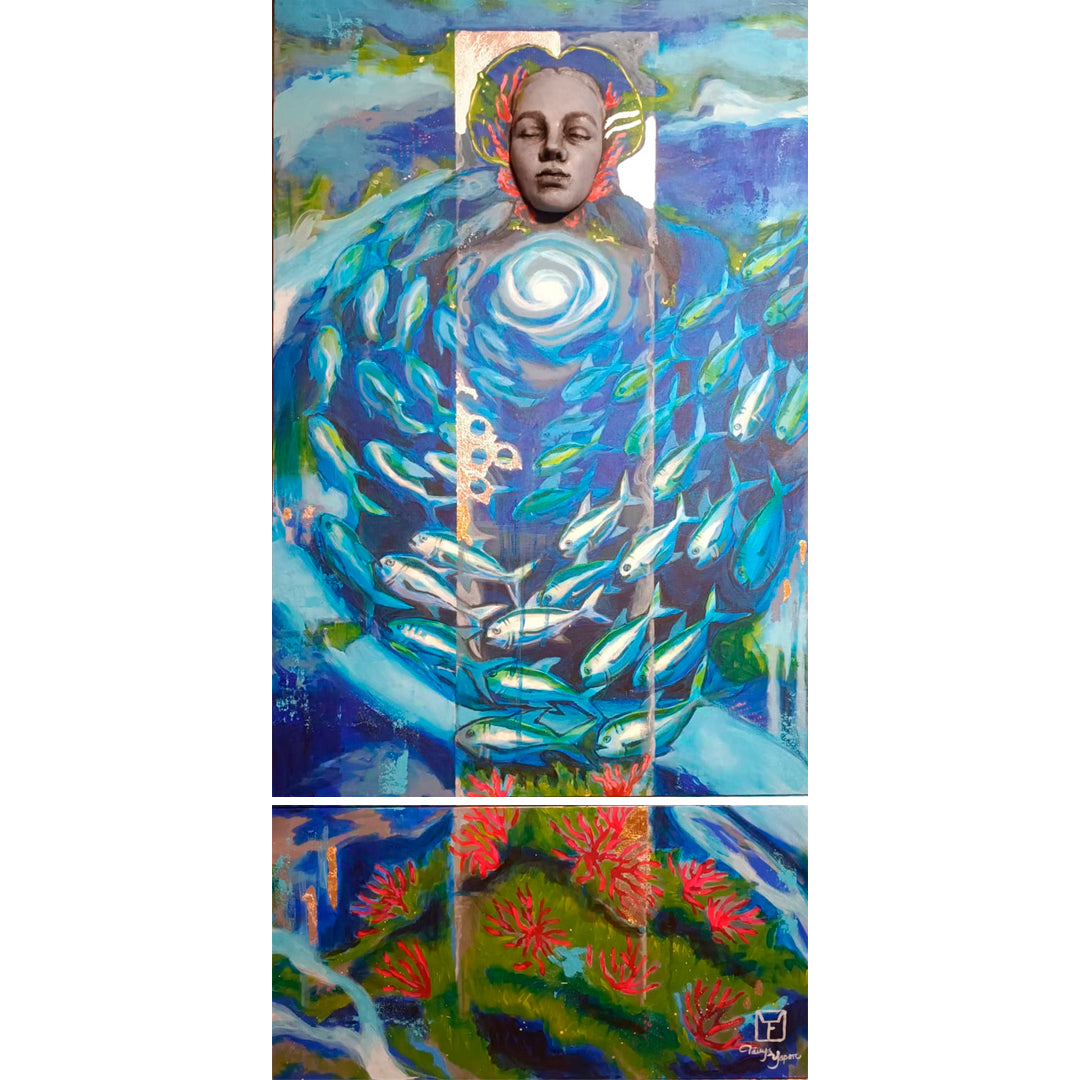En esta obra una mujer se alza como el alma del océano, rodeada por un cardumen que danza en armonía. Su pecho resplandece, irradiando una luz cálida que parece latir con la energía ancestral del mar. De pie sobre un lecho de algas y coral, se fusiona con el paisaje marino, convirtiéndose en el puente entre lo humano y lo natural. Es un tributo a la fuerza femenina, vital y serena, que fluye como las corrientes profundas, tejiendo vida en el abismo.
