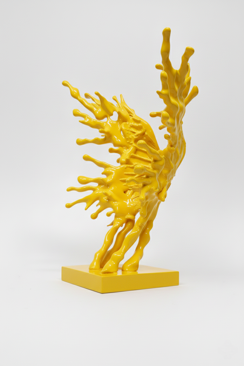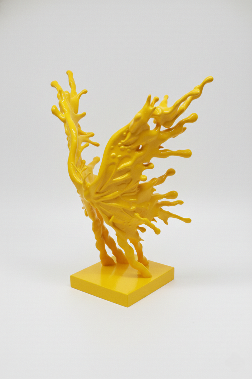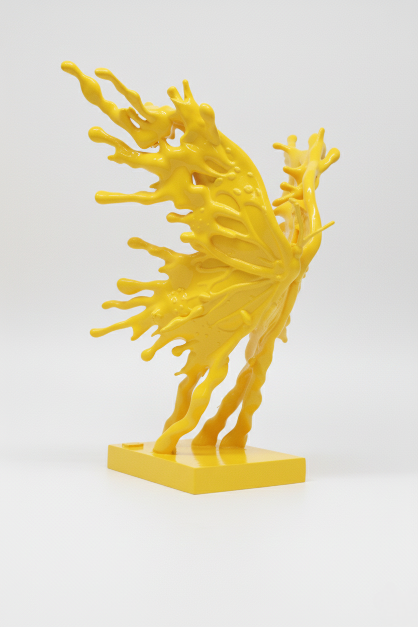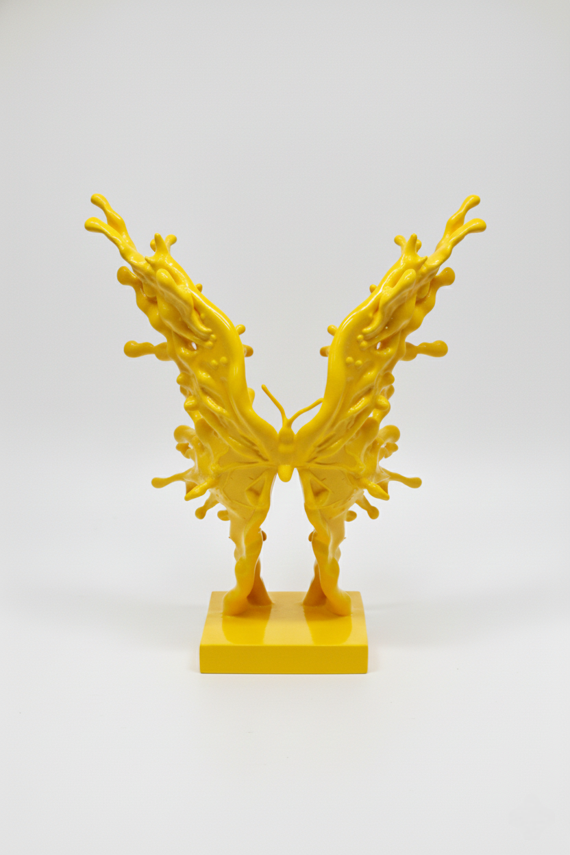 Una mariposa en pleno vuelo, esculpida en amarillo, símbolo de una vitalidad radiante y el despertar de la alegría.