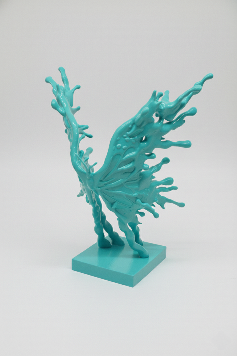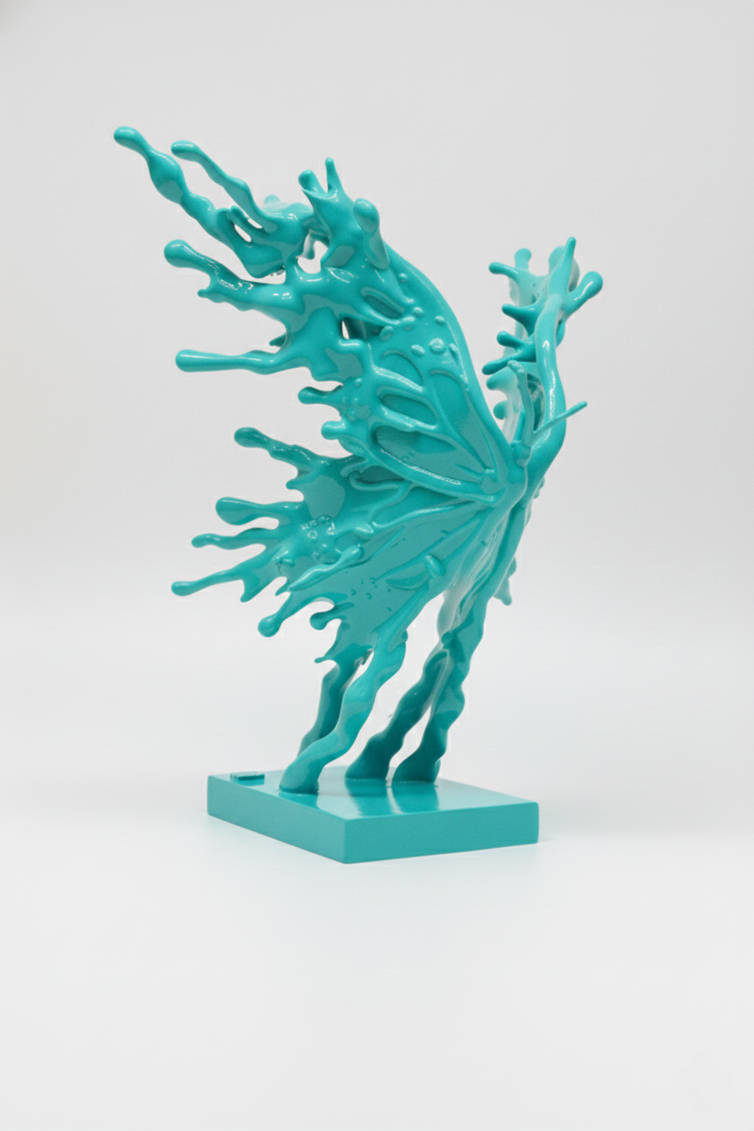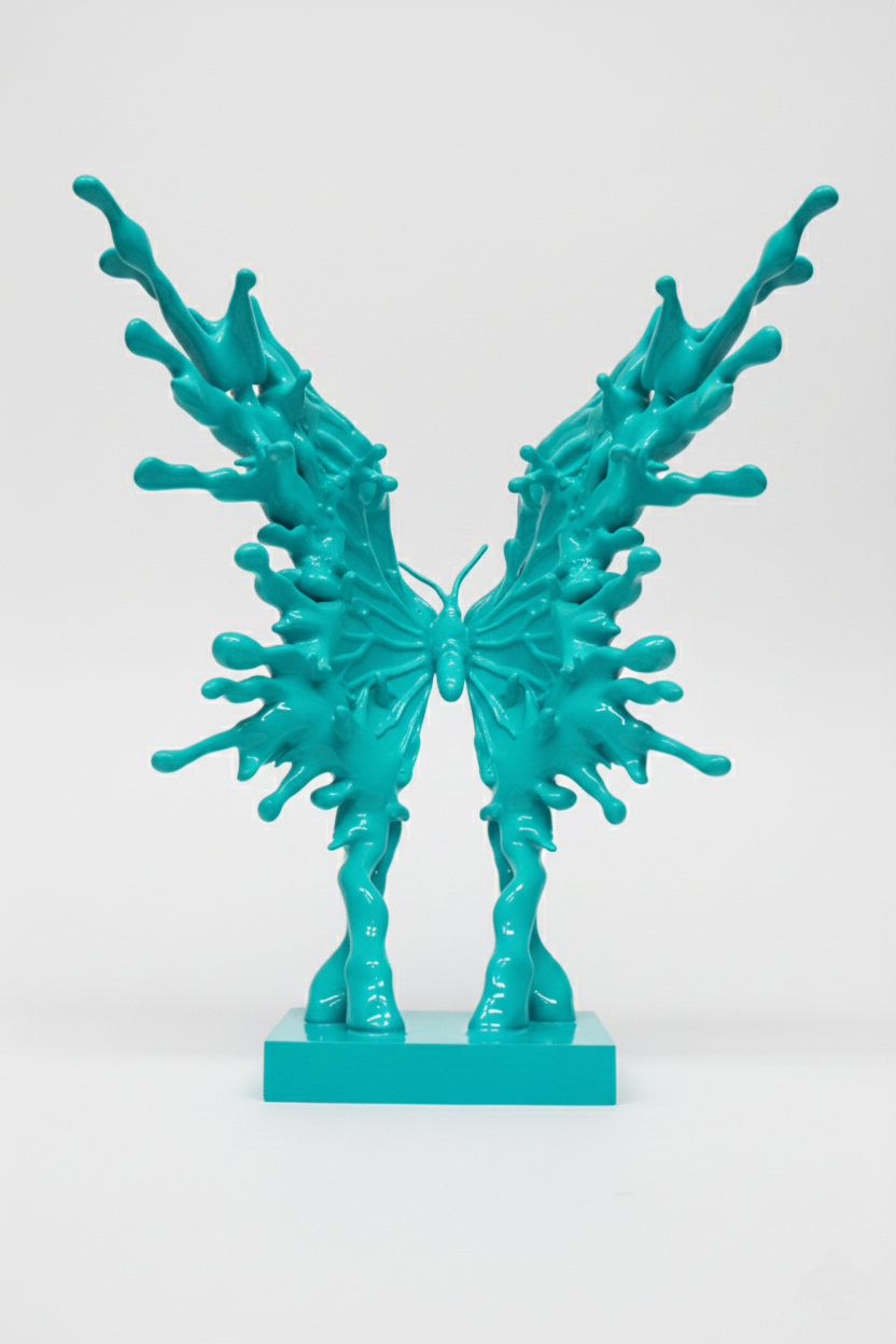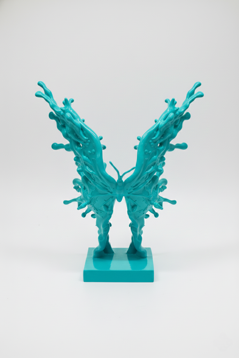 Una mariposa en pleno vuelo, esculpida en turquesa, combinando la ligereza del aire con la profundidad del océano, convirtiéndose en un emblema de equilibrio y renovación cristalina.
