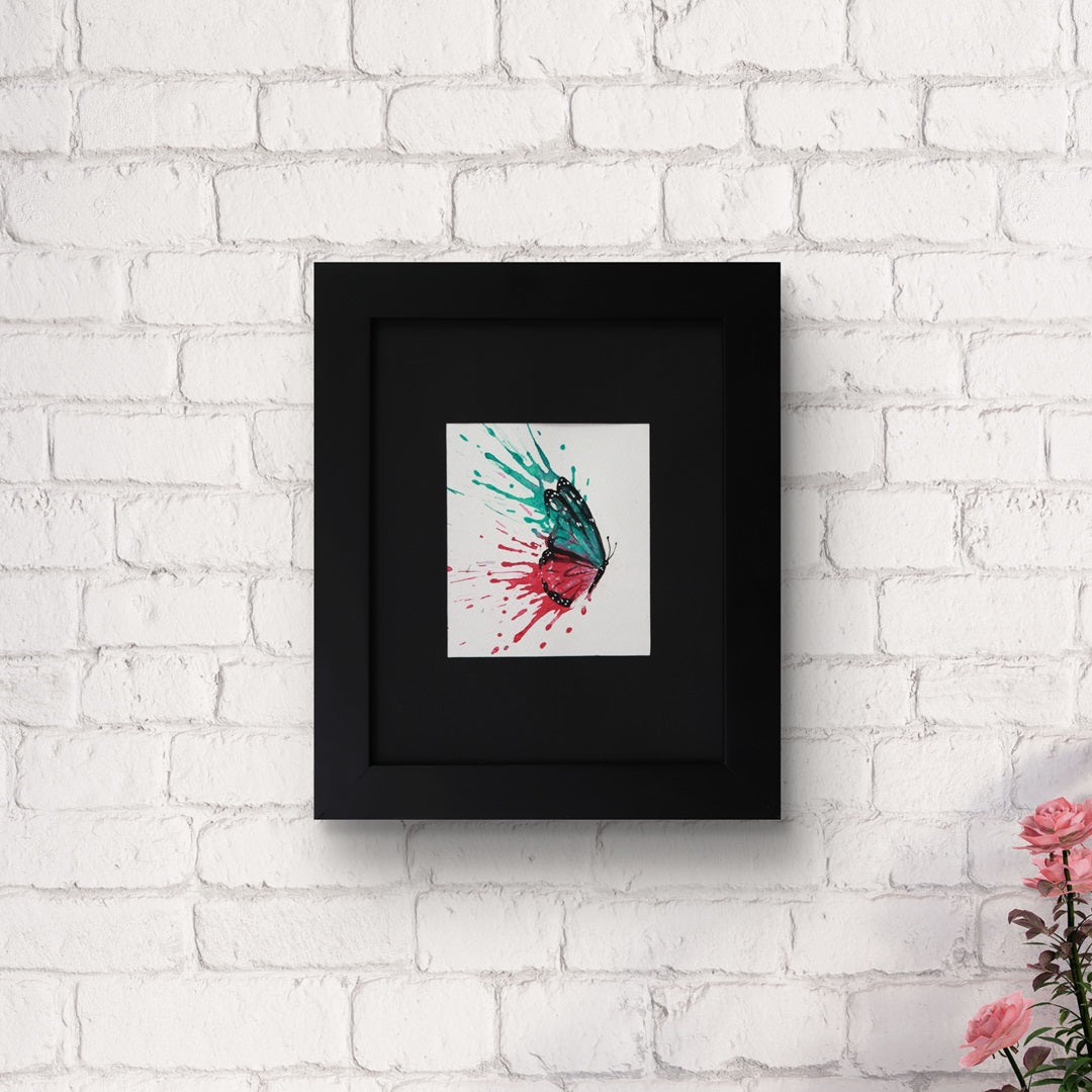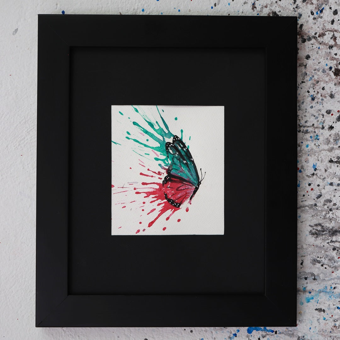 Emprendiendo el vuelo en tonos de turquesa y rosa, simboliza el renacer, la esperanza y la libertad. Las manchas que la rodean parecen reflejar el momento exacto en que la vida explota en color y energía, evocando el poder del cambio y la evolución personal.