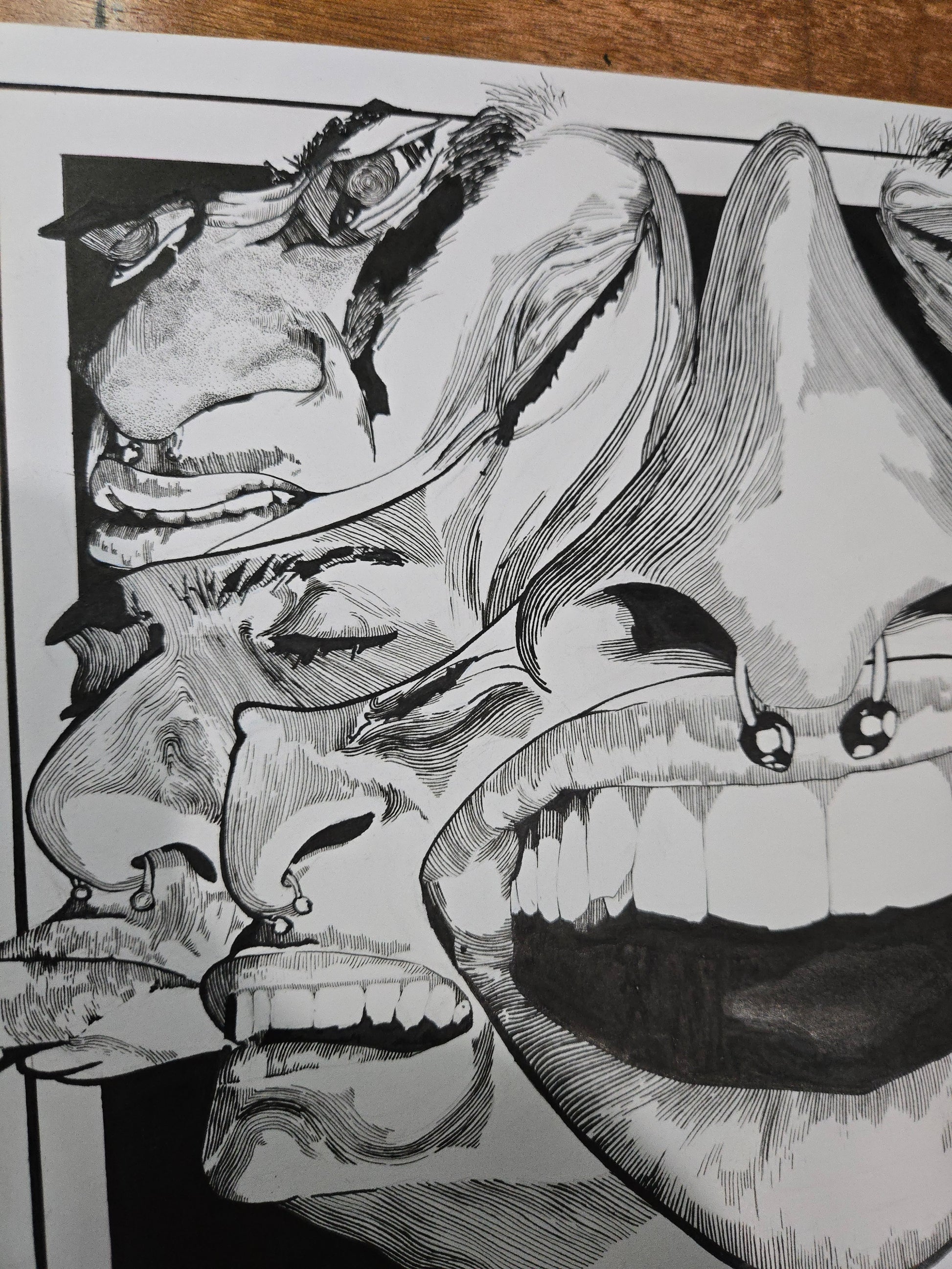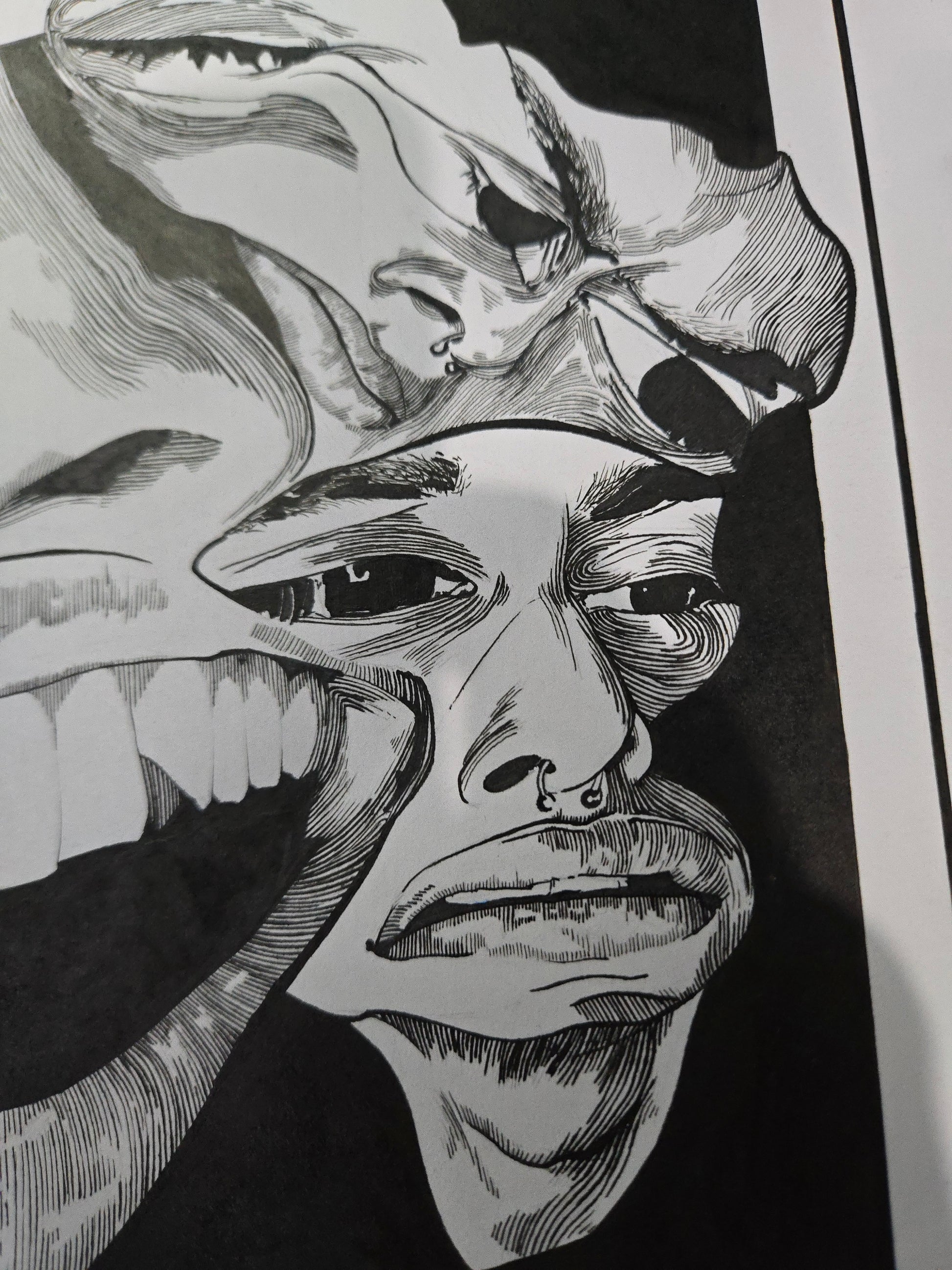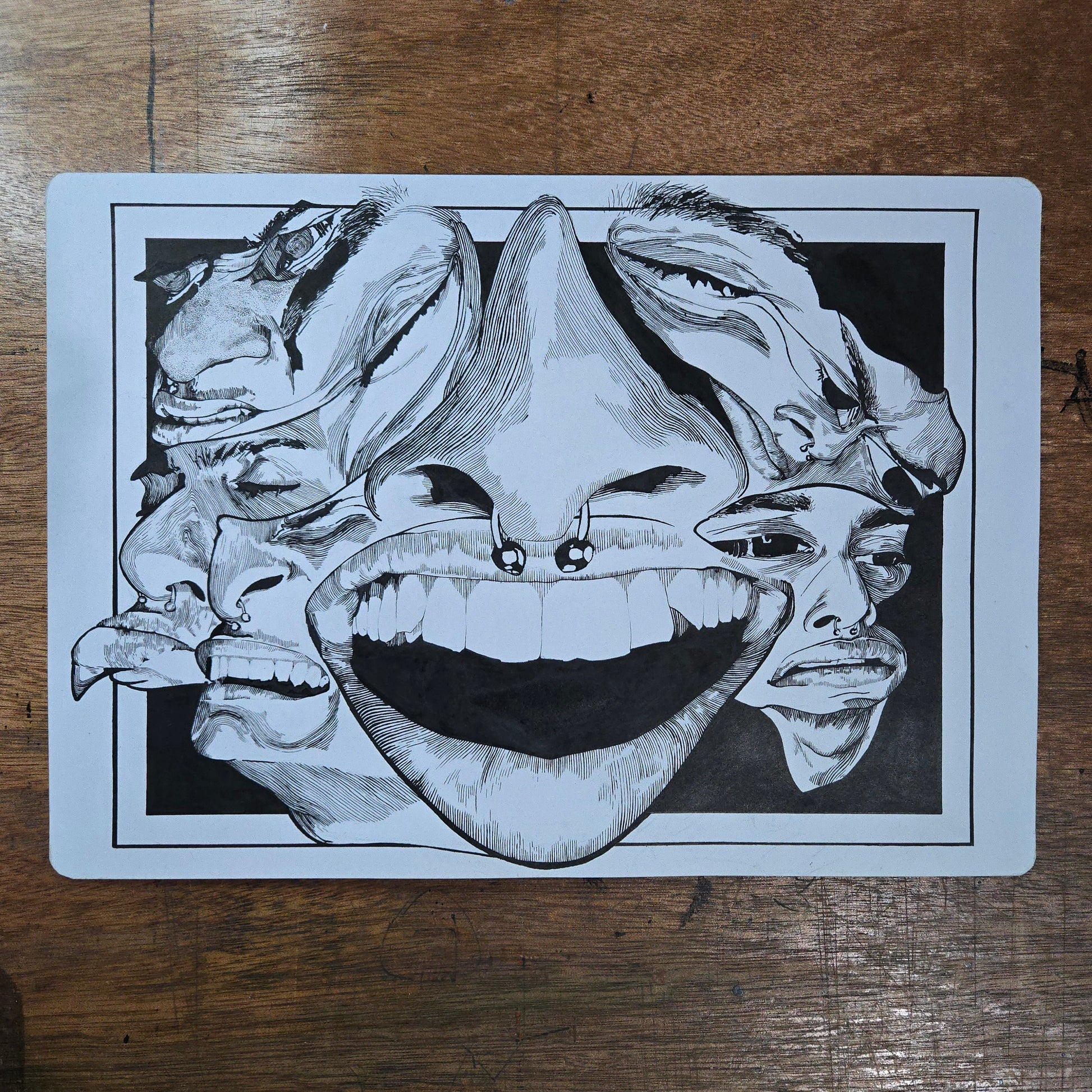 La mascara habla sobre una persona frustrada que esconde con una gran y falsa sonrisa su verdadero estado de animo. Sus emociones tristes y enojadas aquellas con las que se aisla mentalmente la mayor parte del tiempo, las oculta detrás de una sonrisa que transmite el verdadero vacío y enojo que tiene dentro, una sonrisa apagada, obligada nada real.