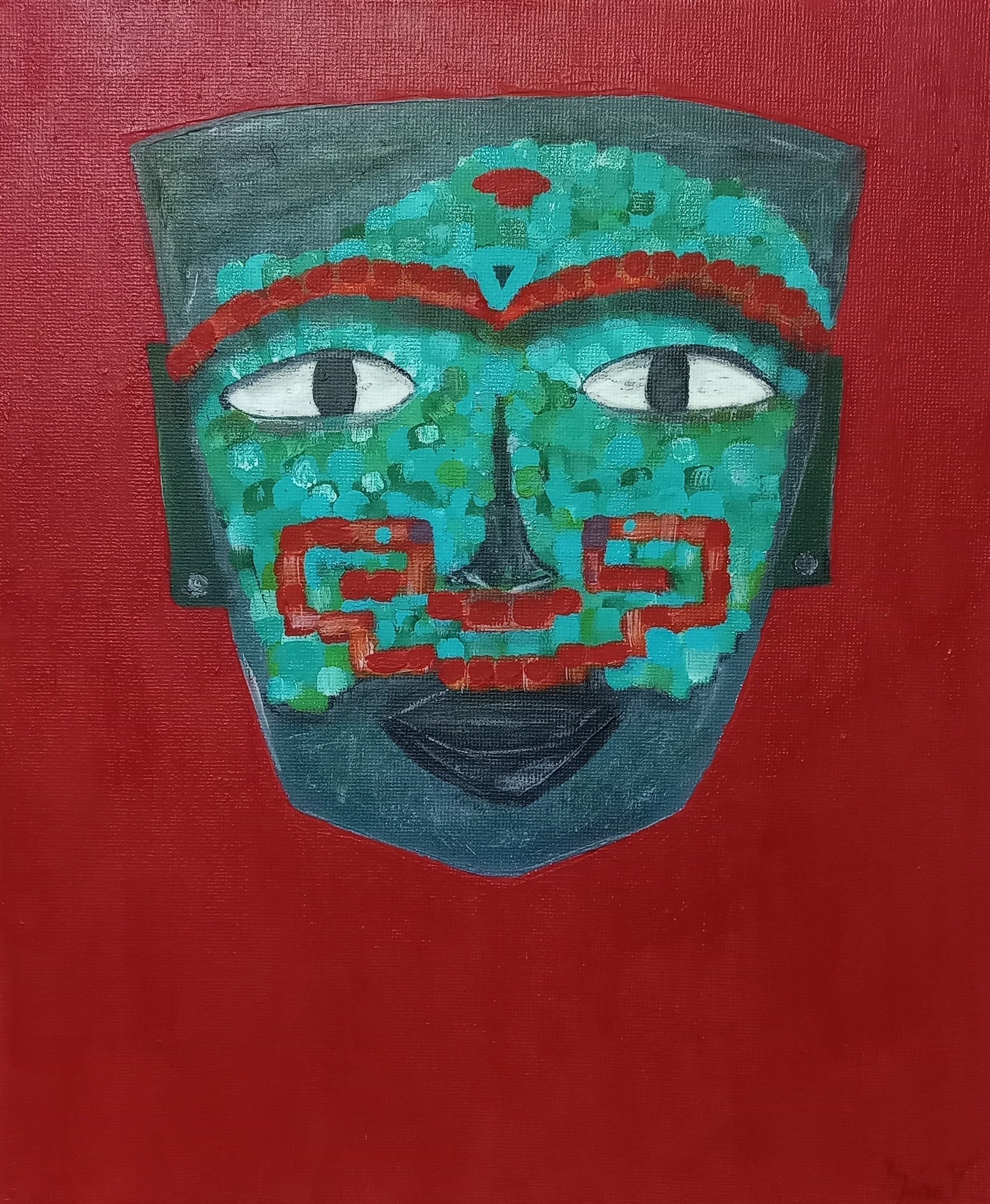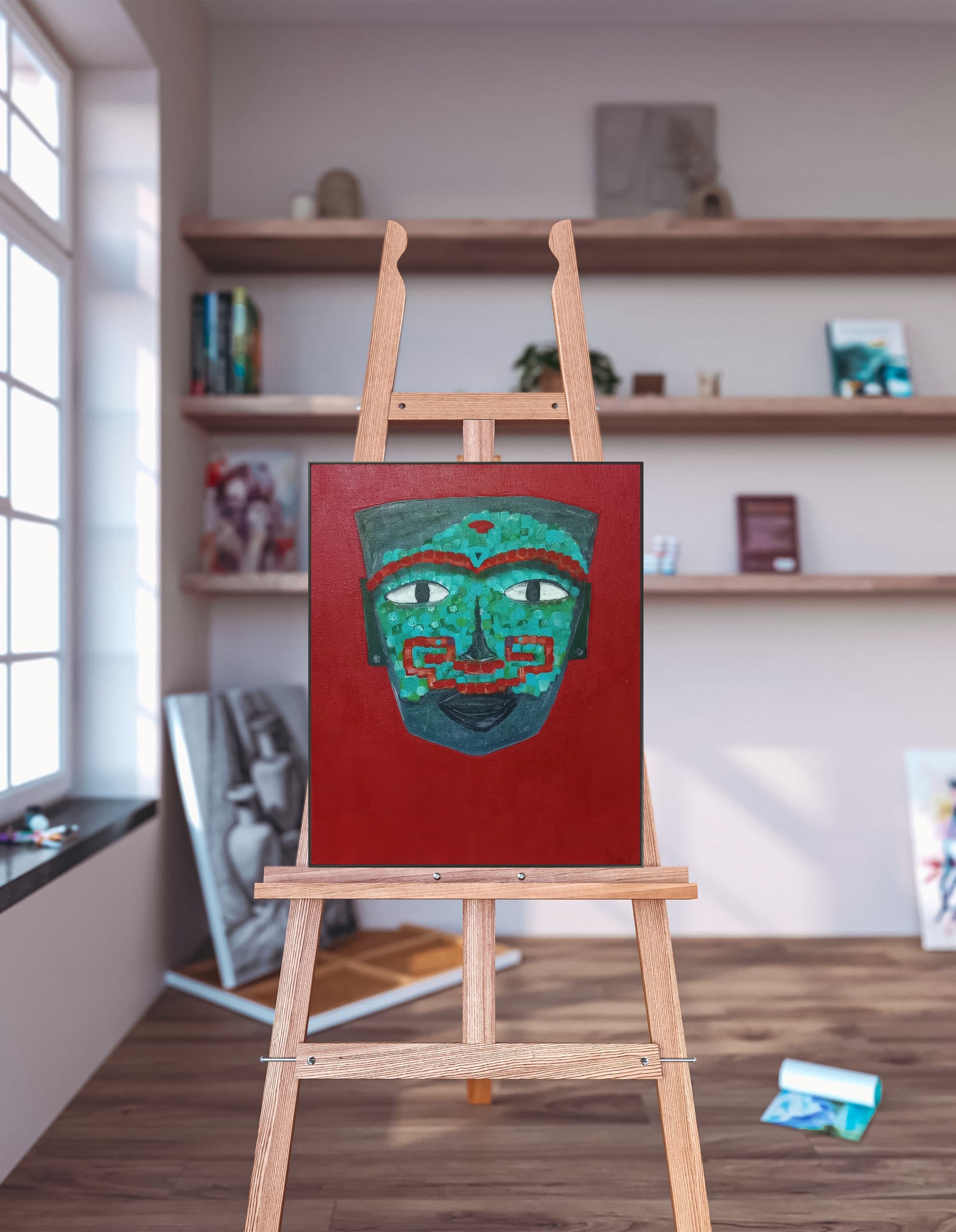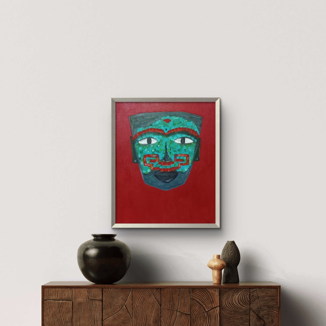 Tributo a la máscara prehispánica hallada en Malinaltepec, Guerrero, que transmite una profunda carga cultural y espiritual. Representada en tonos verdes que evocan las teselas de turquesa, concha y amazonita, resalta sobre un fondo rojo que potencia su brillo.