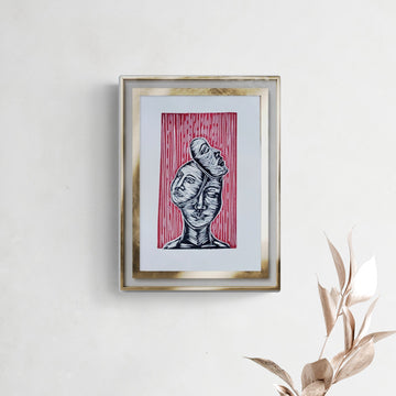 Linograbado, (a dos tintas sobre papel Fabriano de 260gr, color negro y rojo).