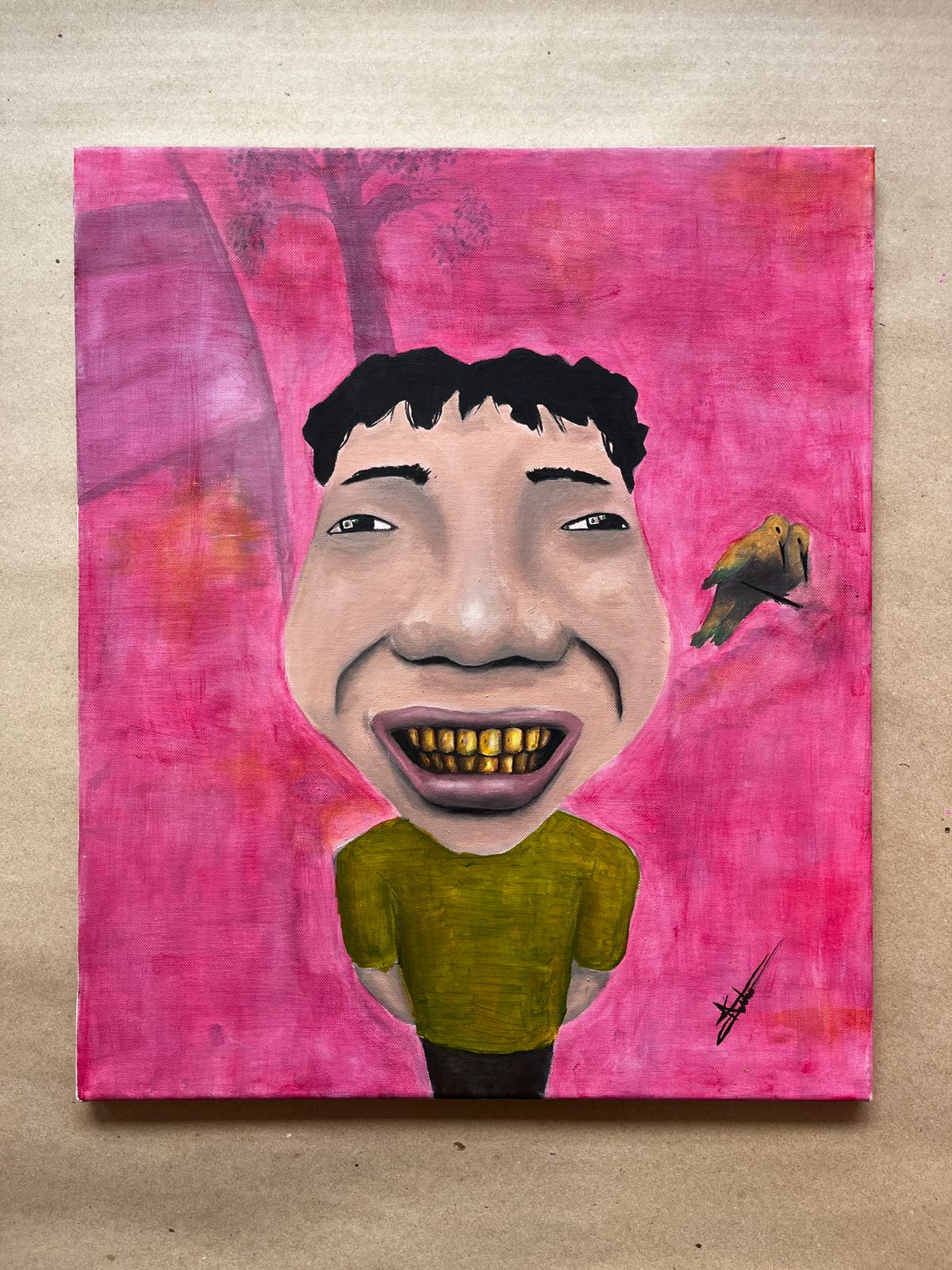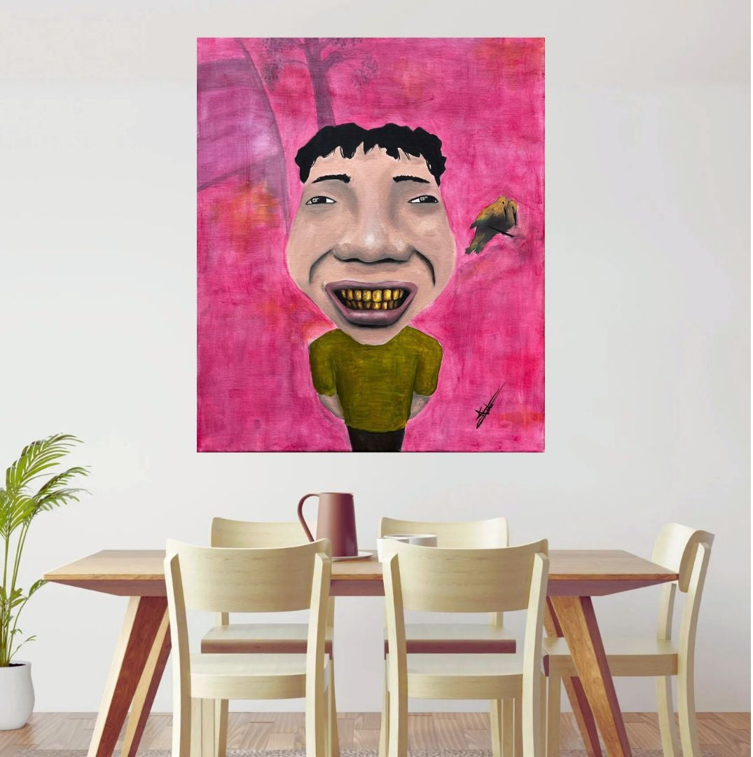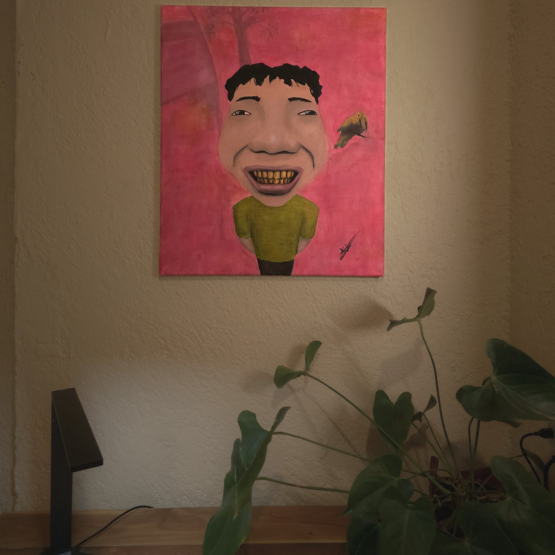 Un hombre caricaturesco con cabeza grande, sonrisa de dientes dorados y cuerpo pequeño, sobre un fondo rosa vibrante con un ave y formas difusas de árboles. El estilo mezcla lo surrealista y lo humorístico con un aire inquietante.