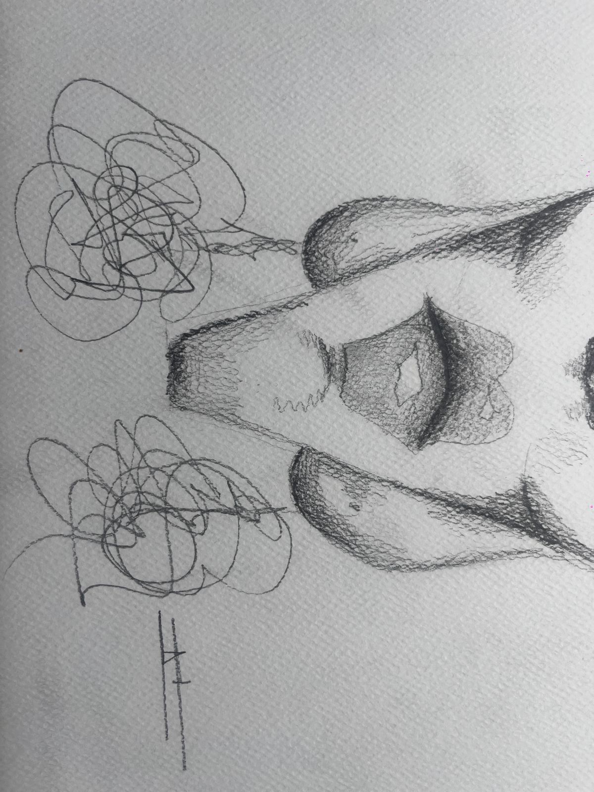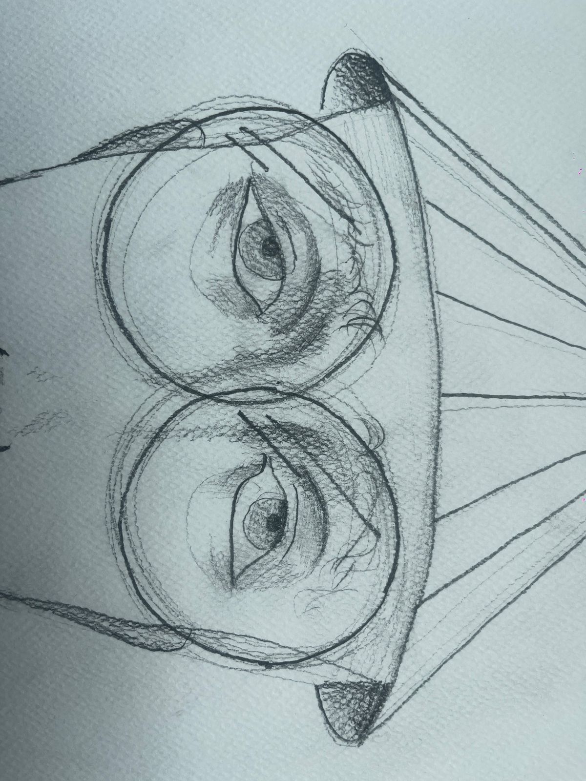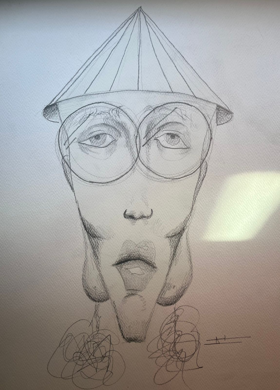 Este dibujo es un retrato surrealista con un rostro alargado y exagerado, usando grandes gafas redondas, un sombrero cónico y labios prominentes. Los trazos caóticos en el cuello y las proporciones distorsionadas le dan un estilo expresionista y enigmático. Parece una mezcla entre caricatura y arte abstracto.