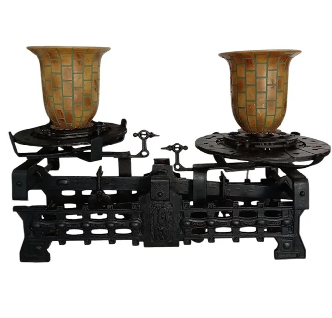 Esta pieza está construida a partir de una balanza mecánica de hierro fundido con capacidad para 10 kilos, fabricada entre 1920 y 1940. Sobre ella se ensamblaron dos discos de embrague de automóvil y plafones de vidrio antiguos, todos materiales reciclados.