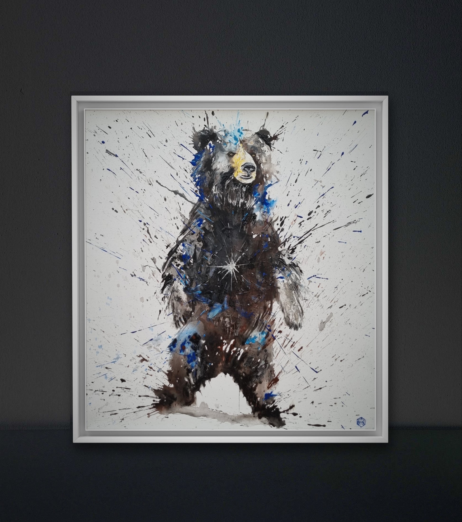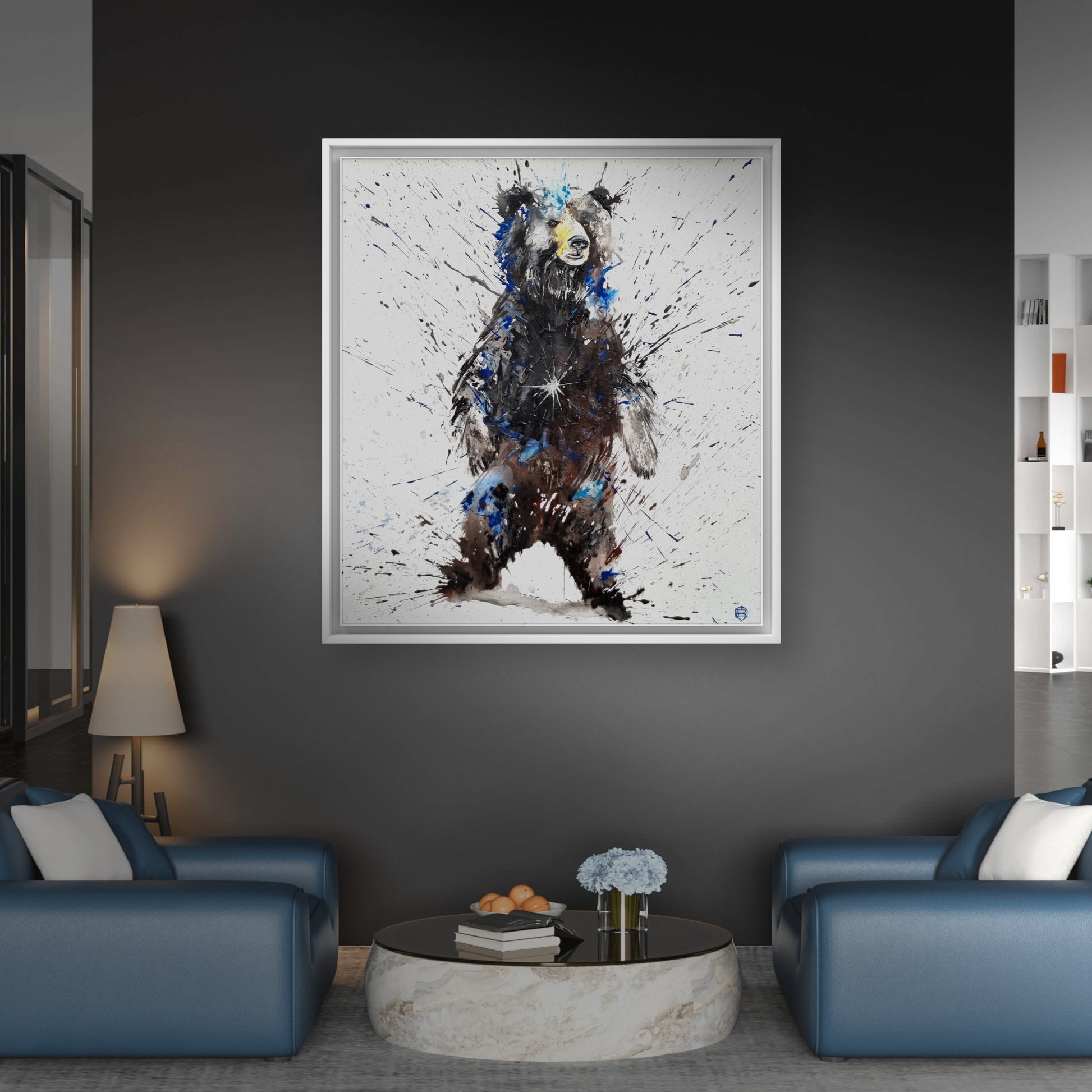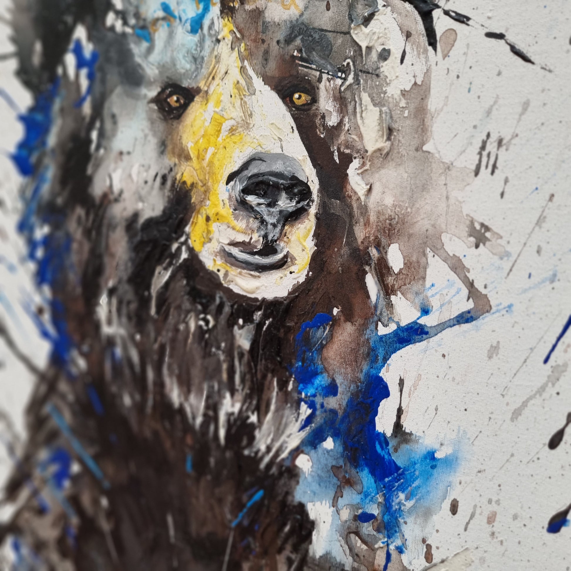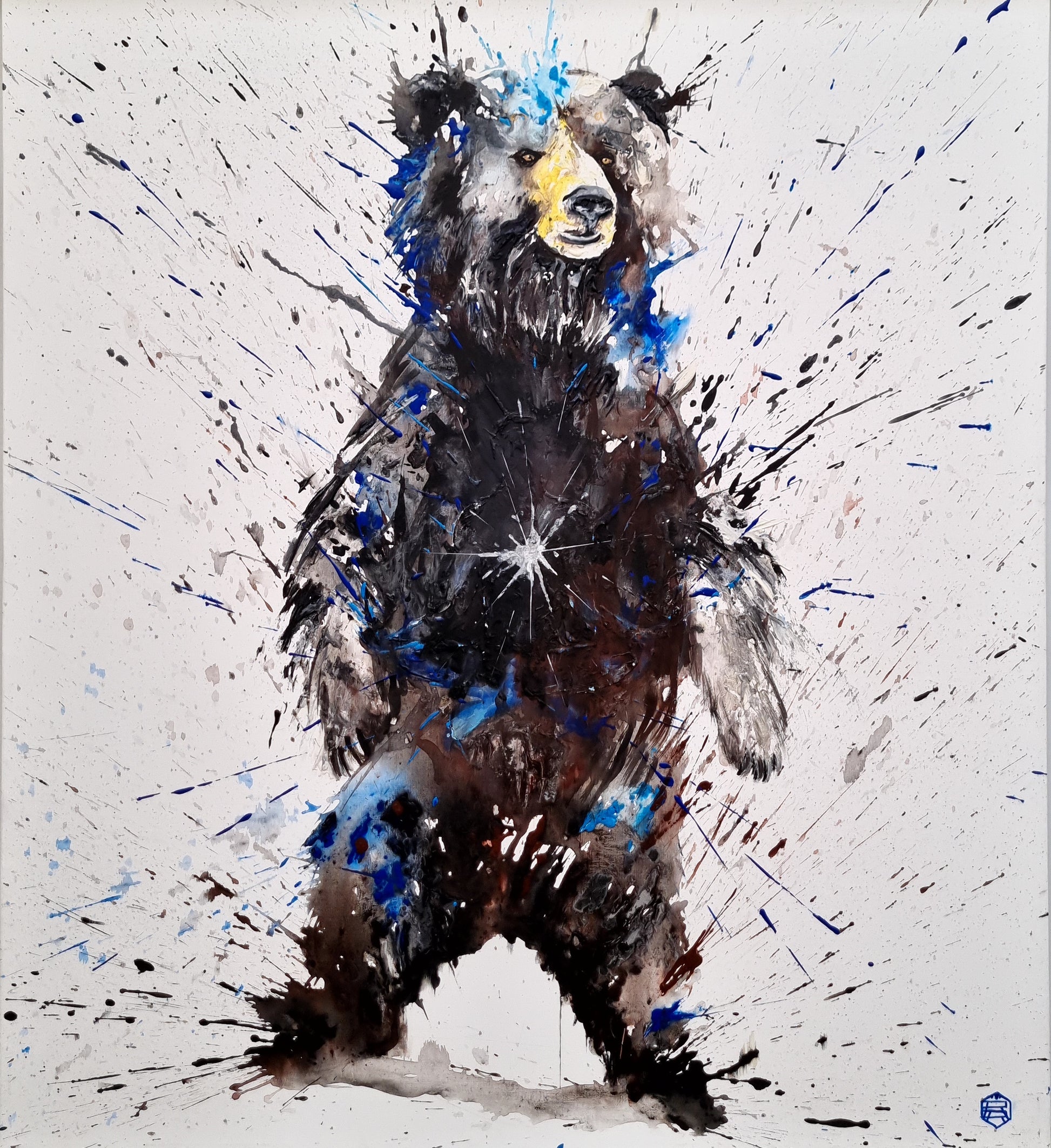 Con una paleta poderosa de negros y tonos azules, la pintura evoca tanto la serenidad como la energía indomable del oso, invitando a quien la contemple a encontrar su propio equilibrio entre lo salvaje y lo espiritual.