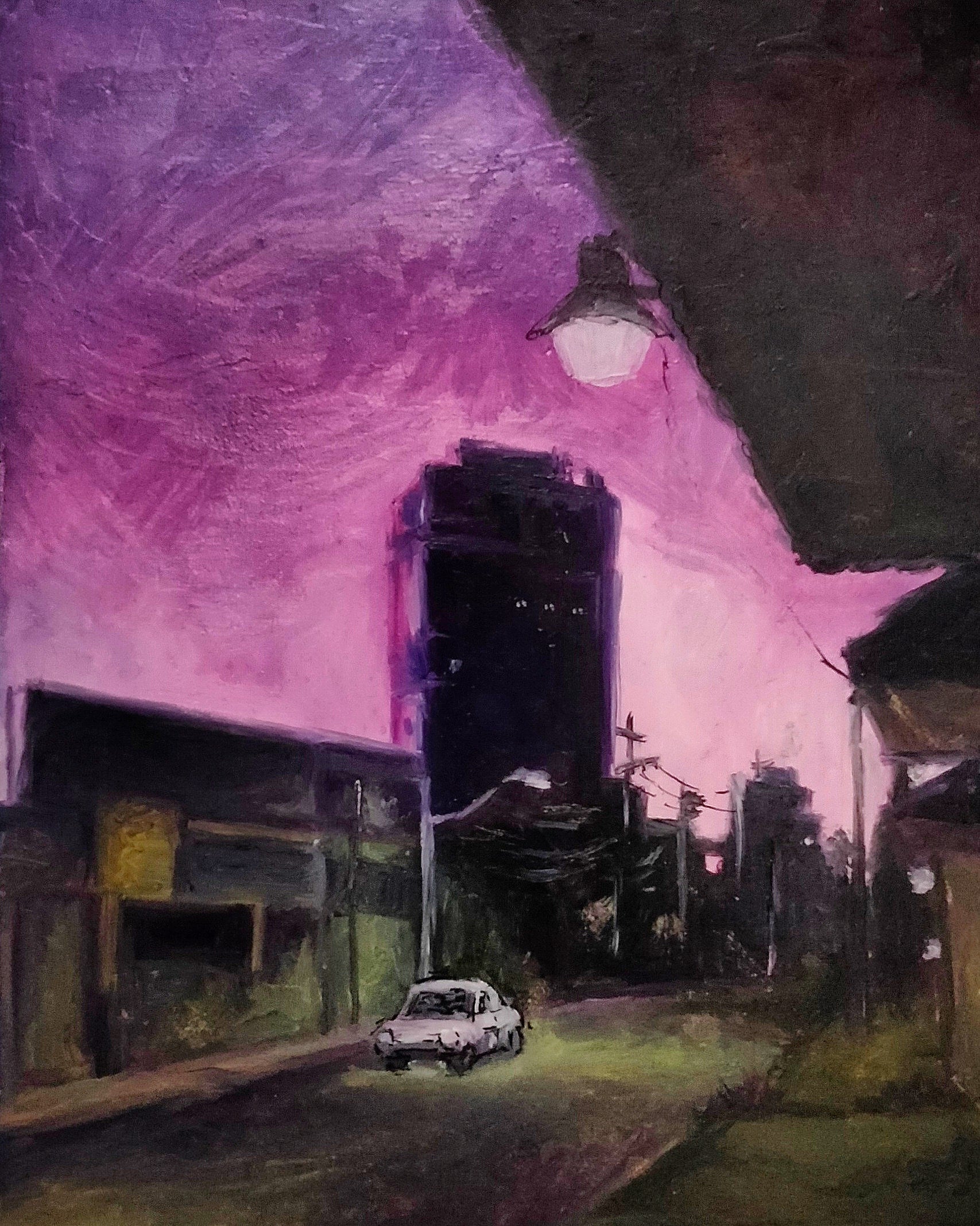 Primera parte de la serie Memorias en camino, Lindavista. Una serie de paisajismo al óleo de las diferentes ciudades y estancias que han acompañado a la joven artista en su camino siendo cada pieza el registro de un lugar con significado y peso en el nacimiento de una idea.