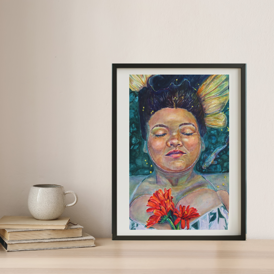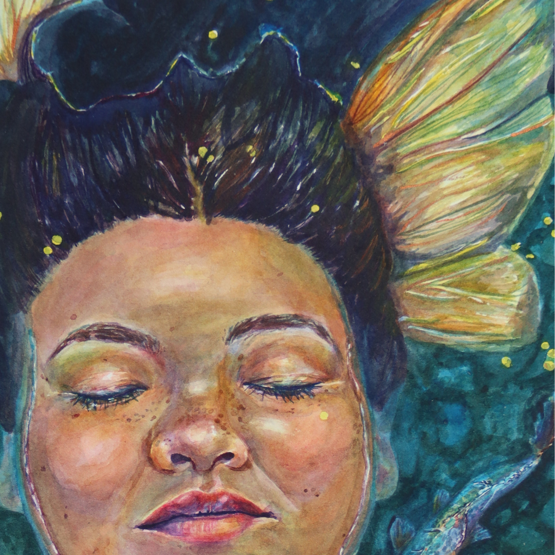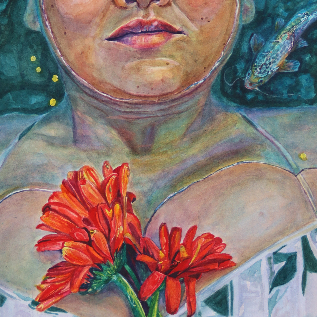 Este cuadro es un capricho de obsesión por las transparencias del mar, inspirado en la Ofelia de J. Millais. La amante de Hamlet que sufre un “colapso” cuando se entera de que su enamorado a matado a su padre, se quita la vida, Millais retrata ese momento exacto, donde los pesados vestidos la hunden poco a poco, ¿Es el ahogamiento en agua una referencia al ahogamiento con el dolor de la traición?. Desde mi perspectiva este último suspiro, representa la paz de Ofelia, en ese limbo entre la vida y la muerte inminente, pero elegida. Para unos, Ofelia puede ser la representación de la tragedia femenina, víctima de los hombres que la rodean, para mí, Ofelia es símbolo de poder sobre sí misma, en esta transgresión a sus deseos, ha reclamado la posesión sobre su propio ser, la mujer destruida por dar amor a otros, como si eso no fuera una virtud. Y que de nuestro pecho de mujeres amantes broten las flores rojas, que justo cuando nuestros pesados vestidos nos hundan, retomemos el control y nos vayamos cantando.