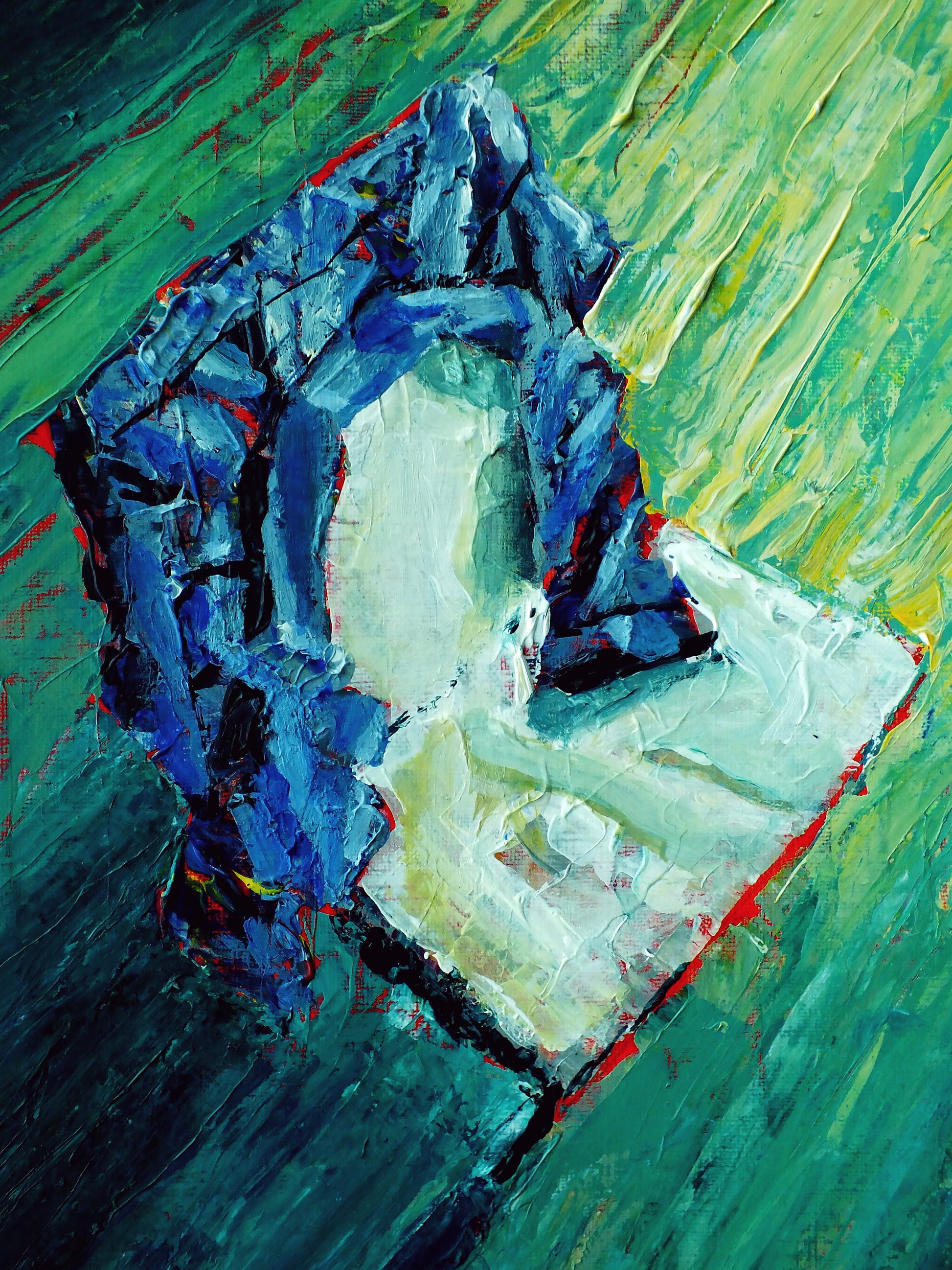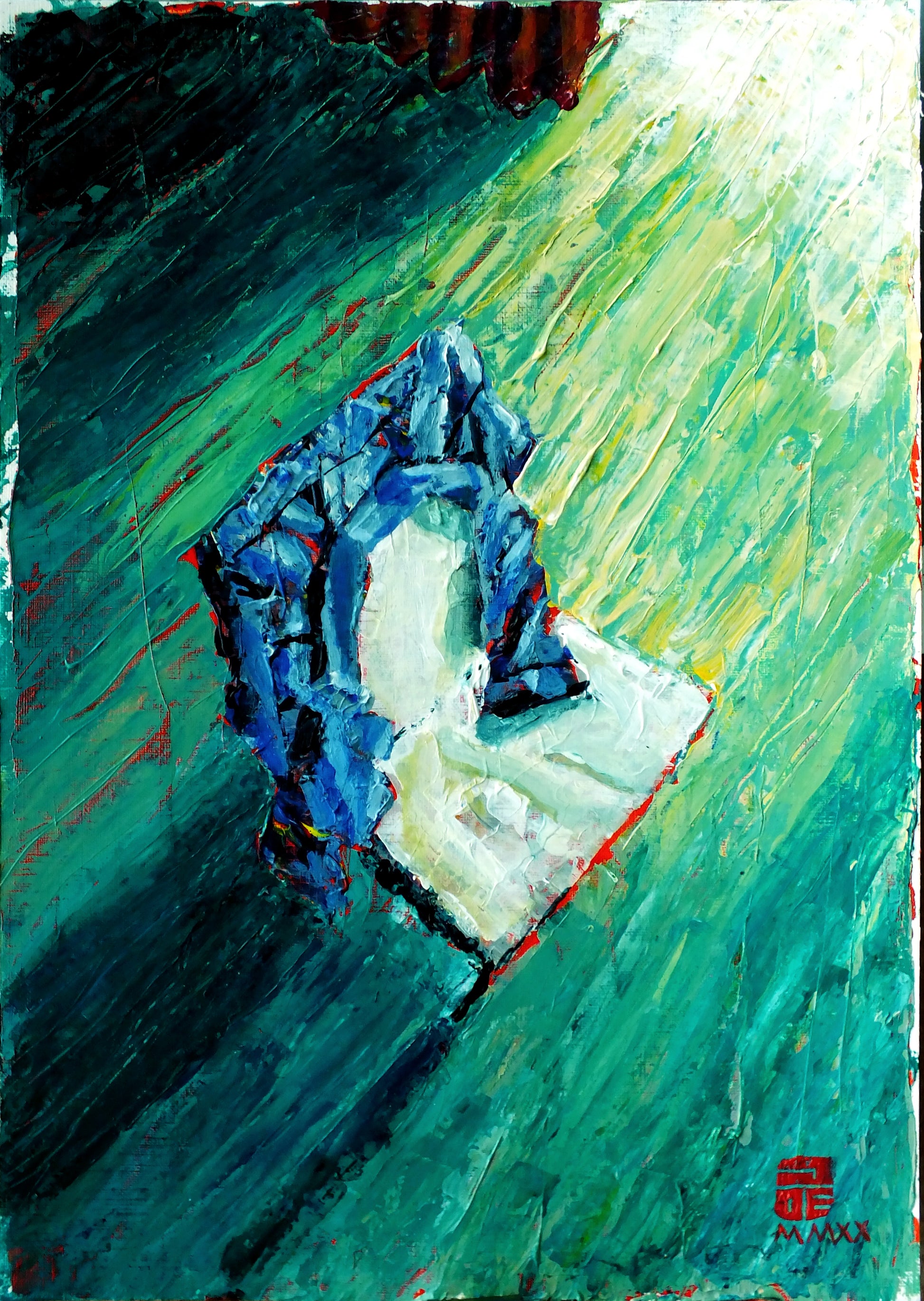 Inspirado por el cuadro de Vincent Van Gogh donde pintó sus viejas botas, yo quise ofrecer una vista íntima y reducida de mi estudio, donde el elemento protagónico sería mi camisa de mezclilla con la que pinto y dibujo y vivo. Una silla que me sirve de perchero es donde la camisa reposa mientras no la uso; fue extraño pintarla pues ya estoy muy acostumbrado a ella, ese día fue modelo de pintura al natural. Las cortinas apenas asomadas, el piso como elemento secundario que casi lo abarca todo, la silla y la camisa por encima de todo y todo en una composición diagonal. La luz del estudio hizo el resto del trabajo.