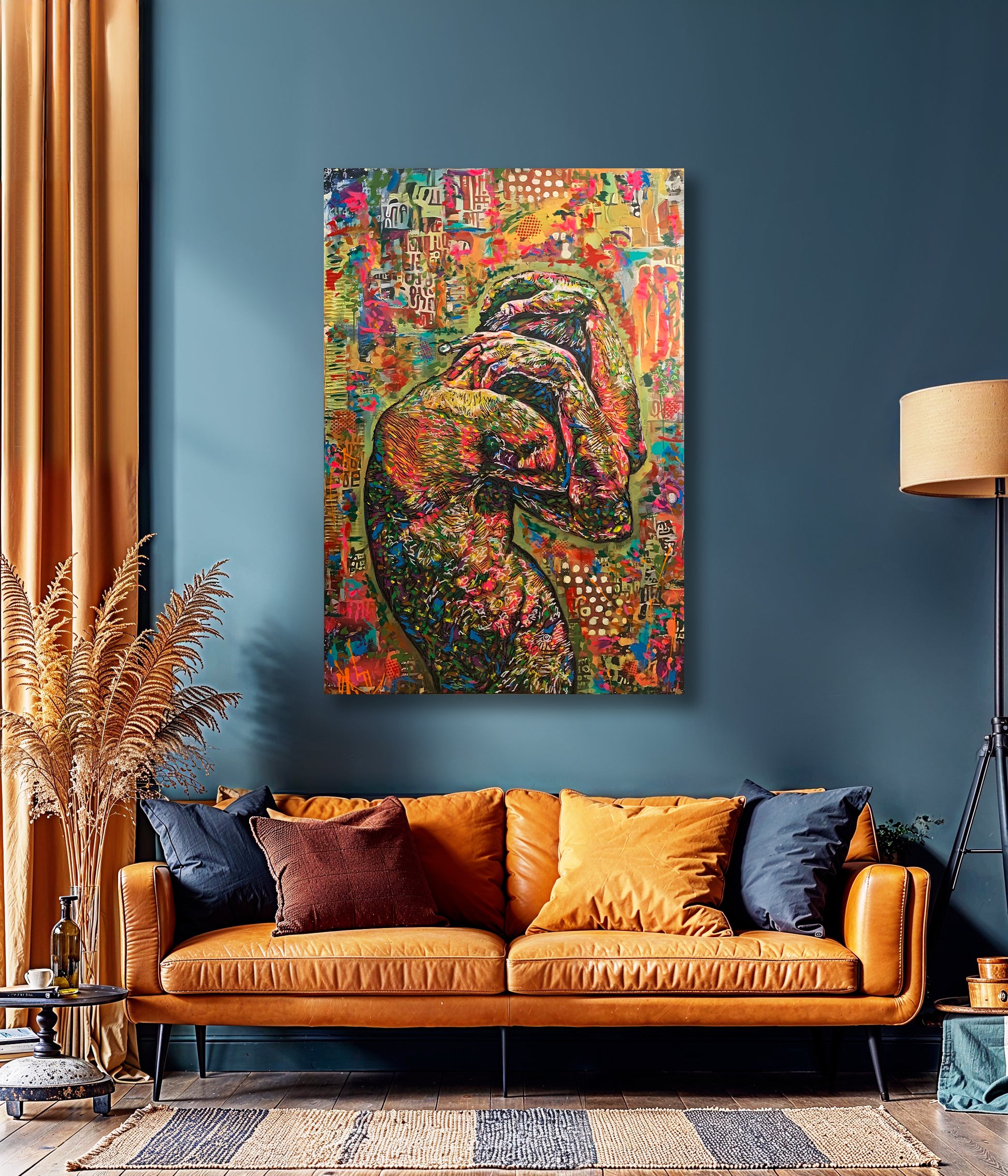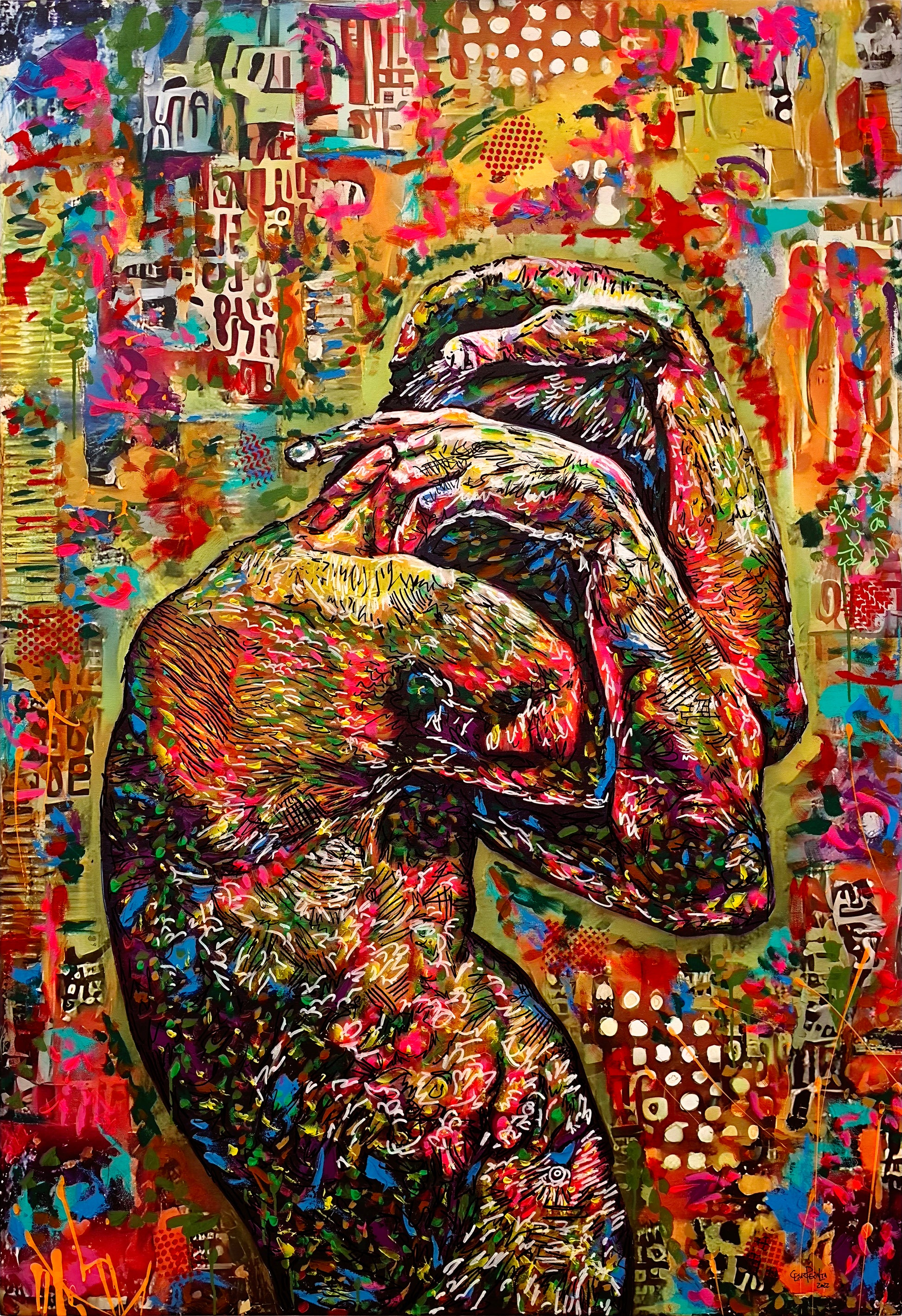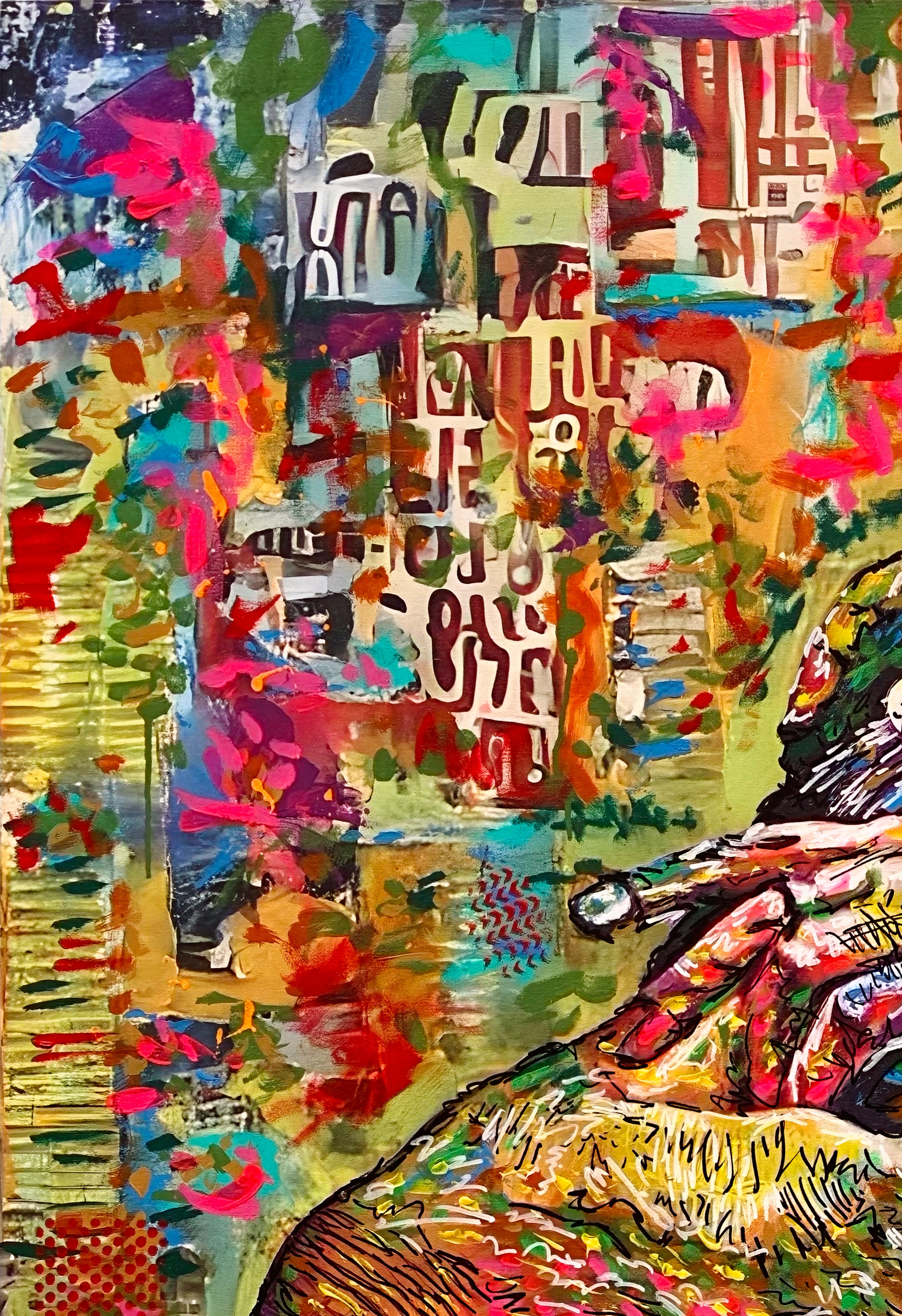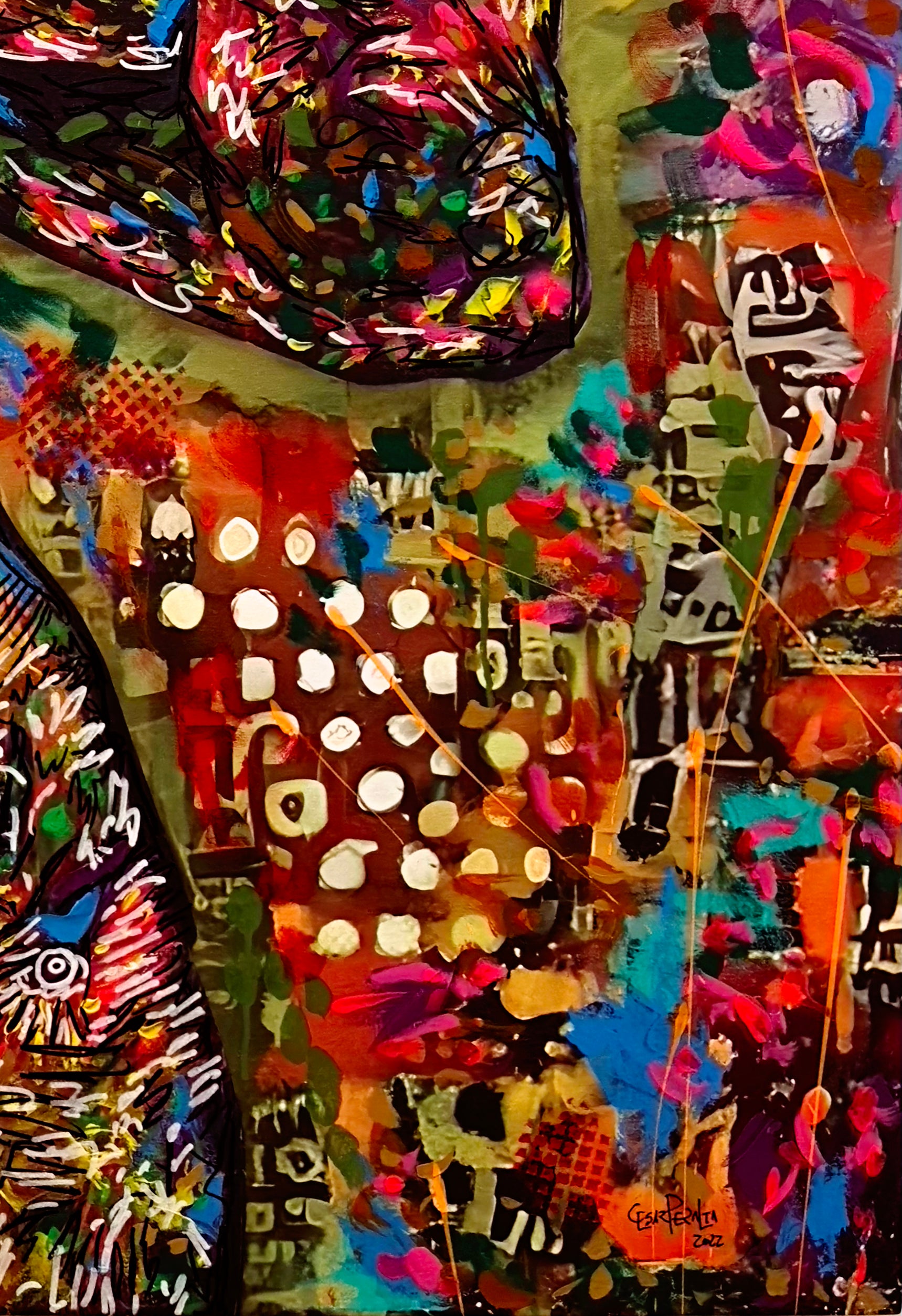 Esta obra es parte de mis trabajos de arte híbrido, una fusión de arte digital con arte tradicional, en este caso pintura. Esta obra lleva tres procesos: la ilustración digital impresa sobre lienzo, la cual despues se monta sobre bastidor de madera y me la llevo a mi taller donde hago la intervención con pintura acrílica. Finalmente realizo una animación digital la cual puedes ver a través de tu telefono o tablet como realidad aumentada.
