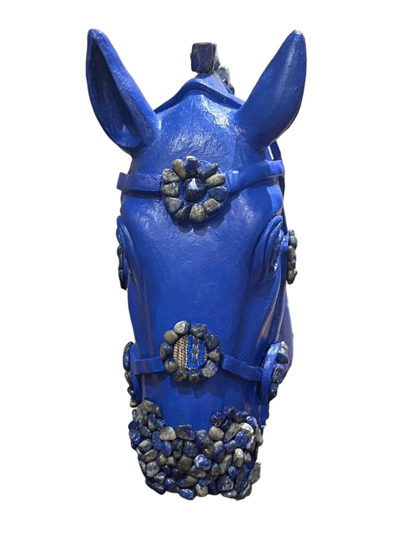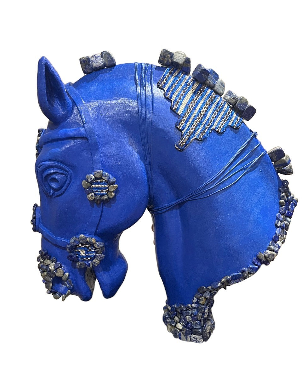 Arcilla e intervenida con acrílico azul, tejidos, cuerda y piedras Lapis Lazuli