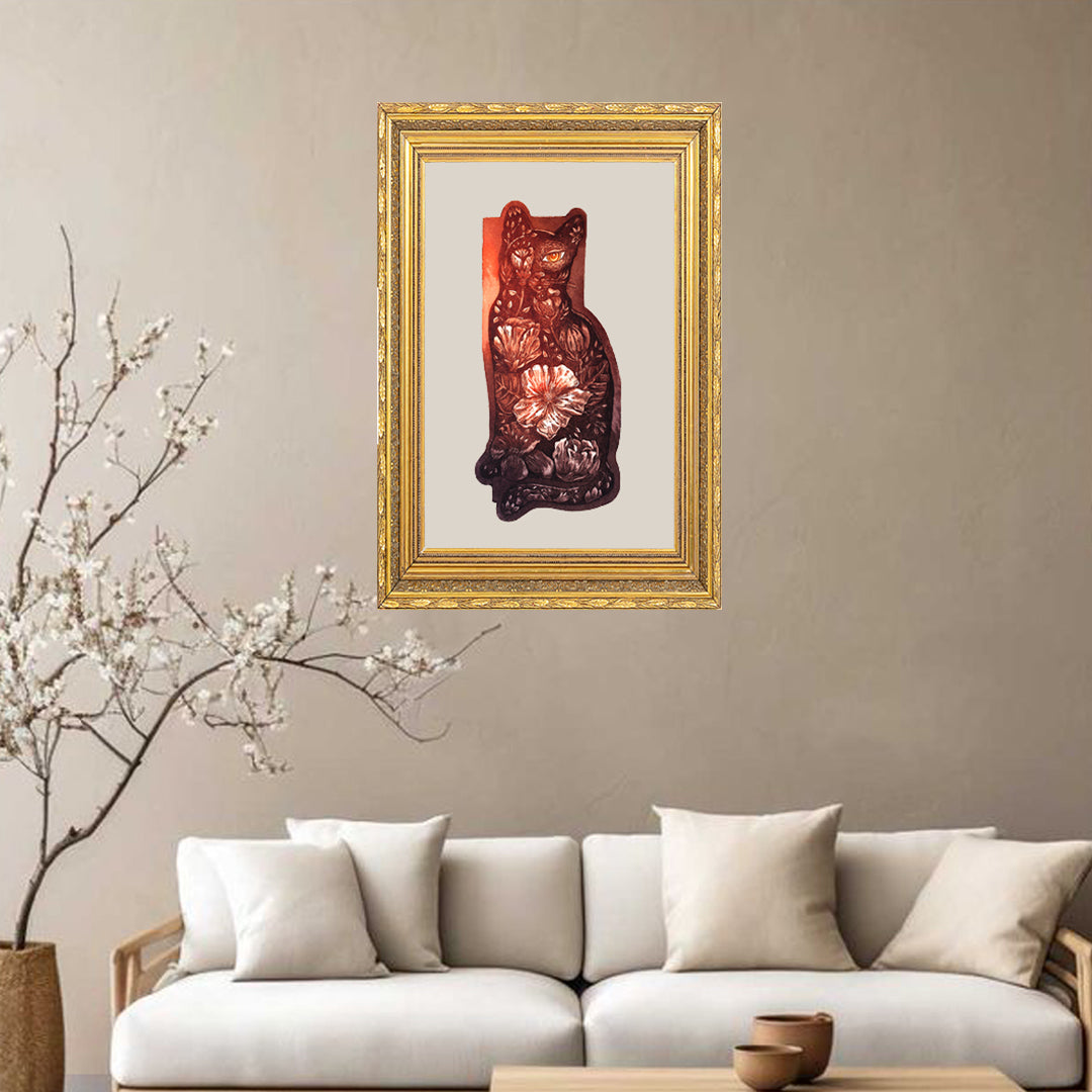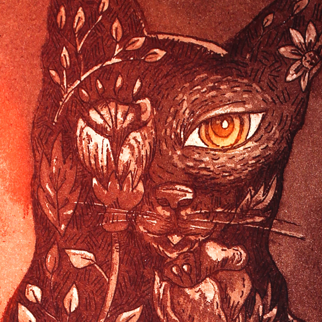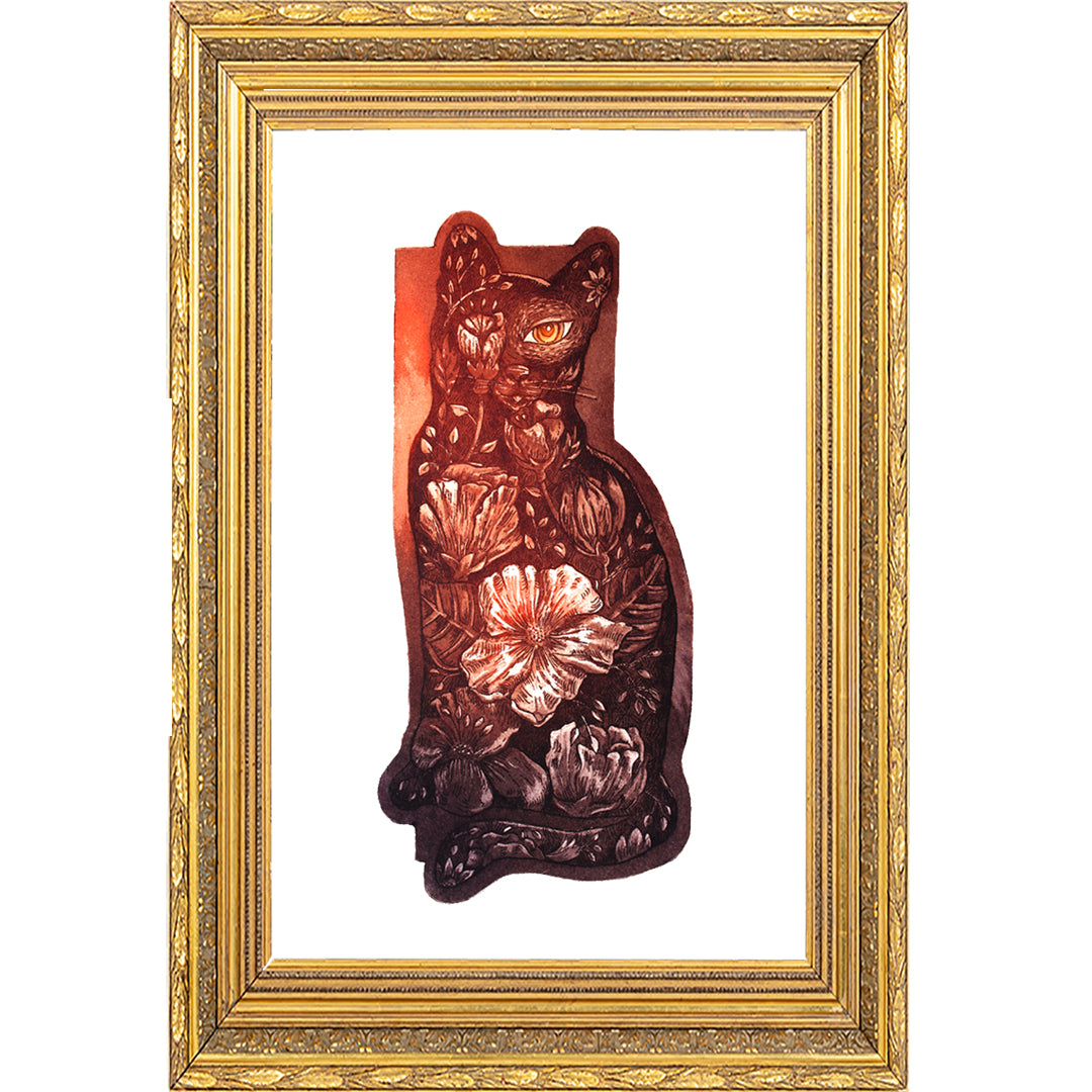 Obra realizada en 2024. De la serie "Resurrección Animal". Representa poéticamente como veo a los gatos, desde su interior, frágil y salvaje como las flores.