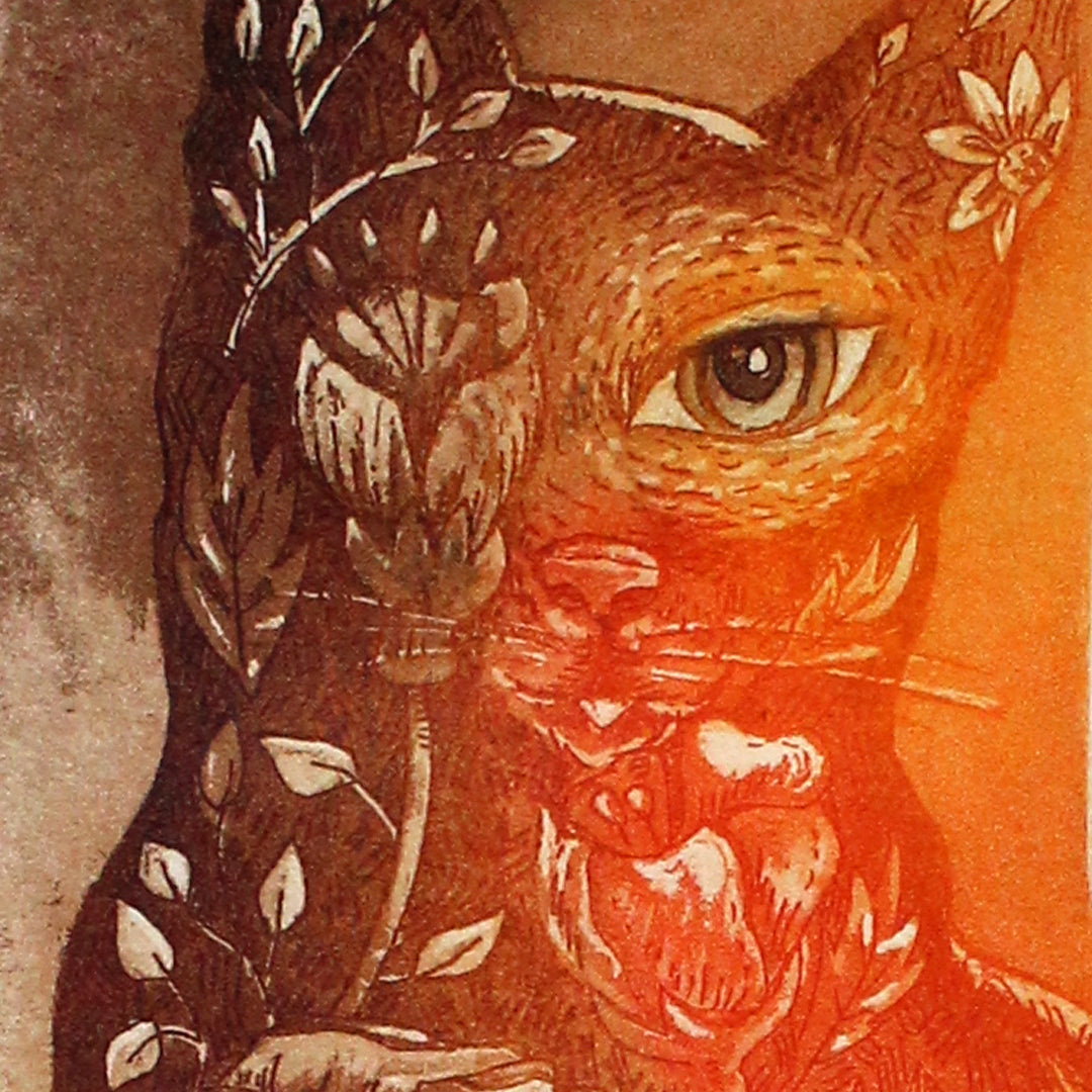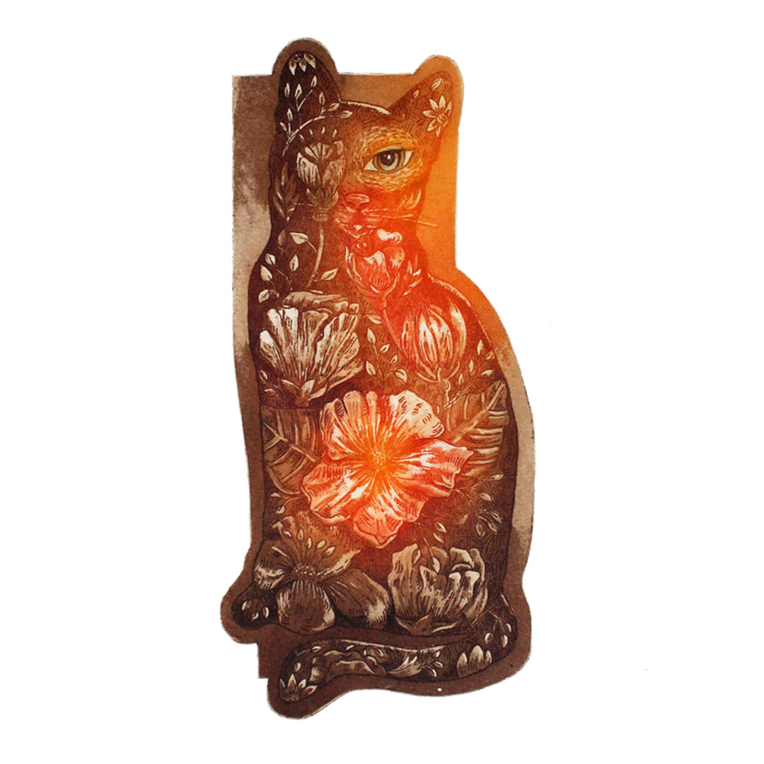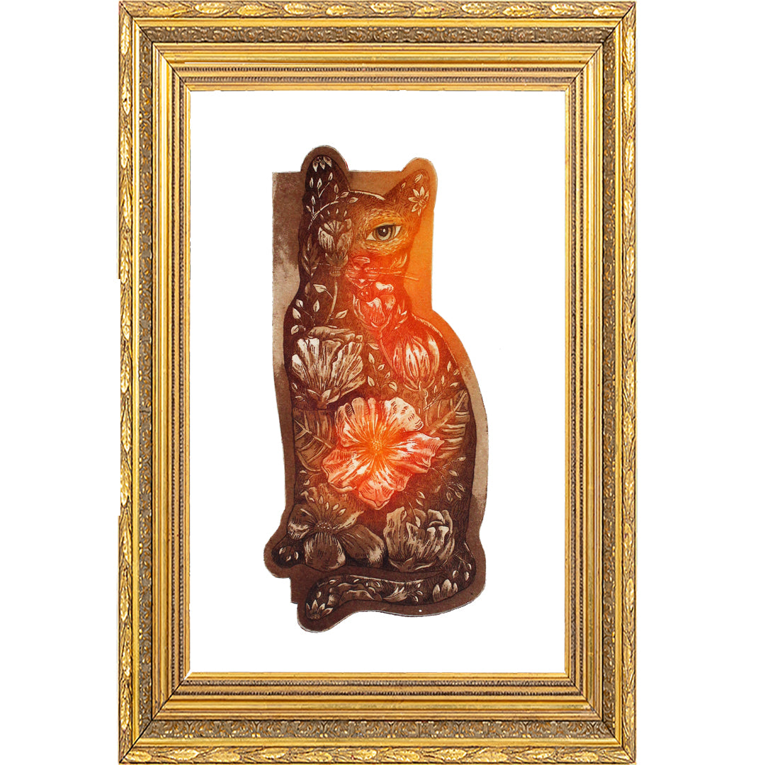 Obra realizada en 2024. De la serie "Resurrección Animal". Representa poéticamente como veo a los gatos, desde su interior, frágil y salvaje como las flores.