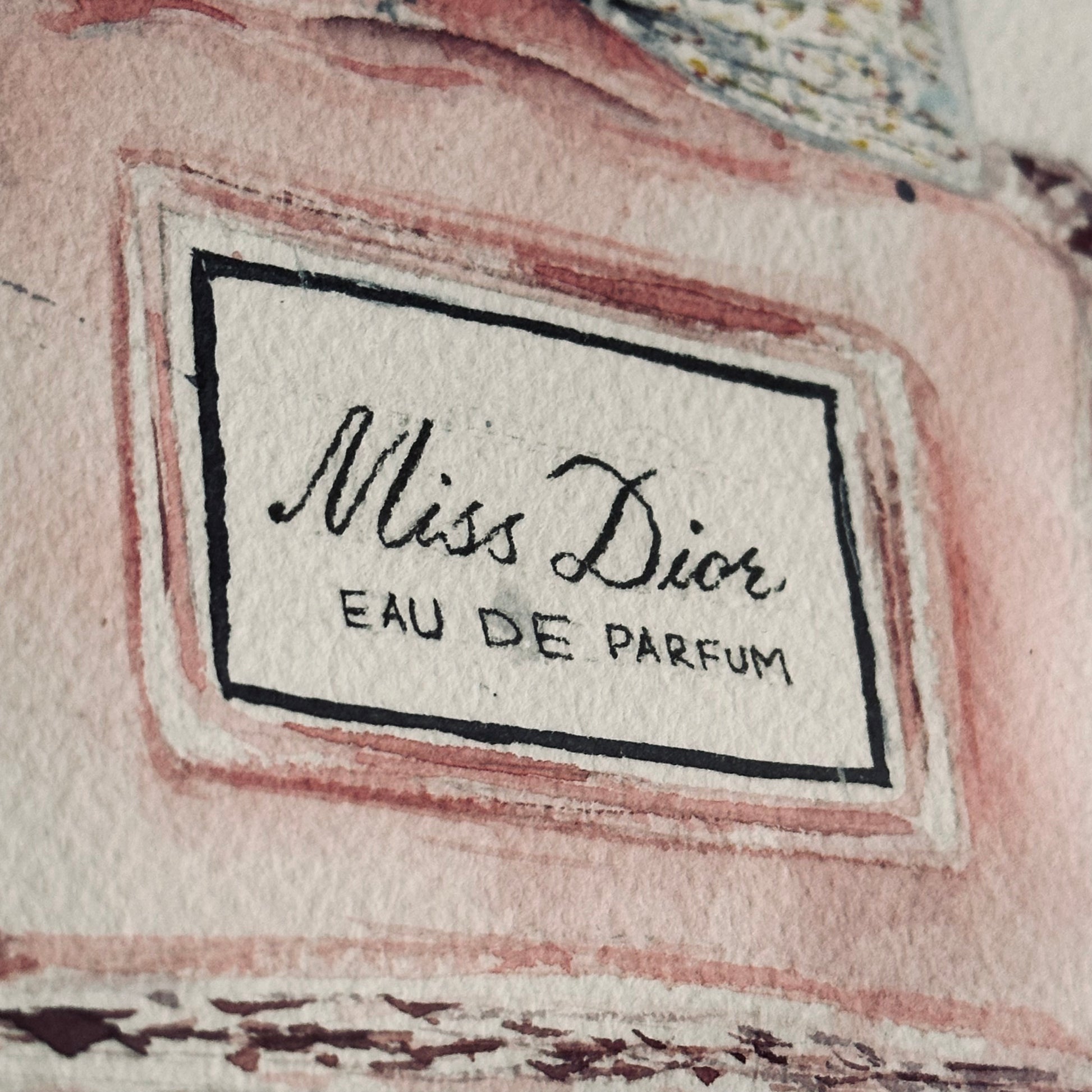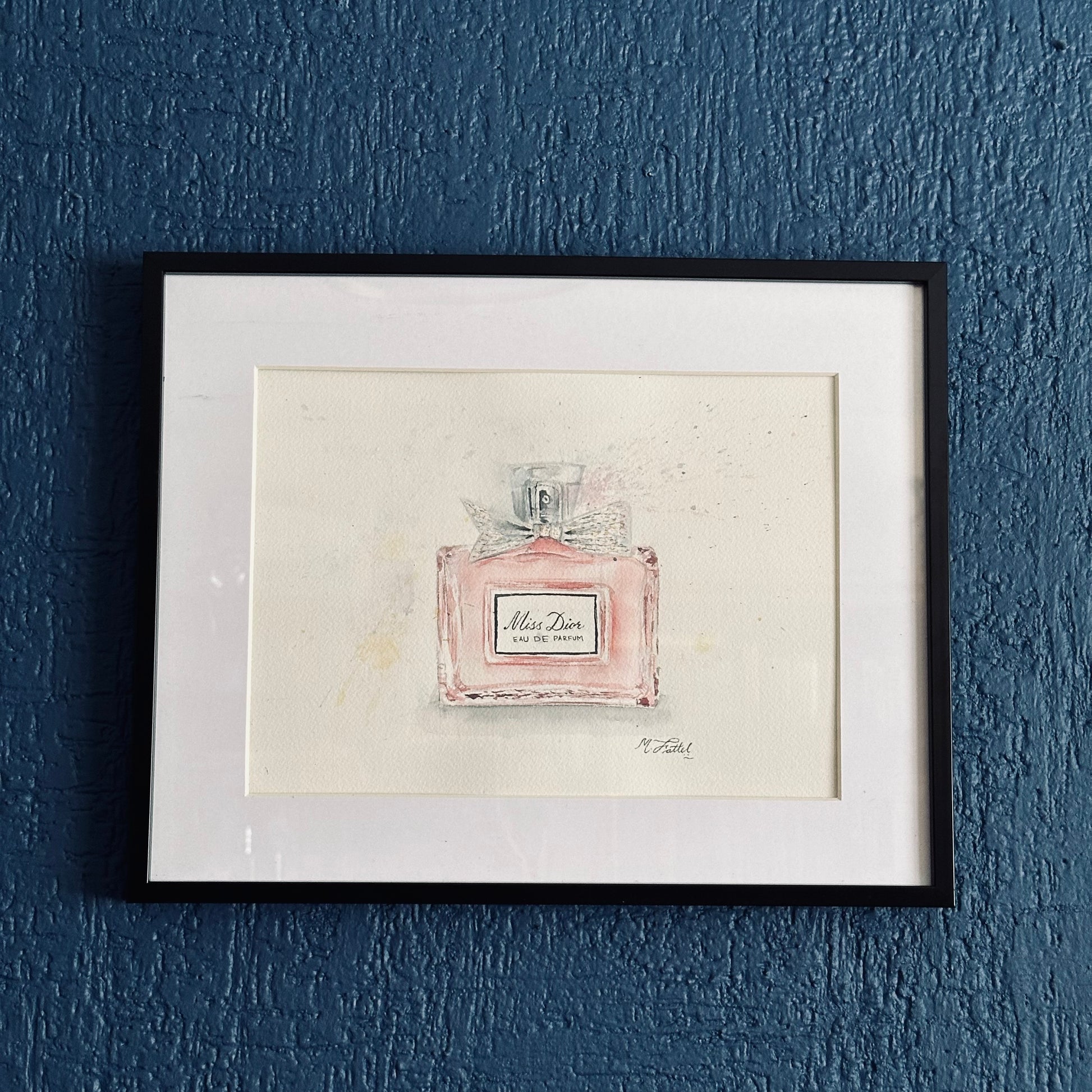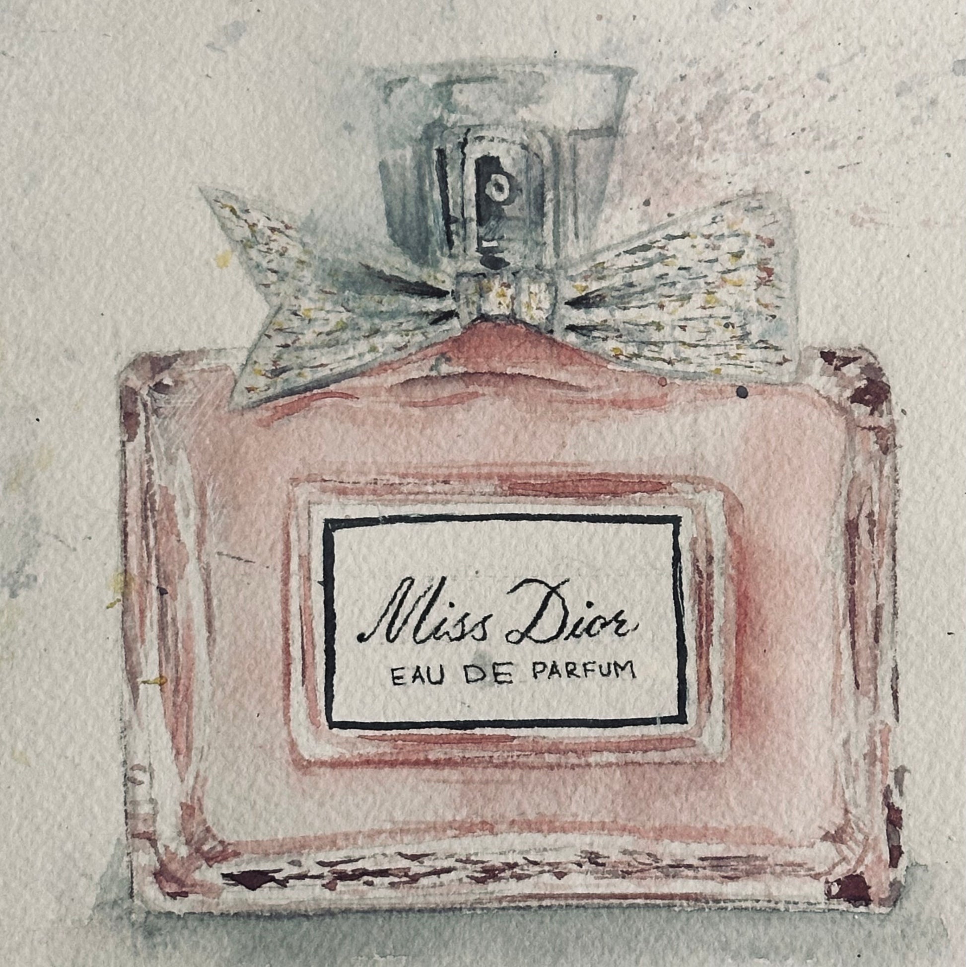 Esta obra es una representación gráfica en acuarela del perfume Miss Dior. Esta es una de las botellas mas bonitas del mundo de la perfumería, por lo que quise retratar su belleza en este cuadro. Para darle un aspecto más dinámico, incluí salpicaduras de varios colores, que representan las diferentes notas del perfume saliendo del envase y llenando con su aroma la habitación. Excelente para entusiastas y personas que aman los perfumes o el medio de la moda.