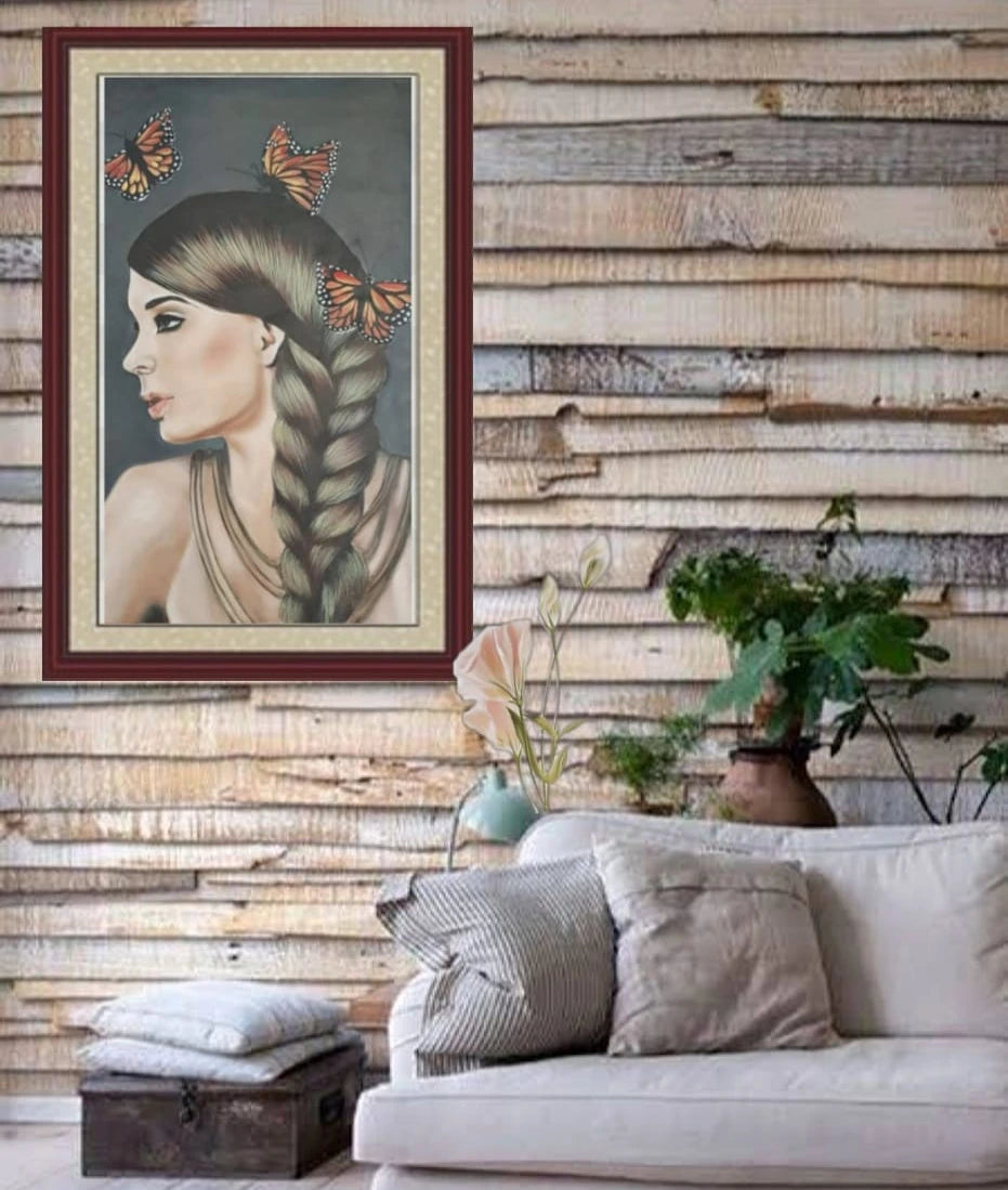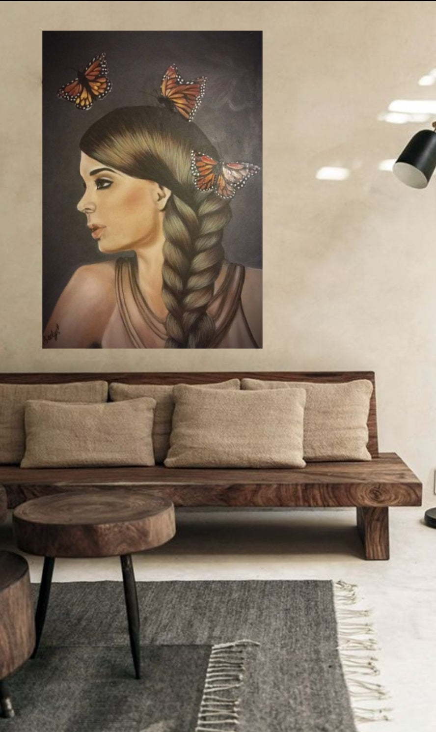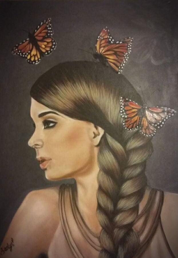 Rostro de mujer de perfil con trenza y mariposas monarca al rededor.