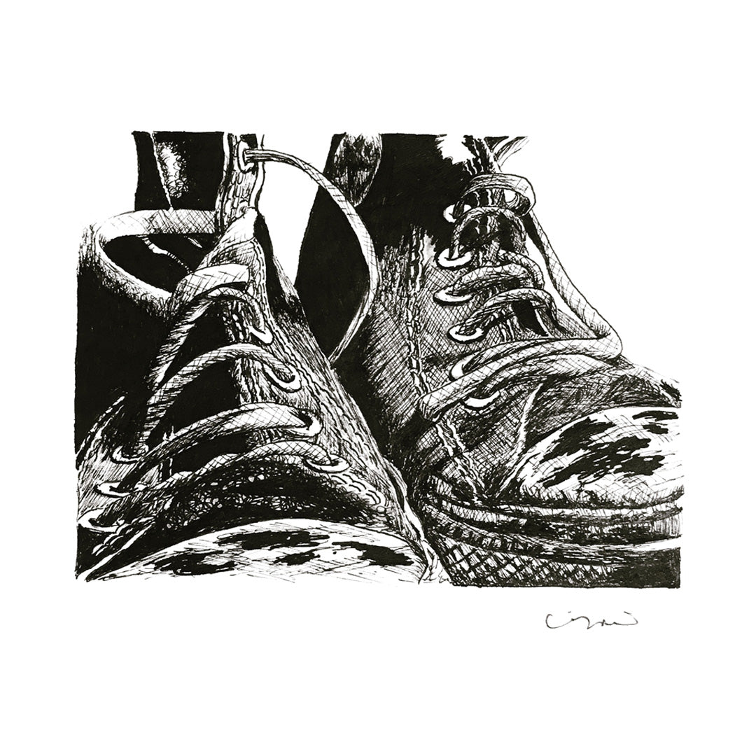 Ilustración realista de tenis Converse gastados y sucios. Realizada con estilógrafos con técnica de scribble o garabatos. Lista para enmarcar.