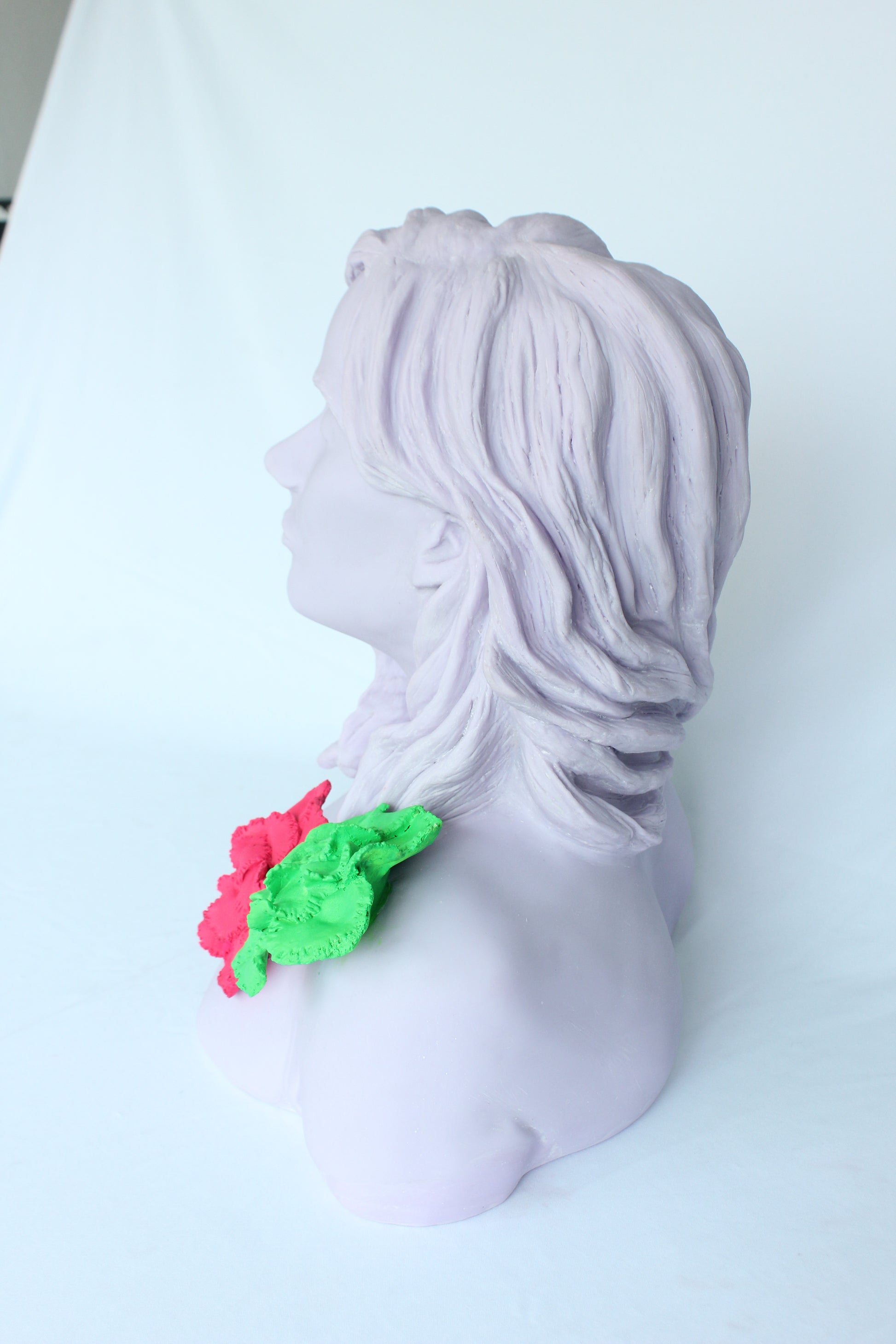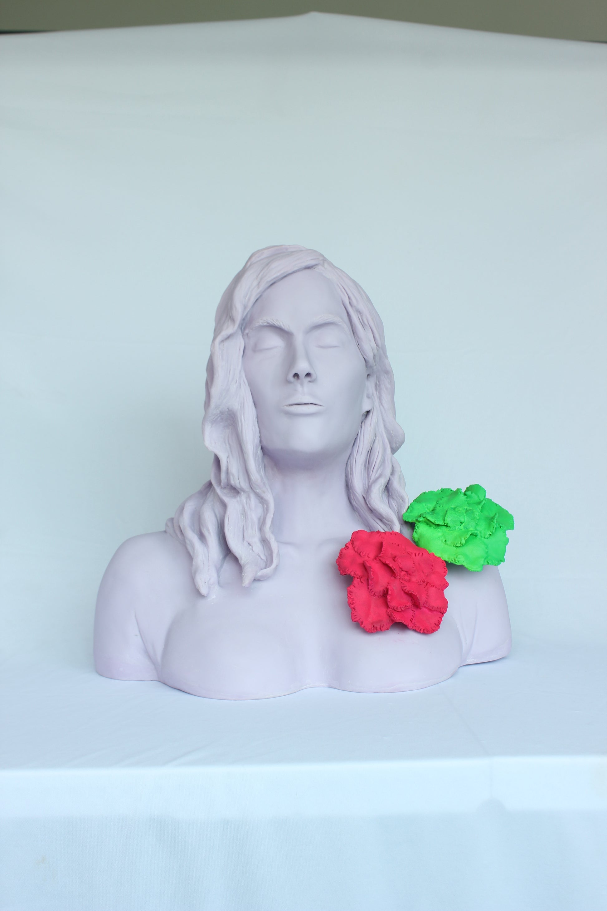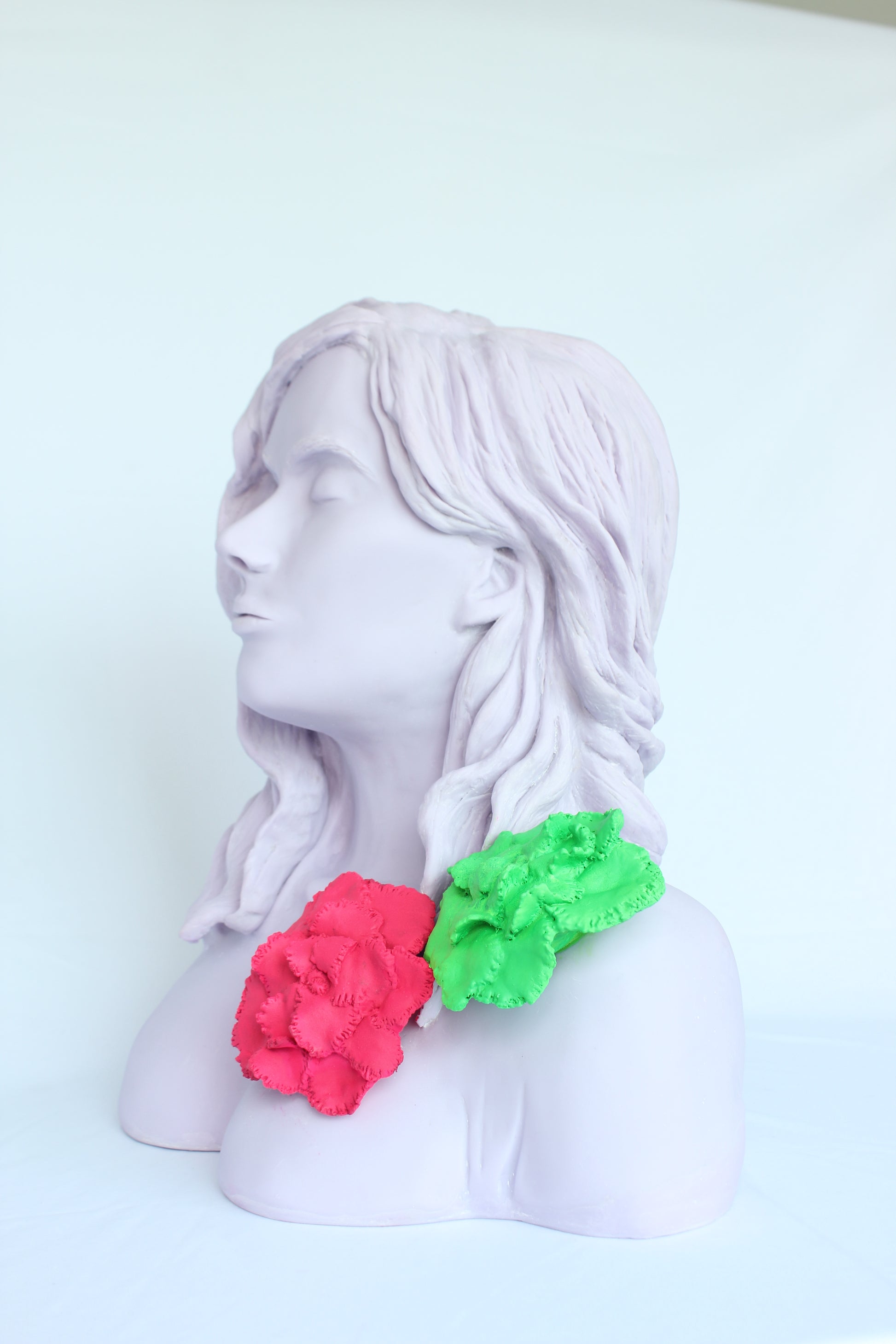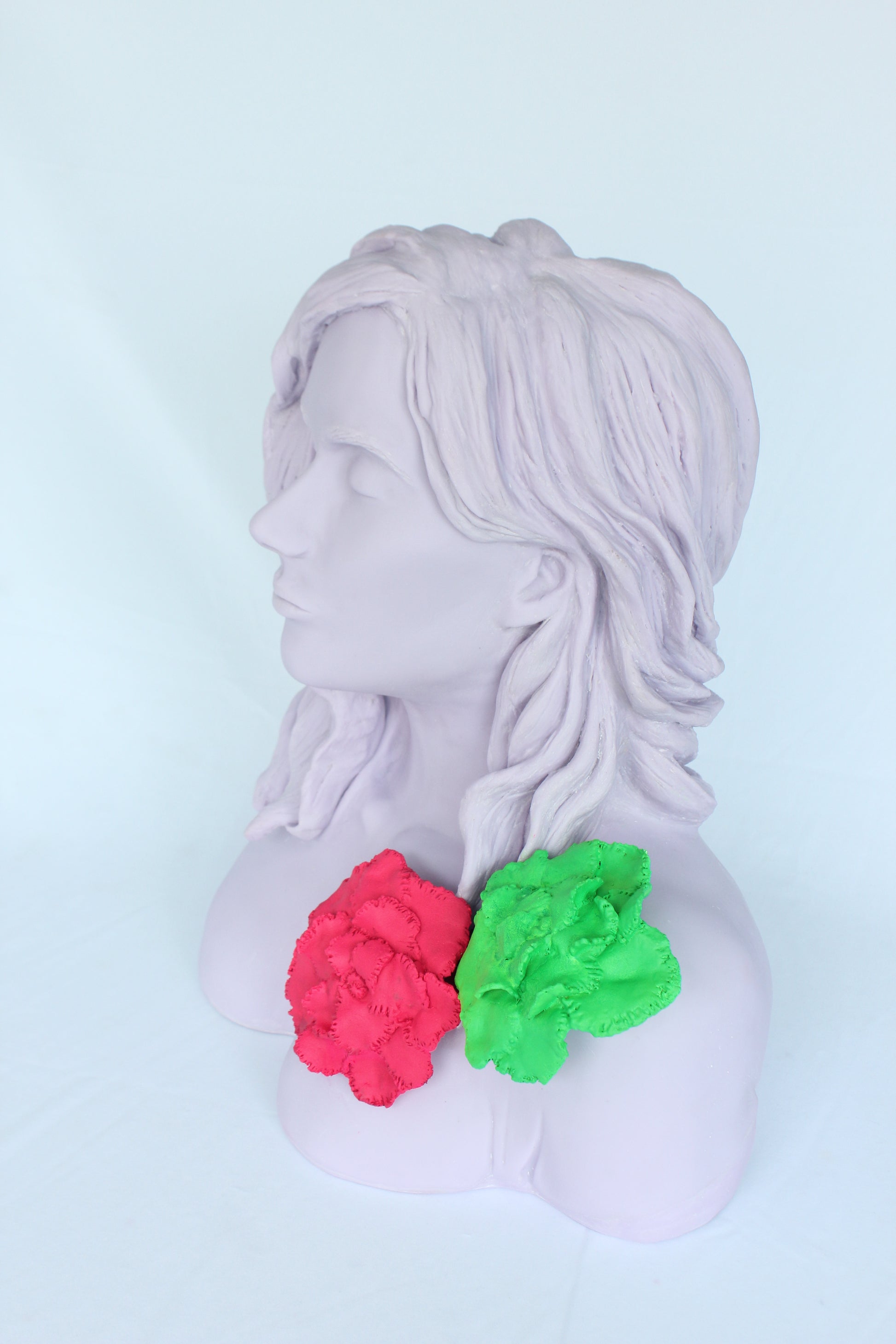Mujer Mexicana es una impactante escultura creada por Celeste Bejarano, elaborada en resina epóxica. Esta obra explora la feminidad no solo como una identidad, sino como un poderoso agente de transformación social. En su creación, los tonos violetas predominan, simbolizando el proceso introspectivo y el empoderamiento de la mujer al reconectarse con su feminidad. La obra sugiere un viaje interno, donde la figura femenina se reconstruye, mirándose a sí misma para encontrar la fuerza y la sabiduría necesarias para influir en su entorno. Celeste plasma en esta pieza la idea de que la verdadera transformación comienza desde adentro.