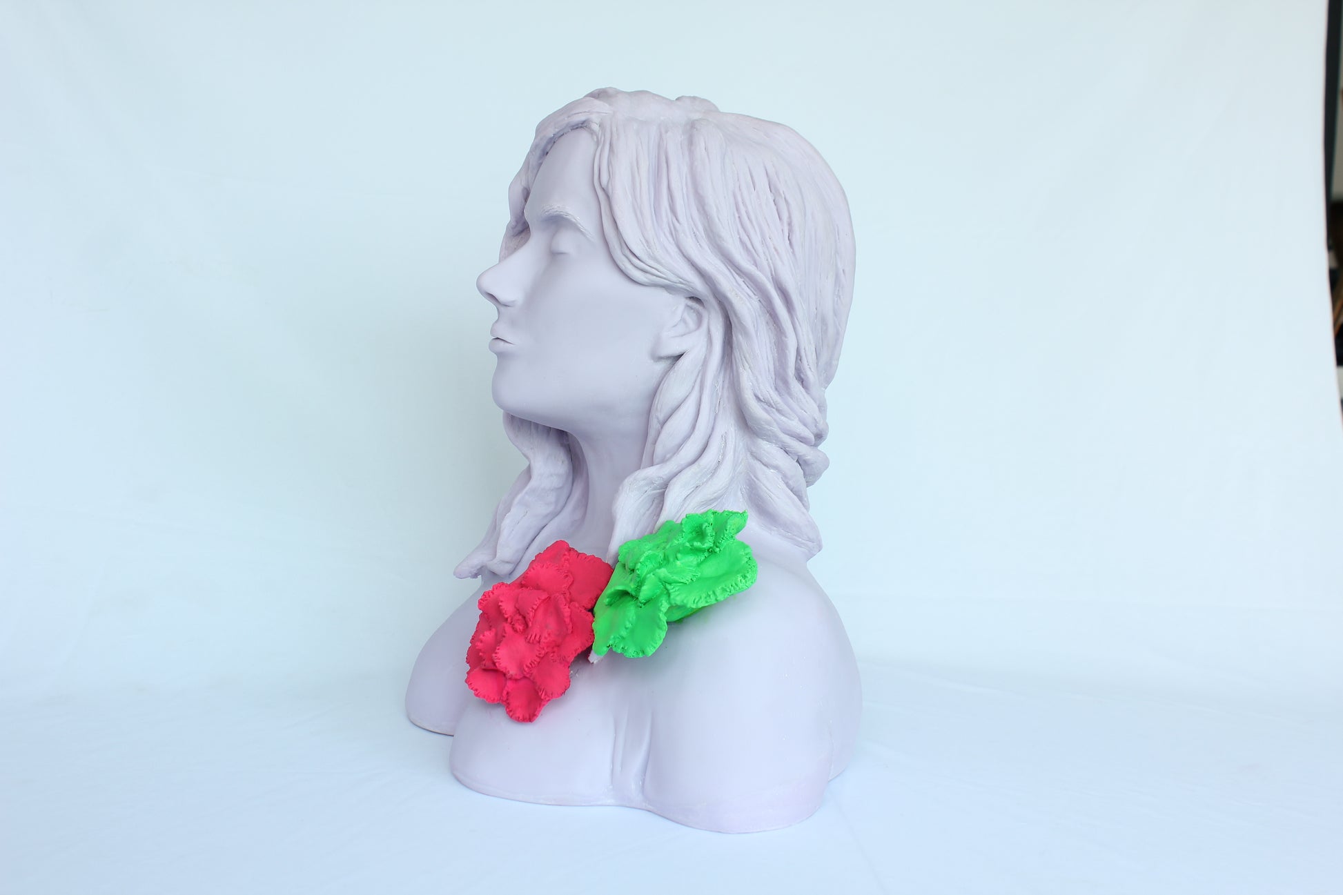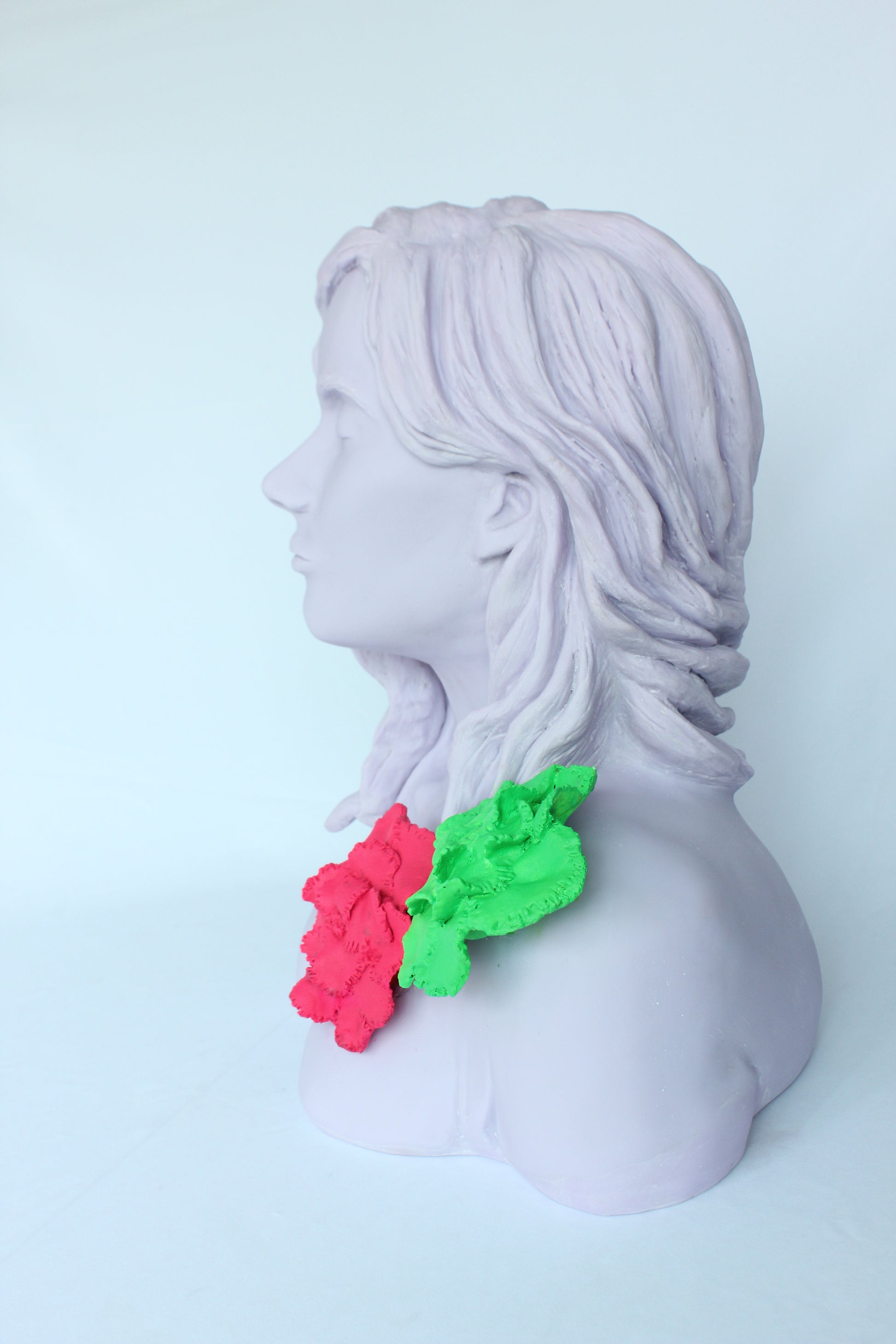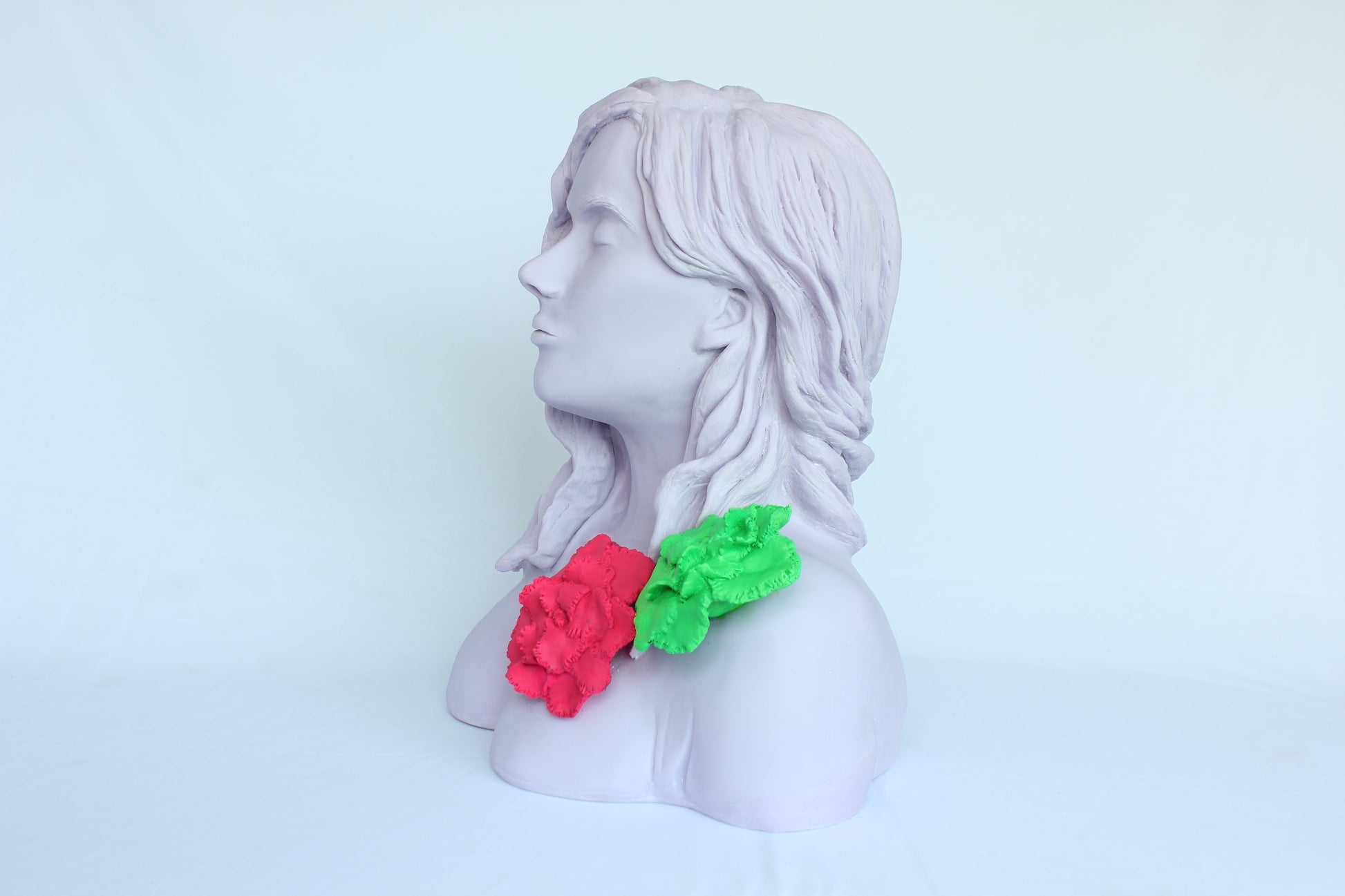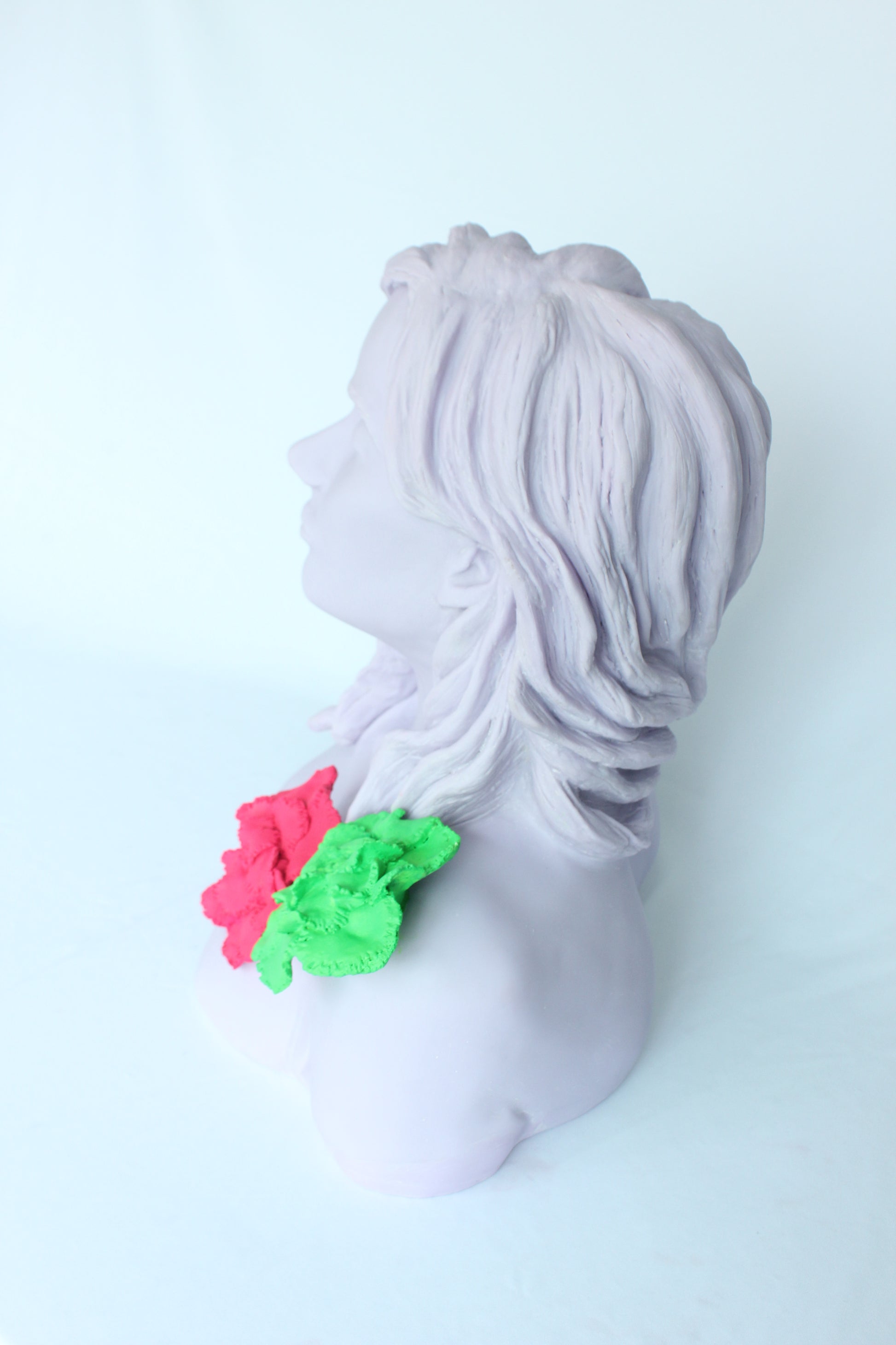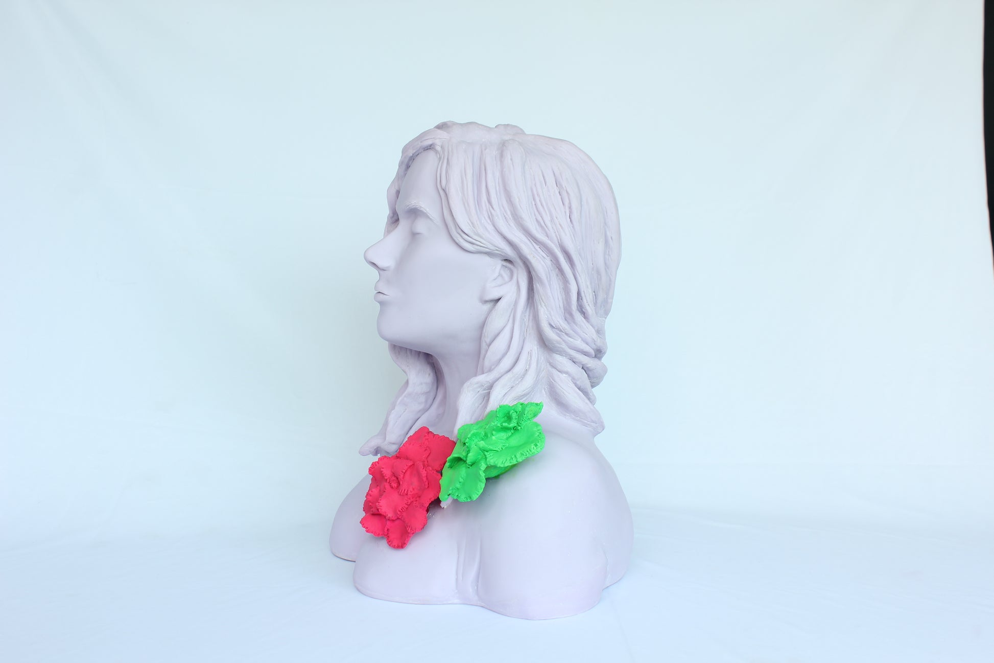 Mujer Mexicana es una impactante escultura creada por Celeste Bejarano, elaborada en resina epóxica. Esta obra explora la feminidad no solo como una identidad, sino como un poderoso agente de transformación social. En su creación, los tonos violetas predominan, simbolizando el proceso introspectivo y el empoderamiento de la mujer al reconectarse con su feminidad. La obra sugiere un viaje interno, donde la figura femenina se reconstruye, mirándose a sí misma para encontrar la fuerza y la sabiduría necesarias para influir en su entorno. Celeste plasma en esta pieza la idea de que la verdadera transformación comienza desde adentro.