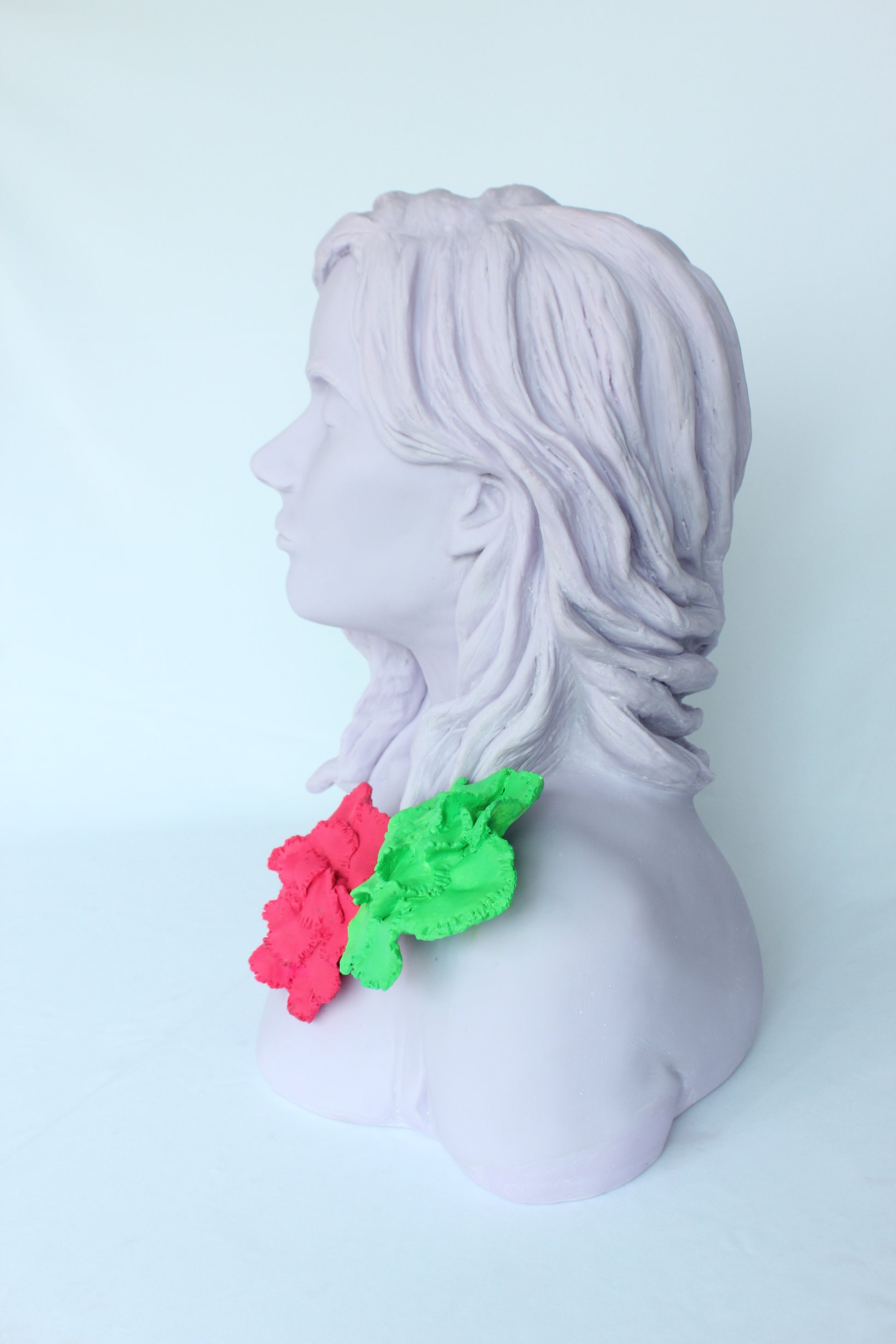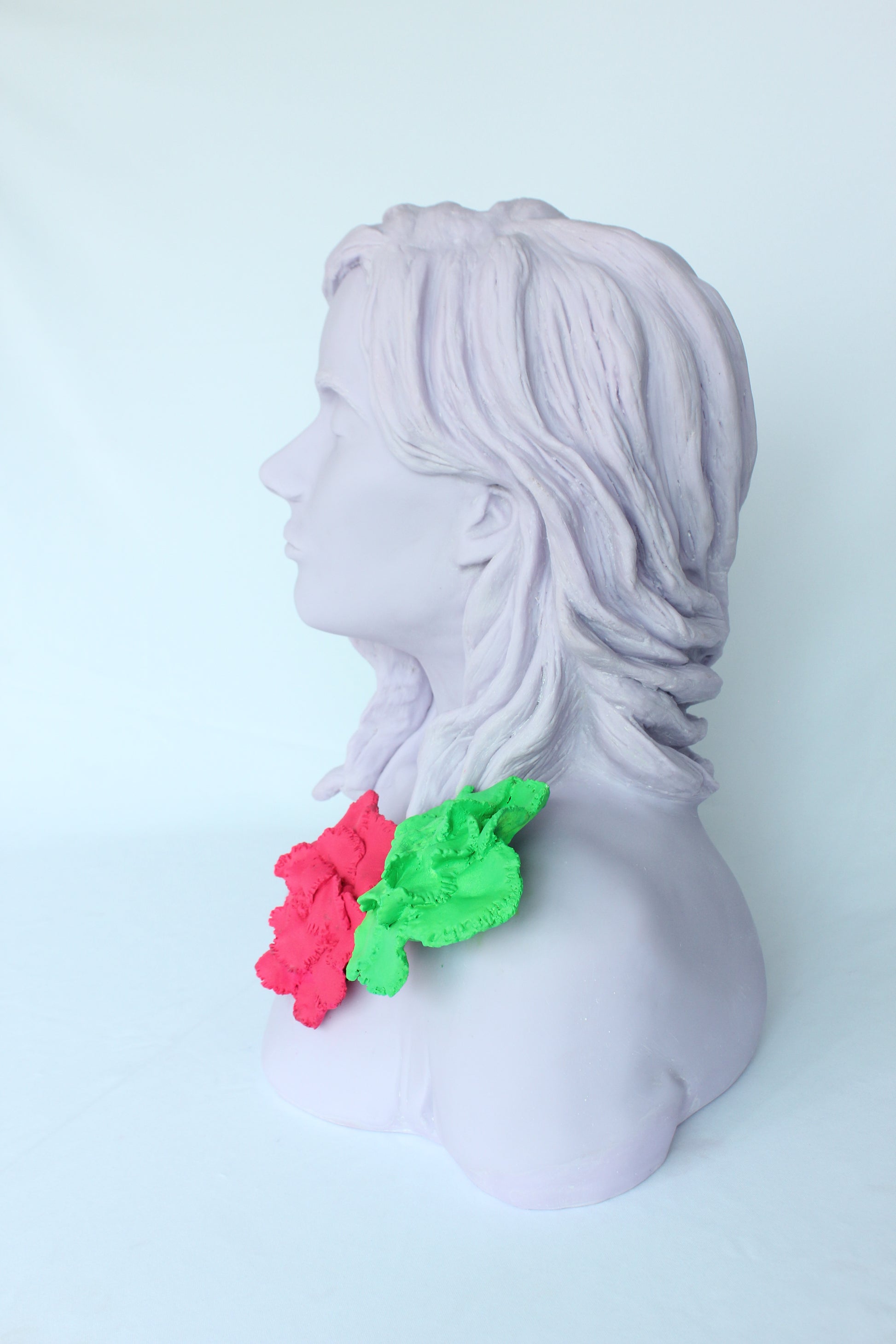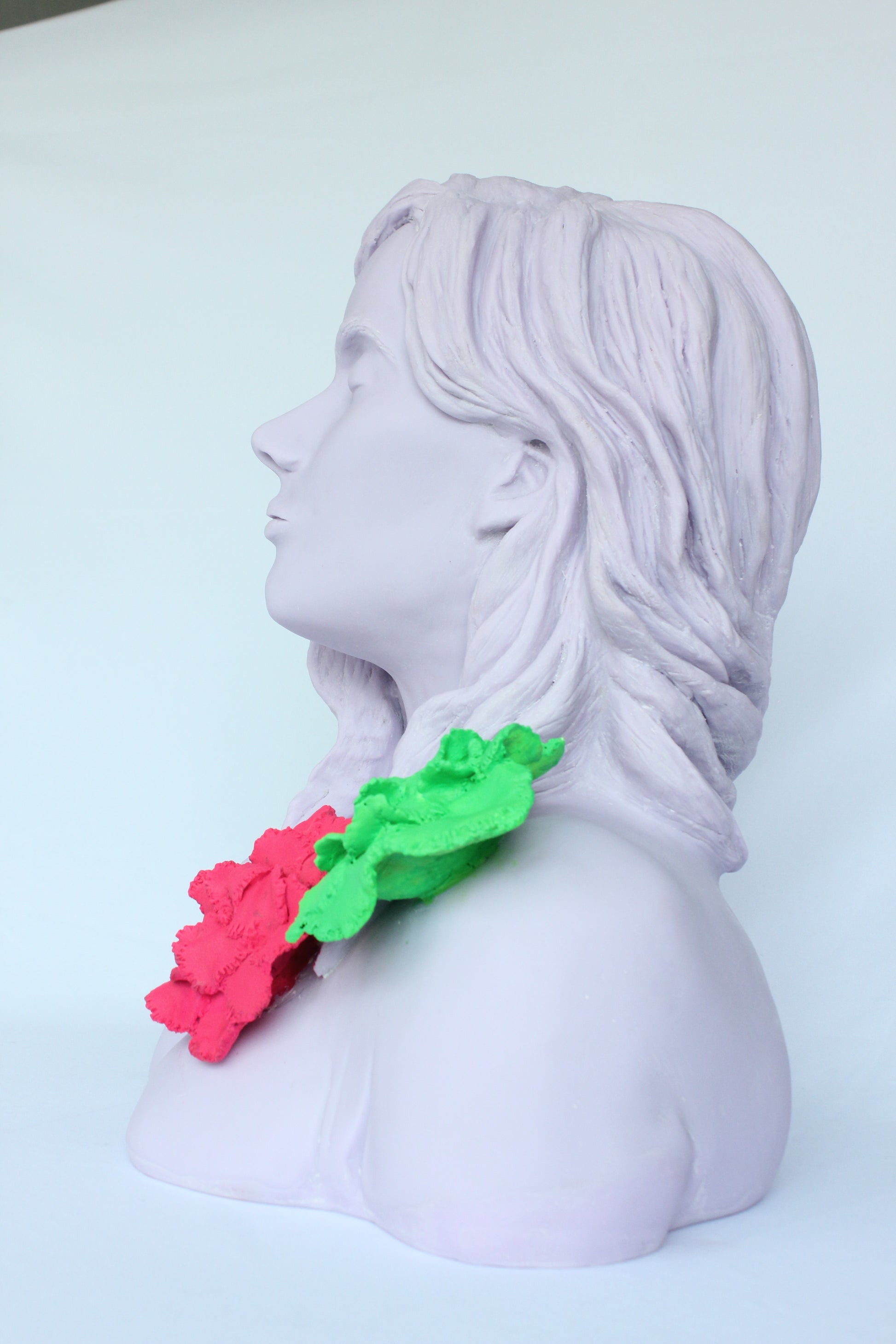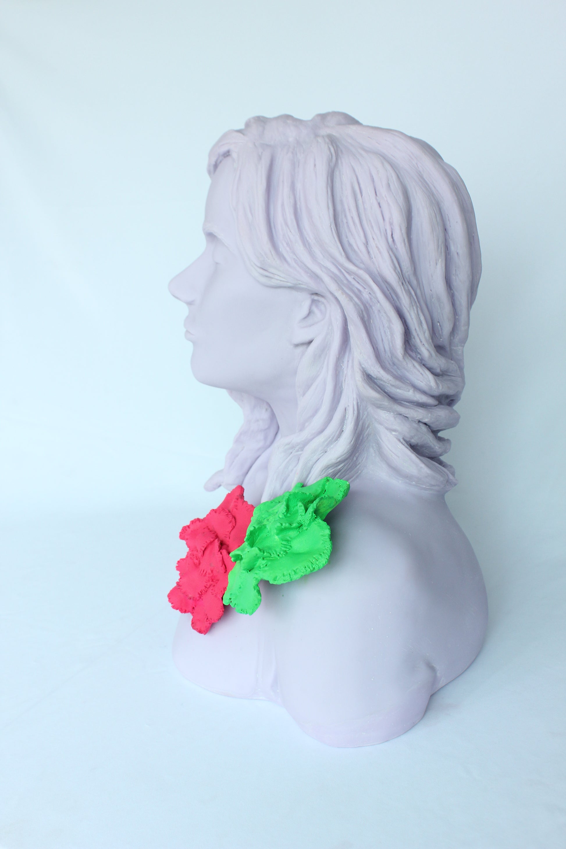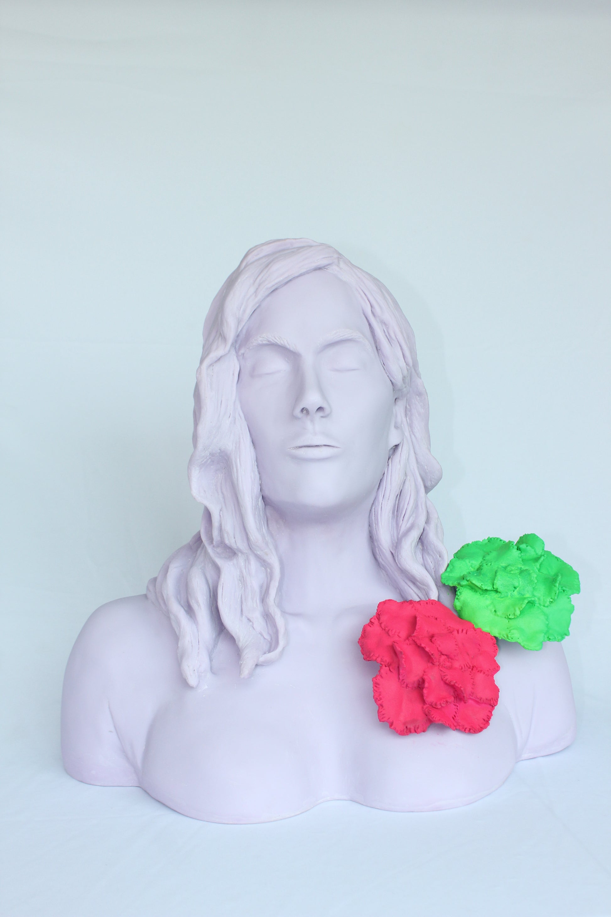 Mujer Mexicana es una impactante escultura creada por Celeste Bejarano, elaborada en resina epóxica. Esta obra explora la feminidad no solo como una identidad, sino como un poderoso agente de transformación social. En su creación, los tonos violetas predominan, simbolizando el proceso introspectivo y el empoderamiento de la mujer al reconectarse con su feminidad. La obra sugiere un viaje interno, donde la figura femenina se reconstruye, mirándose a sí misma para encontrar la fuerza y la sabiduría necesarias para influir en su entorno. Celeste plasma en esta pieza la idea de que la verdadera transformación comienza desde adentro.
