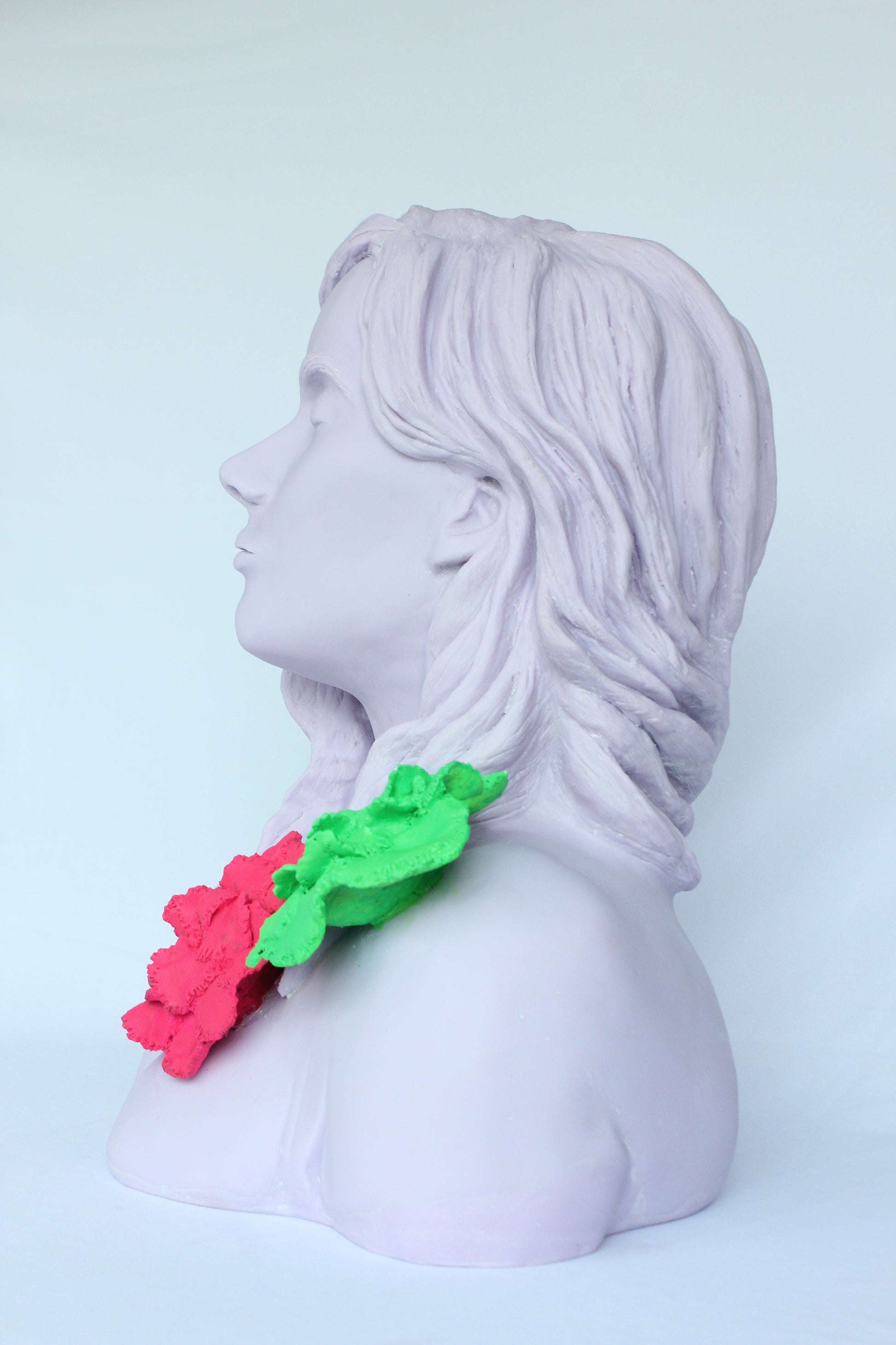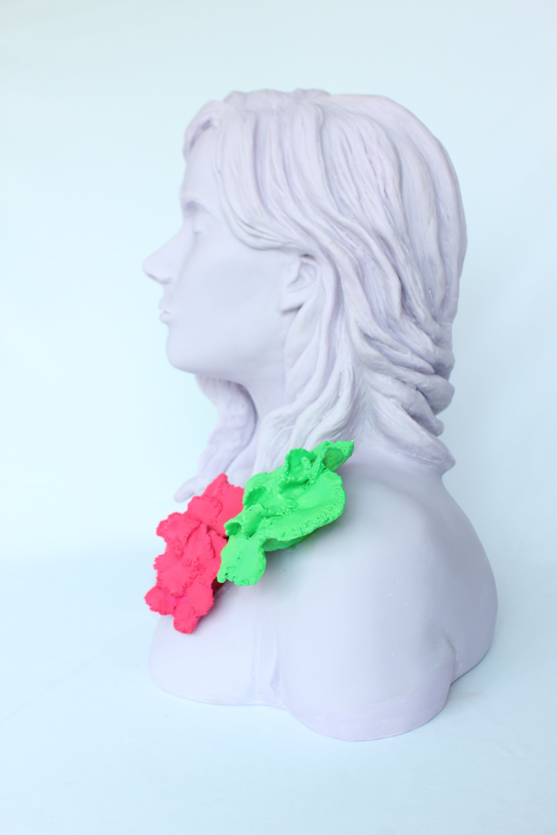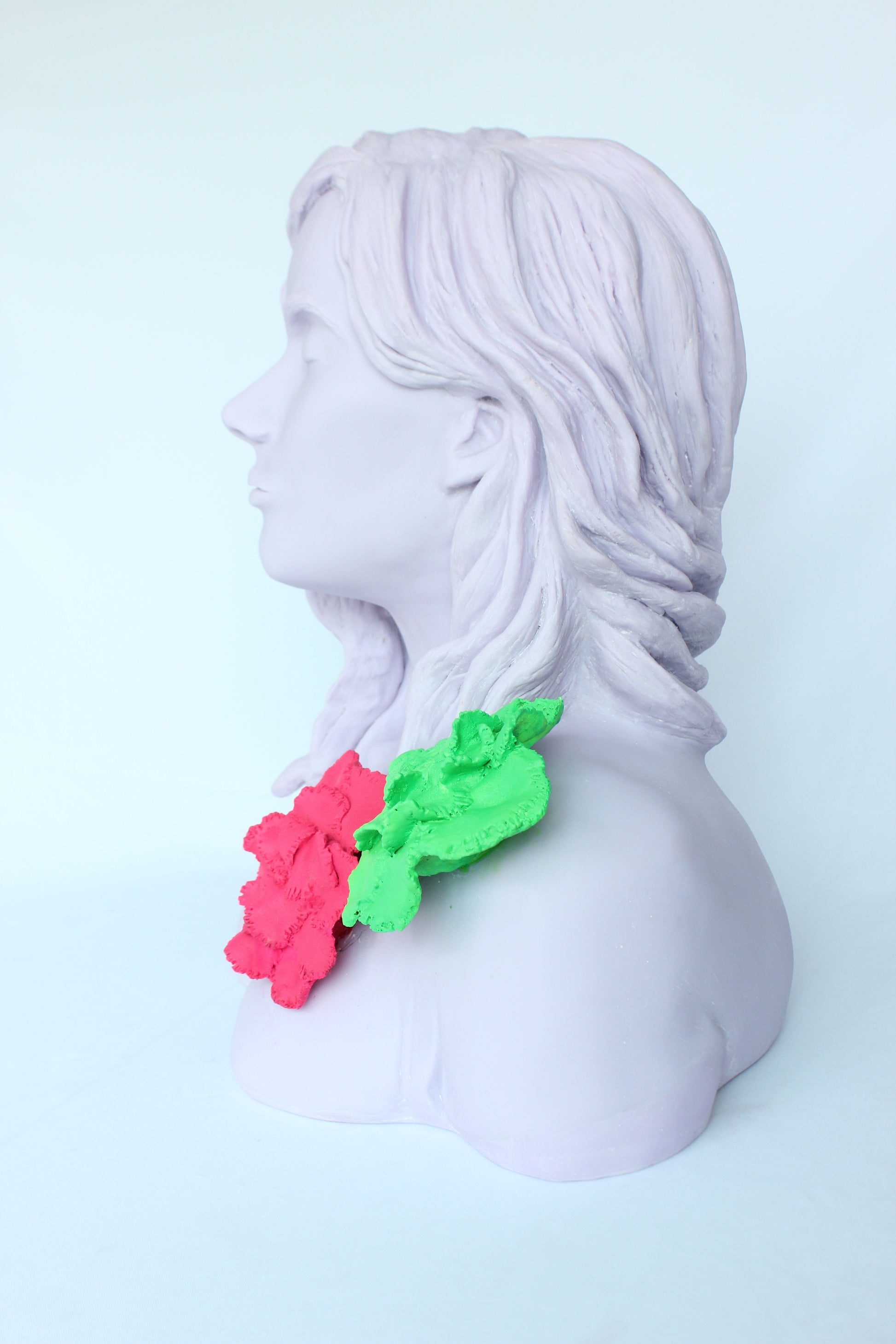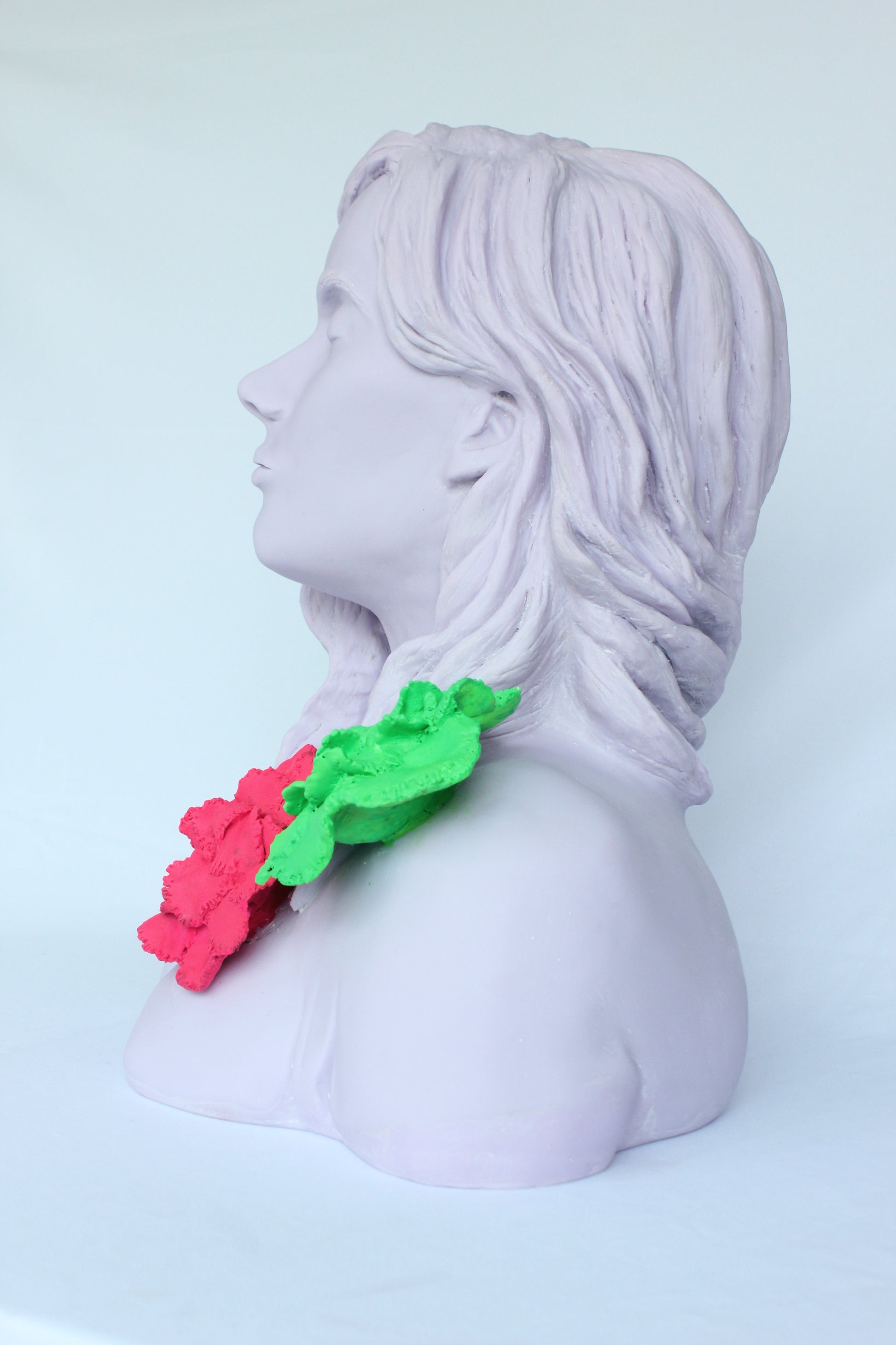 Mujer Mexicana es una impactante escultura creada por Celeste Bejarano, elaborada en resina epóxica. Esta obra explora la feminidad no solo como una identidad, sino como un poderoso agente de transformación social. En su creación, los tonos violetas predominan, simbolizando el proceso introspectivo y el empoderamiento de la mujer al reconectarse con su feminidad. La obra sugiere un viaje interno, donde la figura femenina se reconstruye, mirándose a sí misma para encontrar la fuerza y la sabiduría necesarias para influir en su entorno. Celeste plasma en esta pieza la idea de que la verdadera transformación comienza desde adentro.