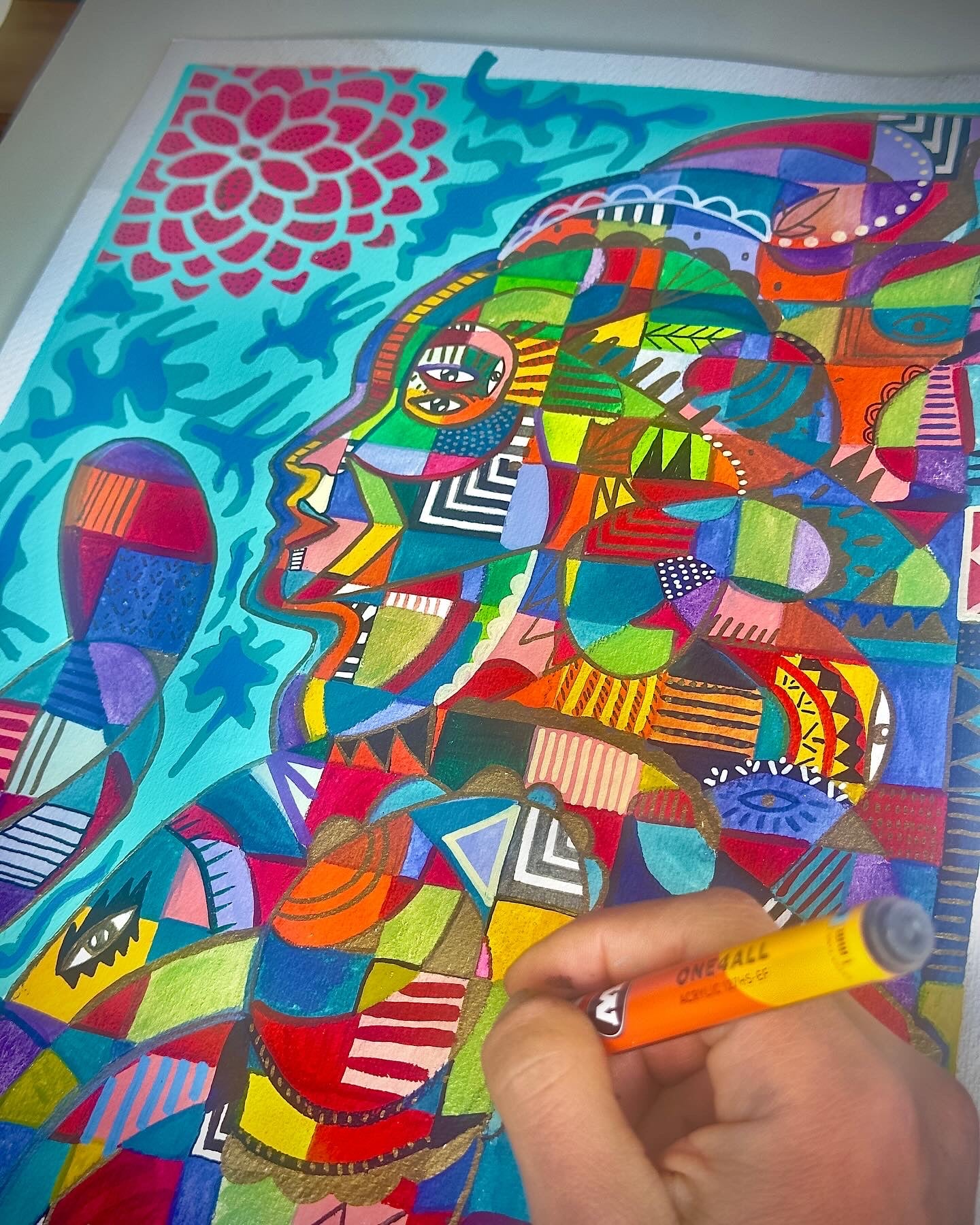 Esta pieza representa un ejercicio que estado realizando los últimos meses. Es la silueta de una mujer. El ejercicio consiste en usar una doble linea con dos lápices y trazar simultáneamente. El resultado es una figura abstracta y amorfa y con la separación de colores crea una armonización figurativa y abstracta ala vez .