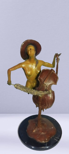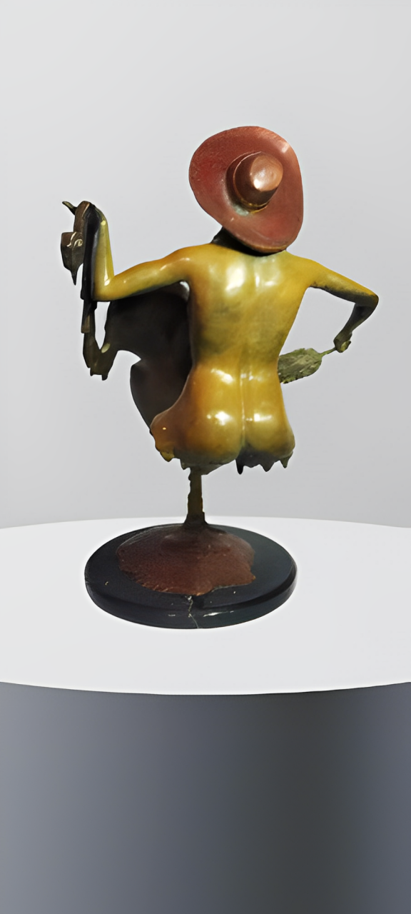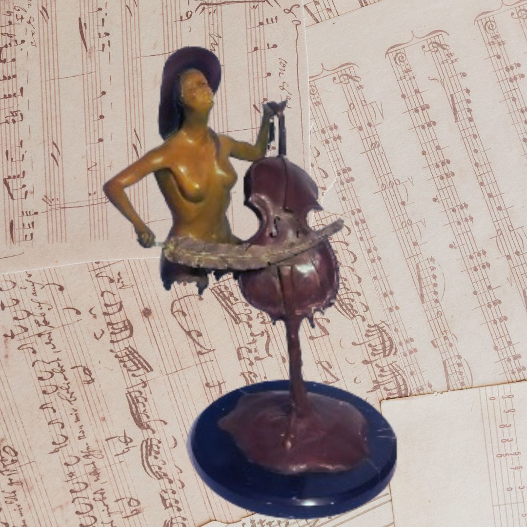 Esta escultura surrealista muestra la mujer en disolución tocando un instrumento igual fundido, la pluma evoca ligereza y fragilidad del humano. La música en realidad sostiene a esta protagonista física y emocionalmente en un equilibrio entre la dualidad creación-destrucción de la belleza y el arte, incluso cuando el propio ser se desvanece. Fusión alma cuerpo y arte la música
