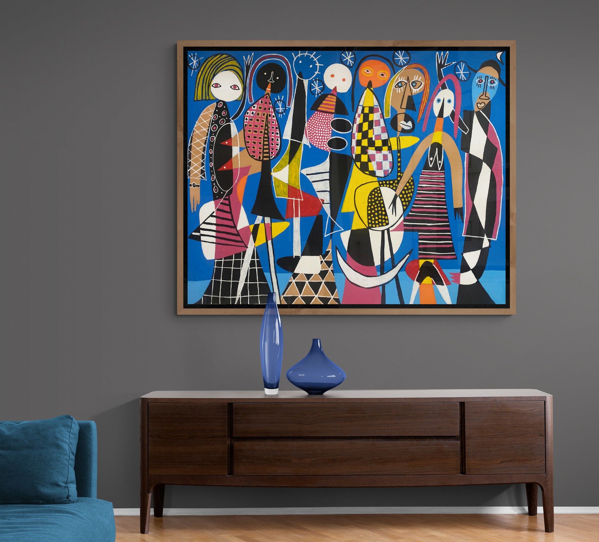 Multitud pieza de Enrique Pichardo (152 x 122 cm, acrílico sobre tela) es una obra que sintetiza el estilo expresionista figurativo del artista. Mediante formas reconocibles organizadas en un plano único, Pichardo crea una escena vibrante en la que cada figura parece interactuar con las demás, generando una composición cargada de movimiento. La elección de colores primarios y contrastes marcados refuerza la energía de la obra, mientras los trazos fluidos evocan una atmósfera lúdica y dinámica. Desde el primer vistazo, se impone una percepción colectiva: la figura humana como unidad y multitud al mismo tiempo.