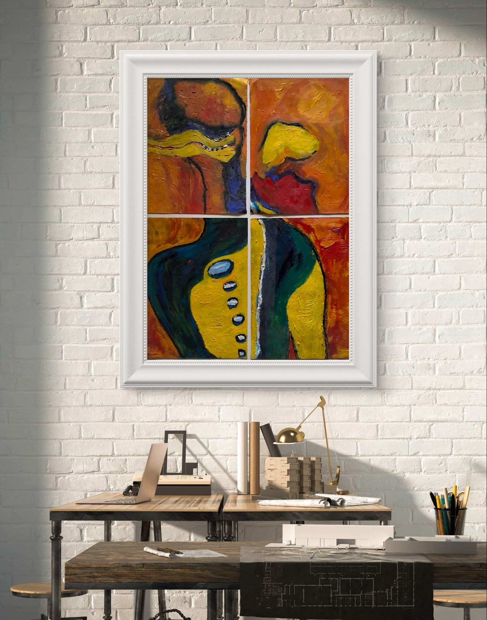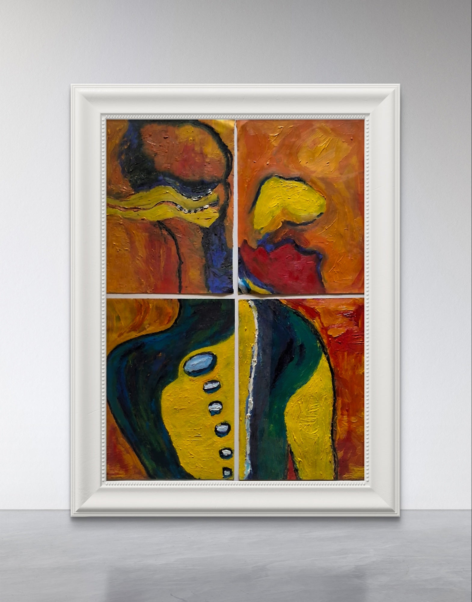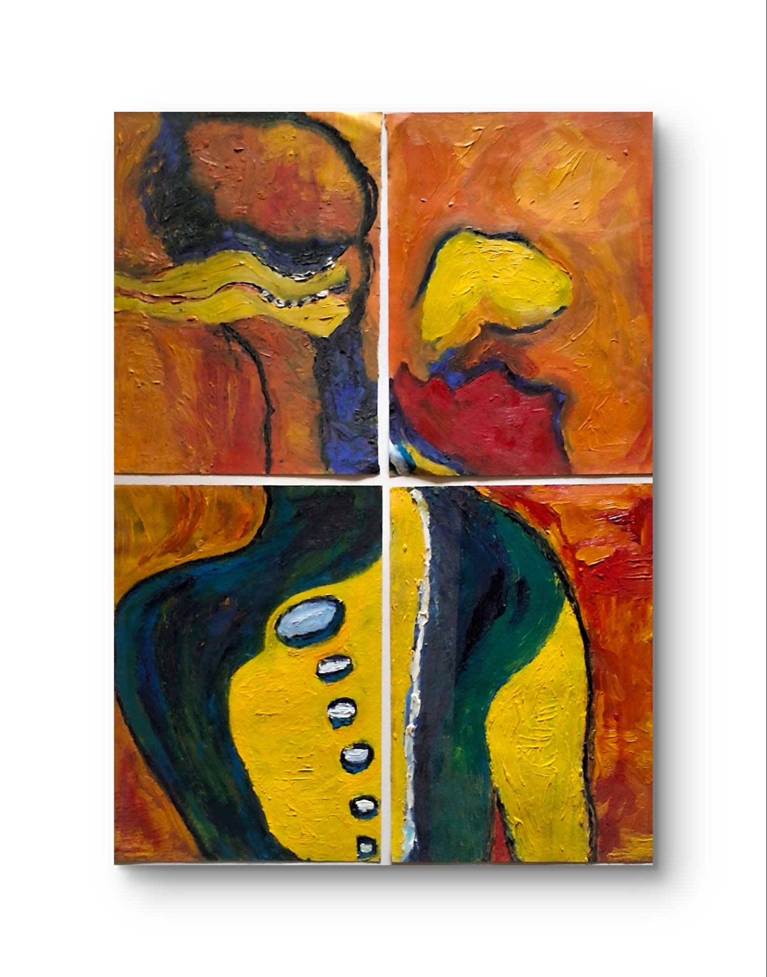 Esta obra consiste en un conjunto de cuatro paneles divididos, formando una imagen compuesta. Está realizada con técnica de óleo con pinceladas gruesas y texturizadas. Los colores predominantes son tonos cálidos, como amarillos, naranjas y rojos, contrastados con negro, verde y azul oscuro. Los trazos curvos y abstractos sugieren formas orgánicas y fluidas, aunque sin una representación figurativa clara, lo que provoca que el espectador interactúe de manera subjetiva con la imagen.
