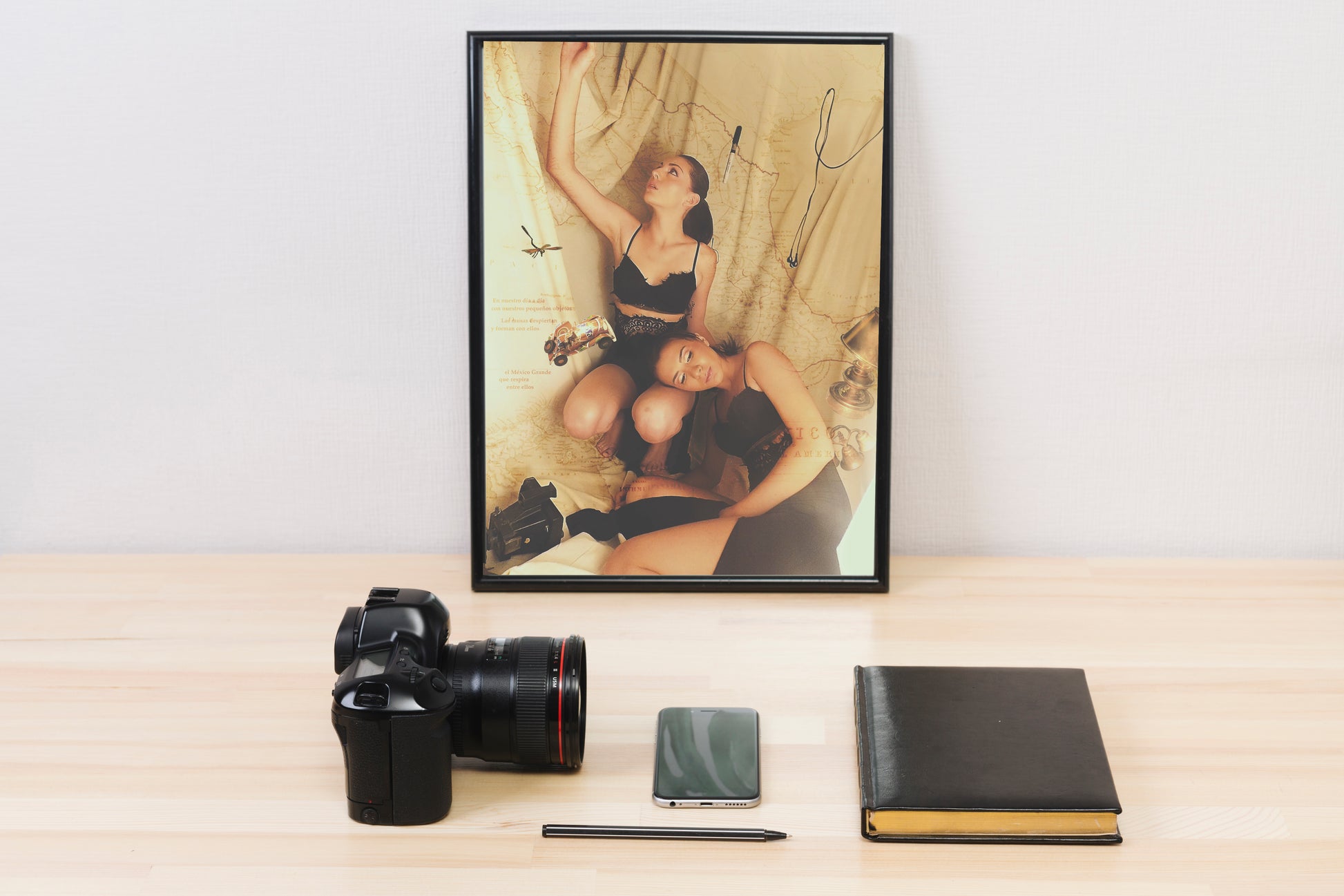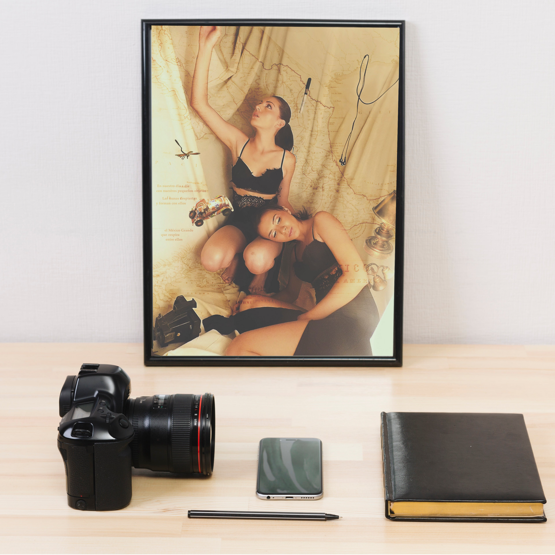 Esta es una fotografía muy interesante, dado que los objetos que están volando alrededor de las modelos fueron colocados ahí mediante hilos plásticos transparentes, y así se logró la toma, después de ello, la trabajé en photoshop para darle algunos efectos extras y cierta atmósfera antigua. Contraté a las modelos en específico para esta toma.