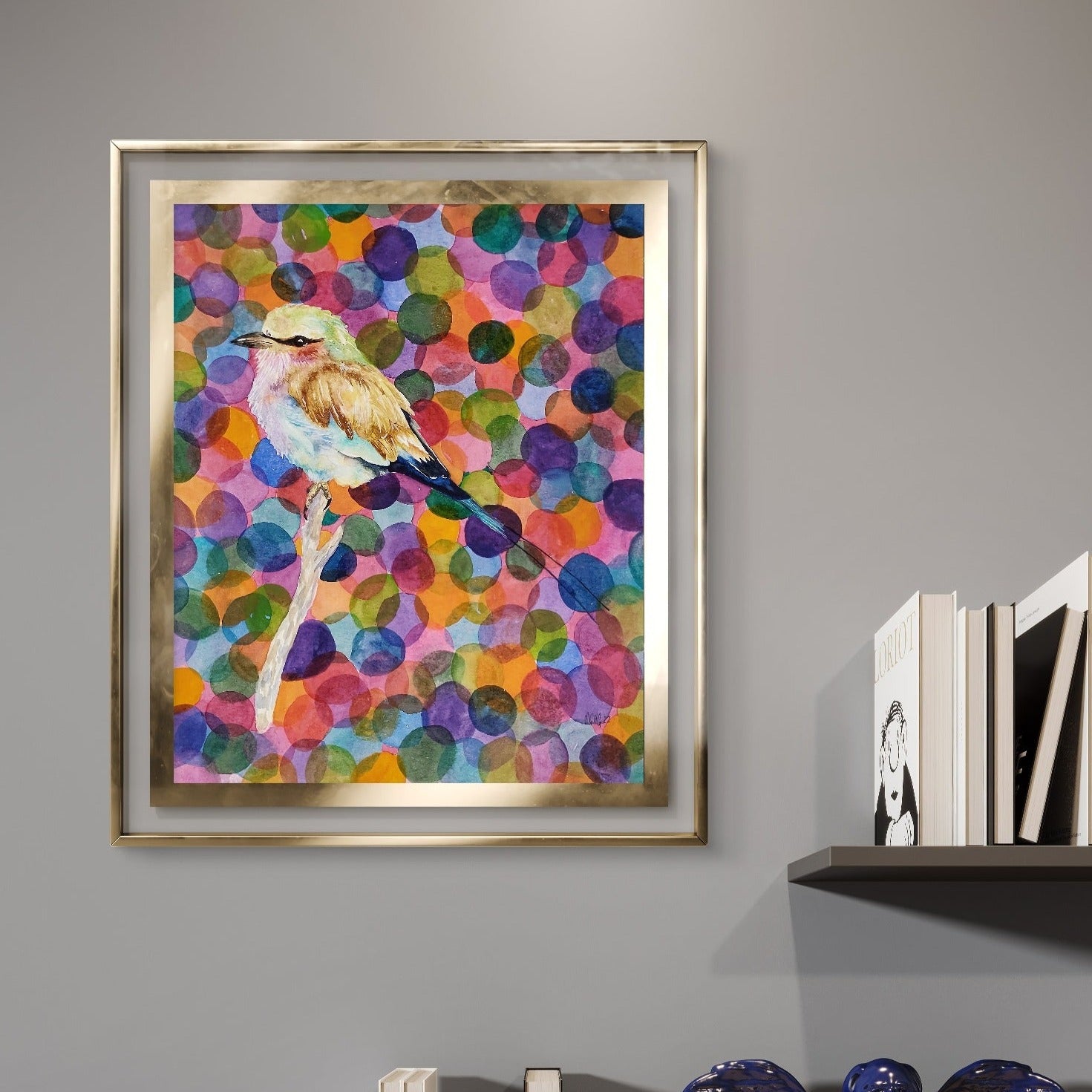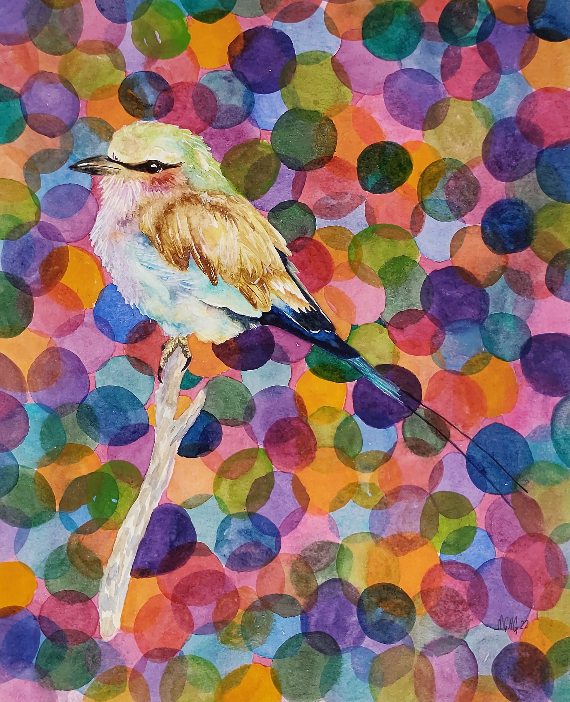 Una pieza en la que represento mi forma de ver la luz, representándola en una diversidad de color casi mágico. También intentando hacer vibrar la vista del espectador y llenarla de color. La fragilidad de un ave pequeña posada en una rama apenas existente pero con la seguridad de sus alas para volar en el momento justo.