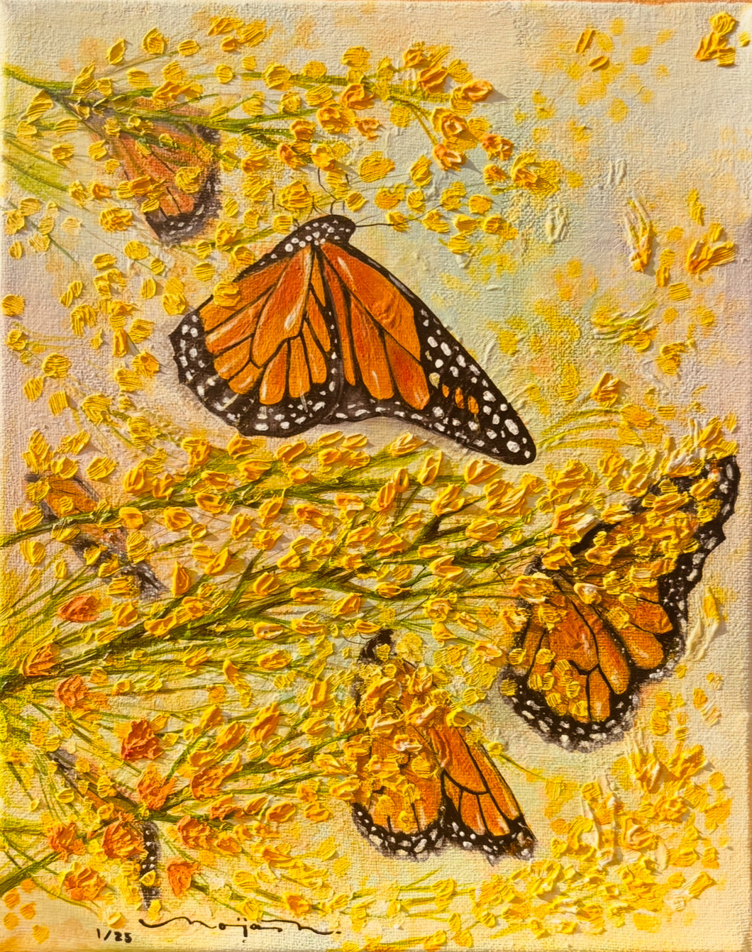 En esta obra las mariposas parecen esconderse y disolverse en su entorno, en un delicado juego entre la luz y el follaje , en un movimiento etéreo con la naturaleza.