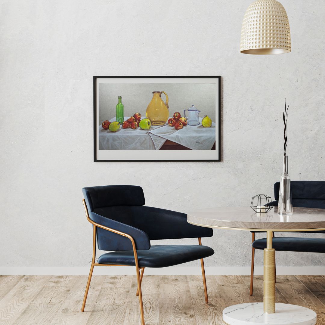 Naturaleza muerta reúne objetos cotidianos y frutas dispuestos con equilibrio sobre un mantel blanco. La obra destaca por su delicado manejo de la luz, el realismo de las texturas y una atmósfera serena y armónica.