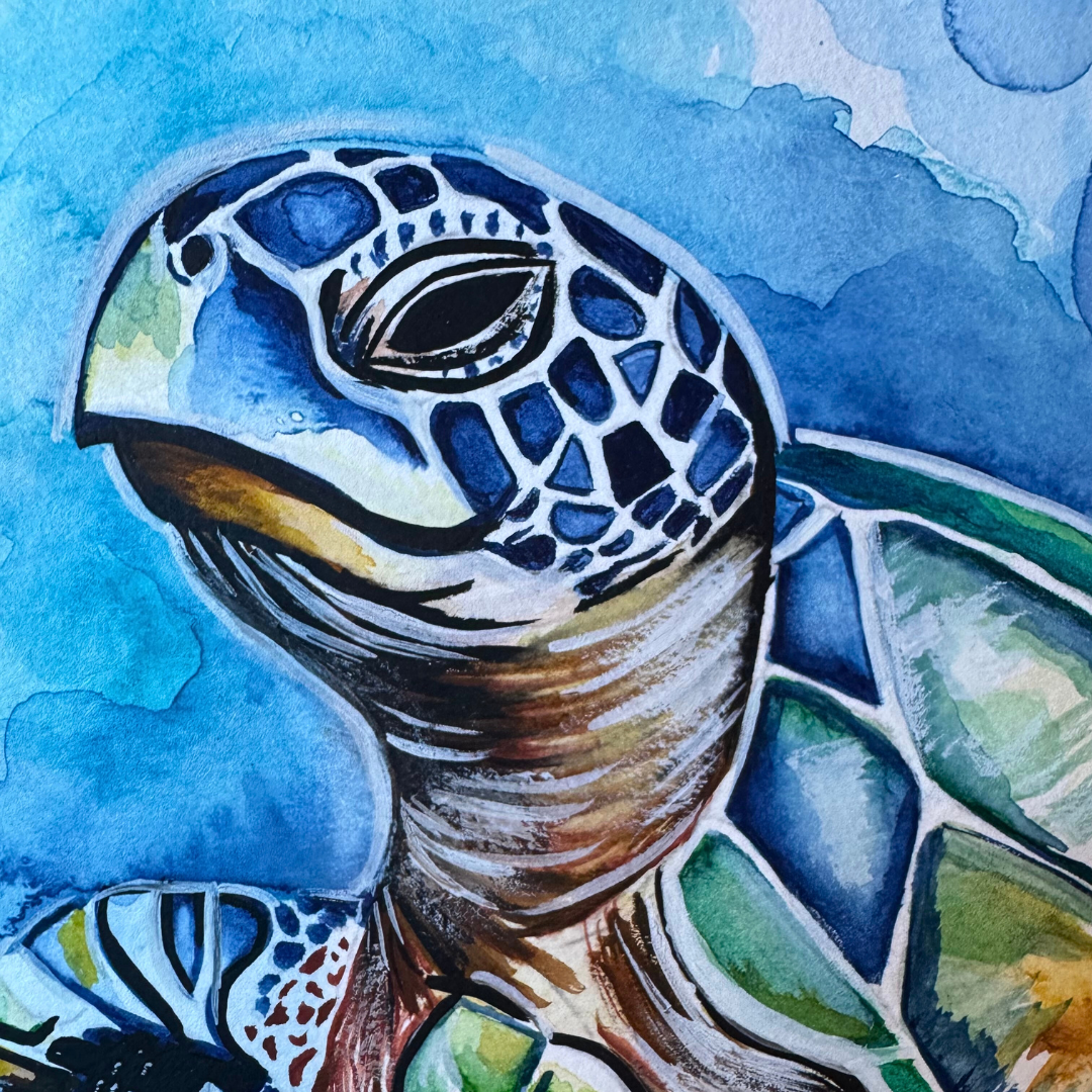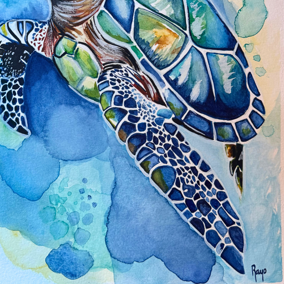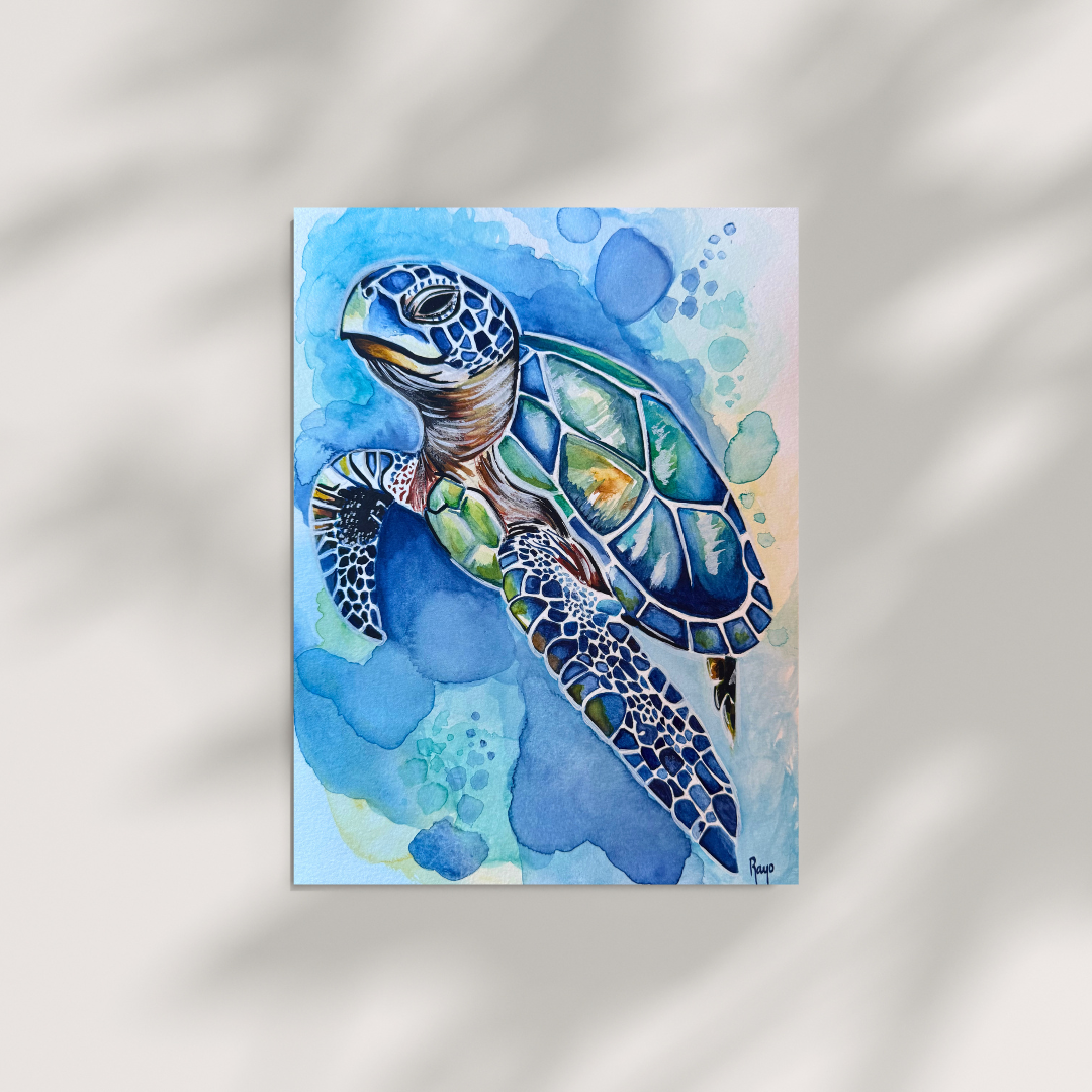 Los tonos azules y las pinceladas fluidas evocan la energía del agua, que en la espiritualidad representa emociones, intuición y sanación. La tortuga, nadando en este entorno sereno, podría simbolizar la capacidad de navegar por la vida con confianza y equilibrio, teniendo fe en el porvenir.