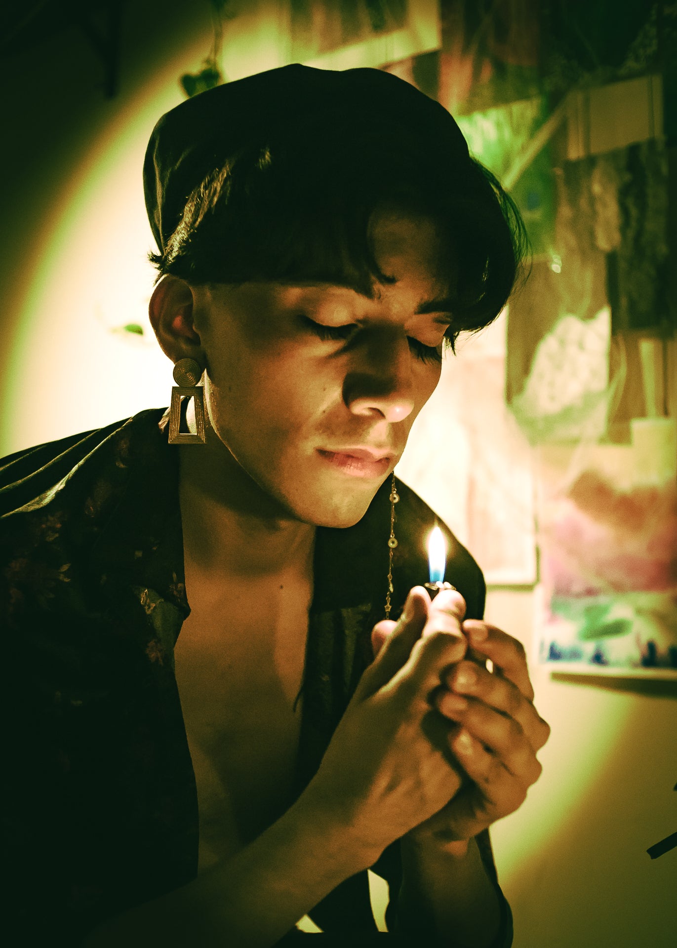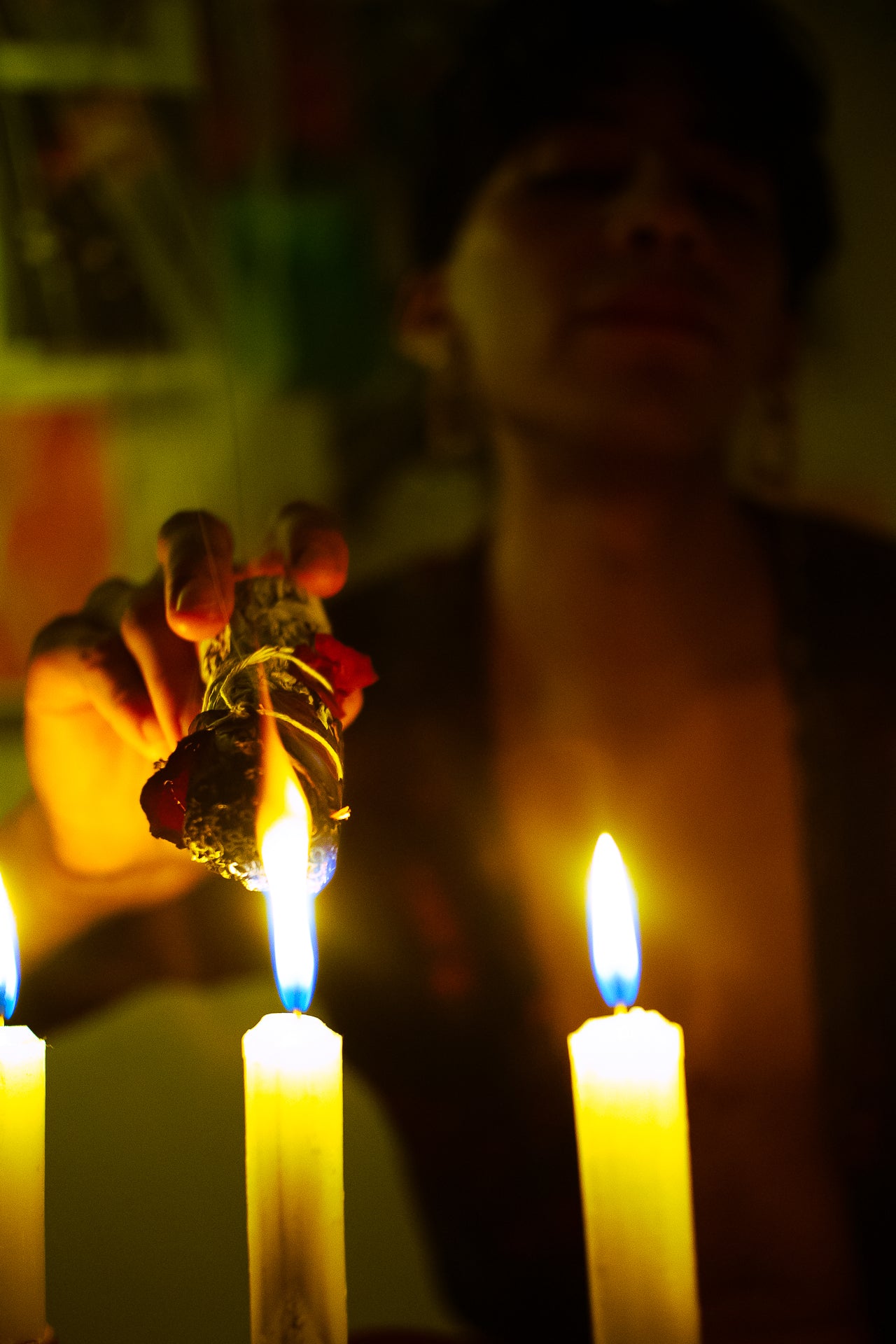 Una noche de lluvia de Abril se ha configurado el ritual del artista, una suerte de misterio en su resultado, las velas avivan la tristeza en su mirada, sus creaciones le acompañan.
