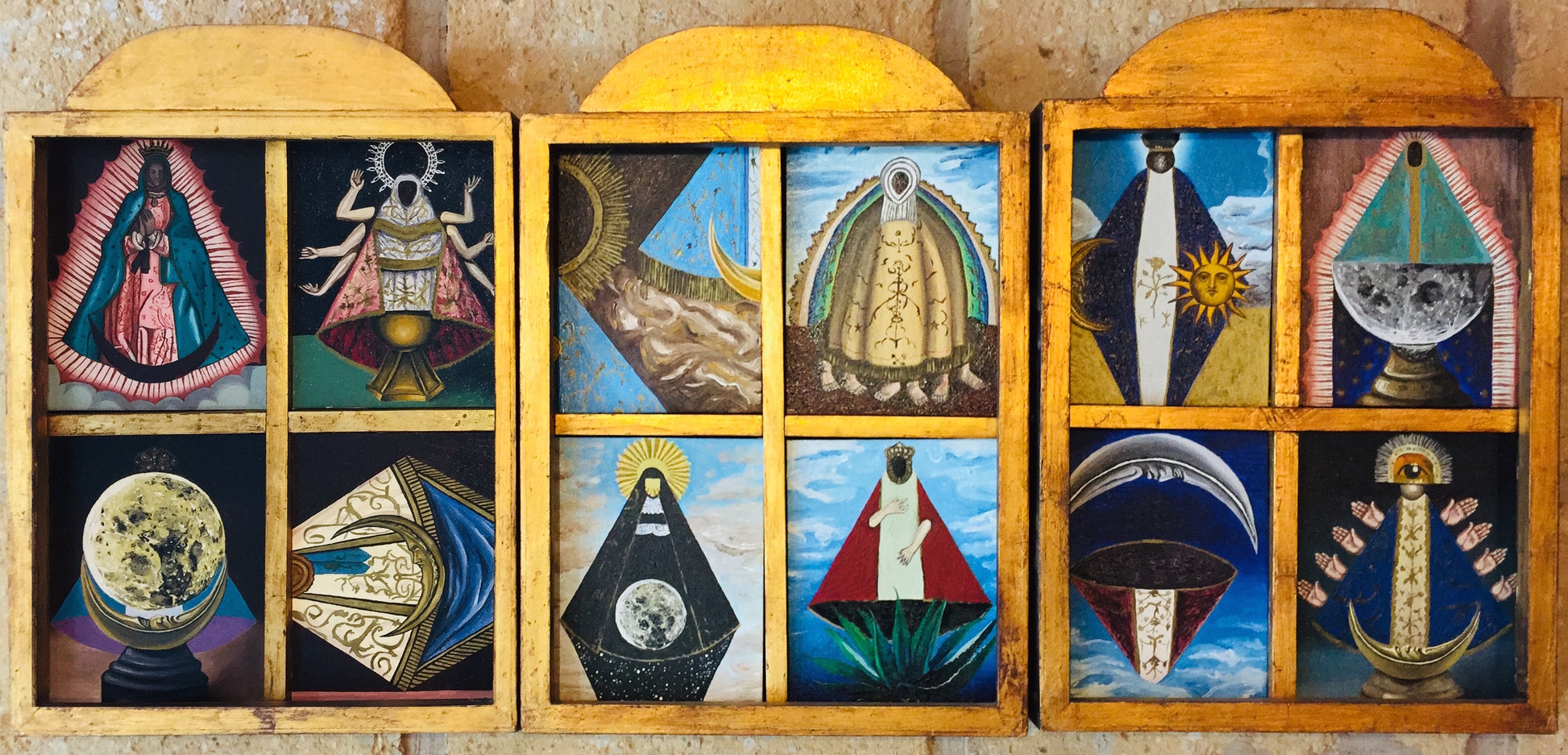 Óleo sobre tela realizado en 2013, Las neoadvocaciones como su nombre lo dice son nuevas advocaciones o sea nuevas representaciones Marianas, en estas 12 representaciones se crearon nuevas representaciones icónicas en las que se crearon variantes en composición, forma, simbólica; creando y recreando nuevas representaciones de iconografías empolvadas enmarcadas en madera dorada