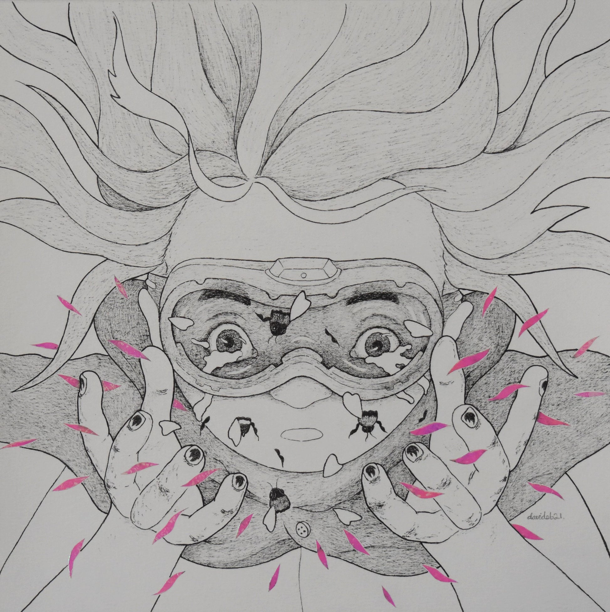 Técnica mixta, dibujo en tinta, lápiz y cinta tornasol sobre papel (Canson 300g)