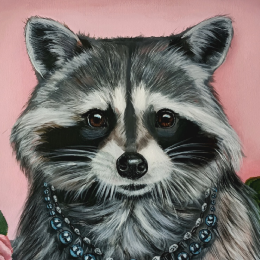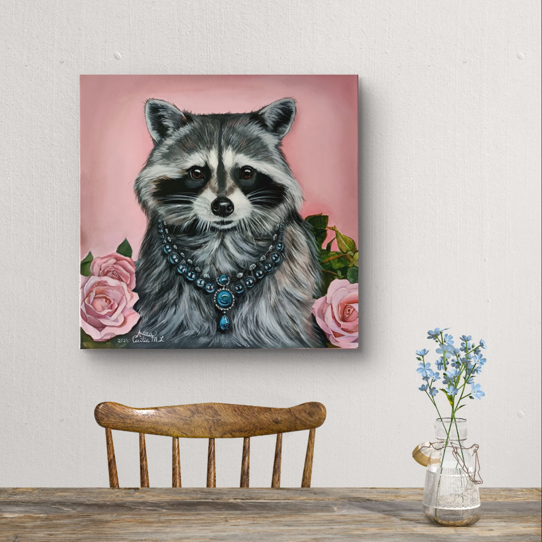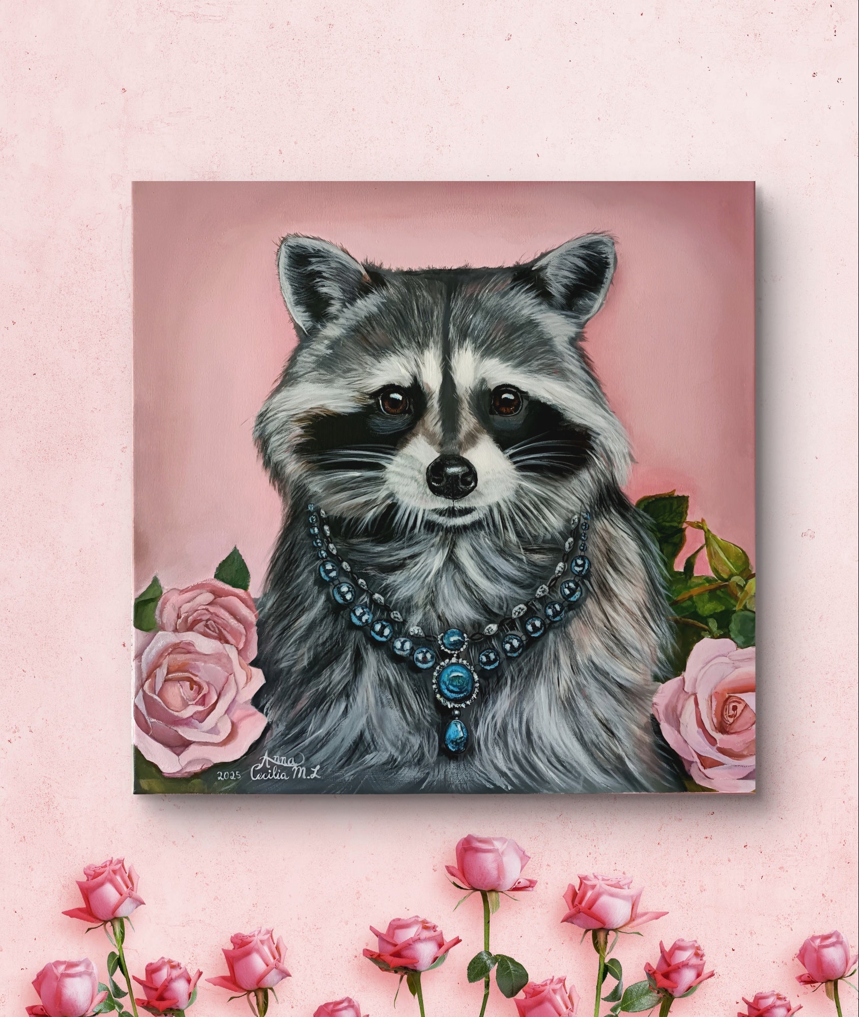 "Nobiltà Selvaggia" es una oda a la dualidad entre la naturaleza y la realeza, un retrato que desafía la percepción de lo salvaje. Con una mirada intensa y penetrante, este mapache se erige como un símbolo de misterio y sofisticación, llevando con orgullo un collar de piedras preciosas que resplandece con cada reflejo de luz.