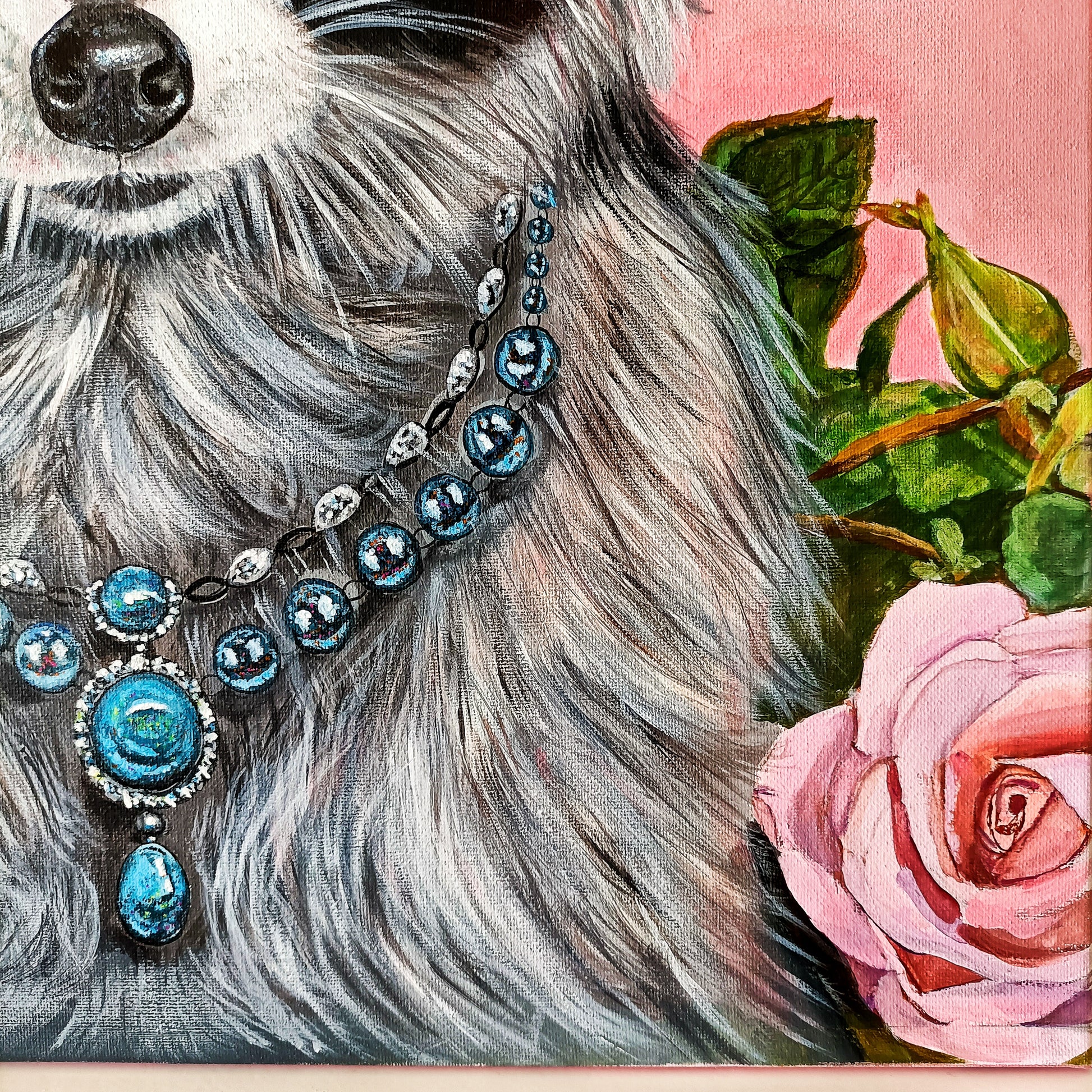 El fondo en tonos rosados envuelve la escena con un aire etéreo, contrastando con la textura meticulosa del pelaje, donde cada pincelada cobra vida con un hiperrealismo fascinante. Las rosas enmarcan al protagonista como si fueran un homenaje a su nobleza intrínseca, fusionando la esencia del arte clásico con un enfoque contemporáneo.