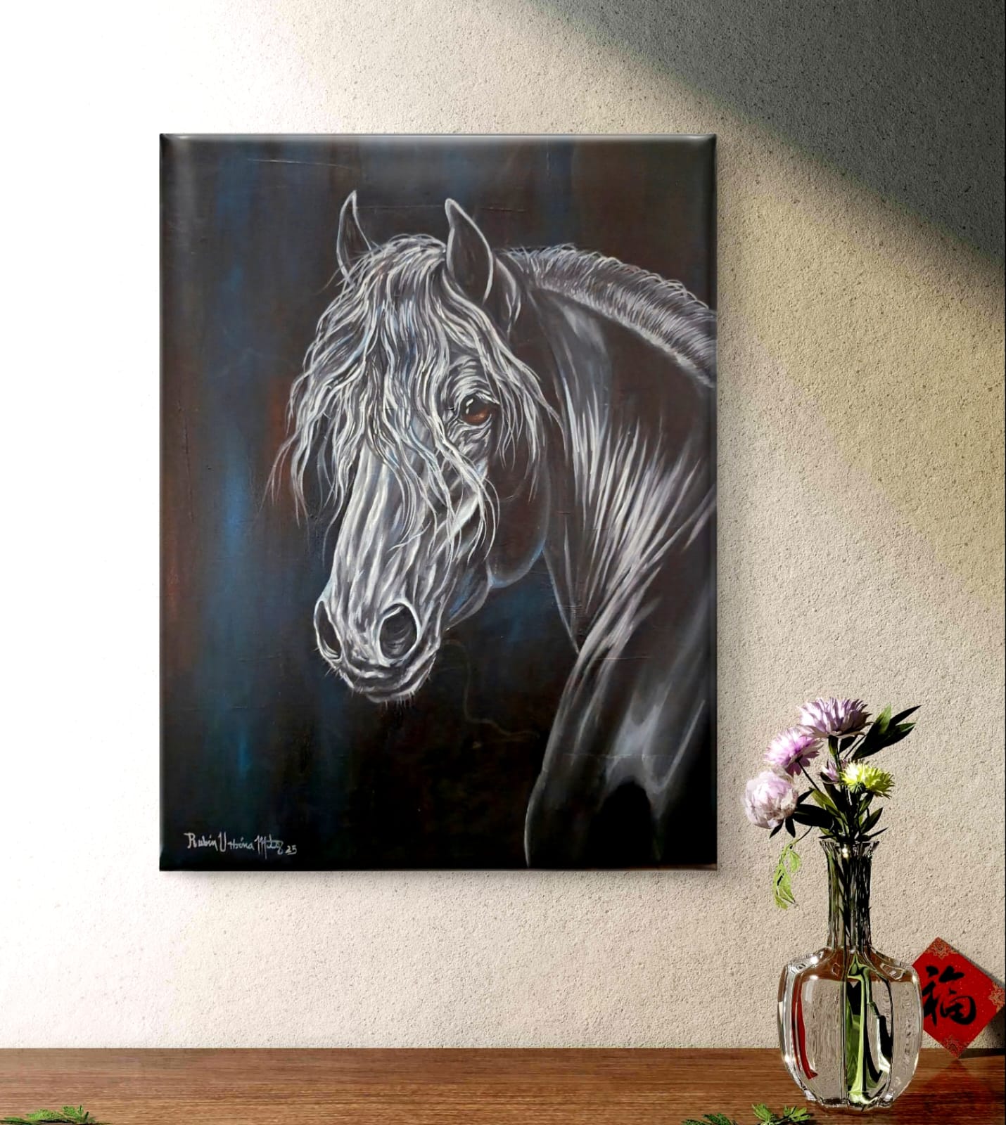 Entre la oscuridad mas envolvente, la nobleza y belleza se abre camino, este es el caso de este ejemplar de la raza frisian, que nos mira con firmeza y compasion.