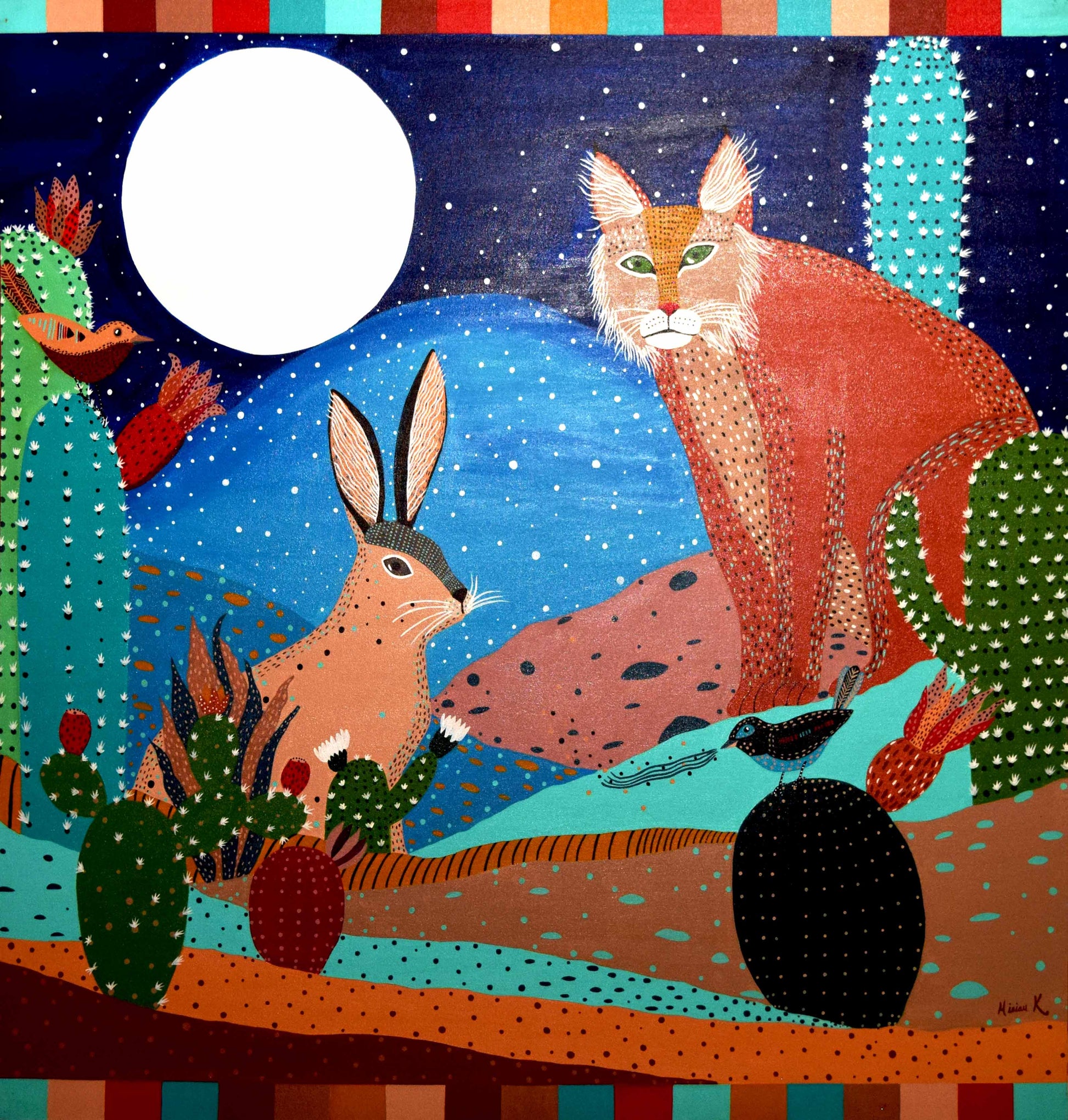 Es una obra en que nos lleva a un desierto lleno de misticismo. La luna en su esplendor alumbrando a un lince y una liebre. Estos son parte un espacio único.