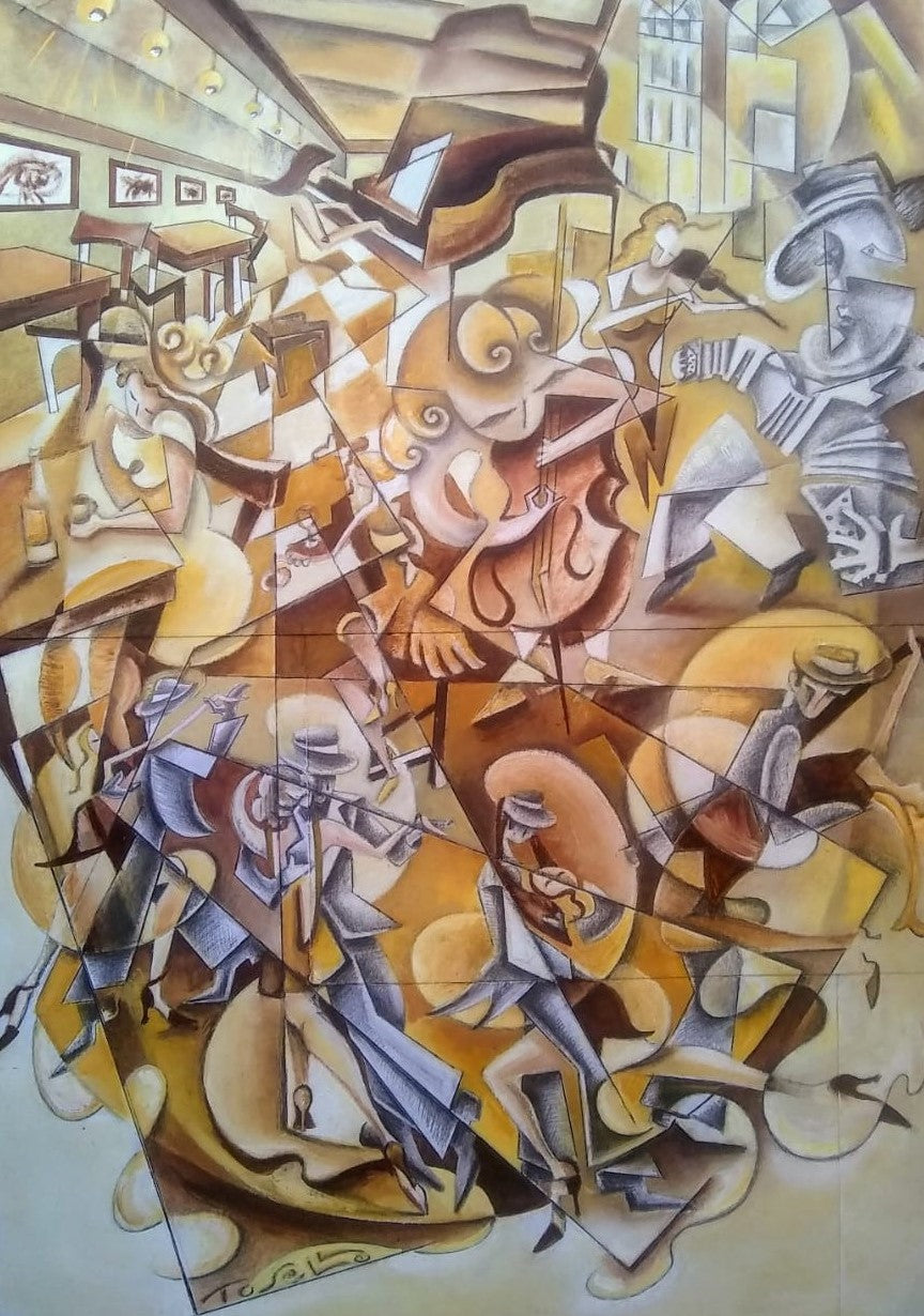 El gozo se puede alcanzar de diversas formas. Un colectivo de almas que coinciden en su pasión, creando una noche interminable de música y baile, iluminando en cada paso, en cada pieza, el espacio circundante. Geométrica composición en ocres y tierras que destaca algunas figuras en grafito, dejando otros personajes y elementos más ocultos para ser descubiertos por el observador.
