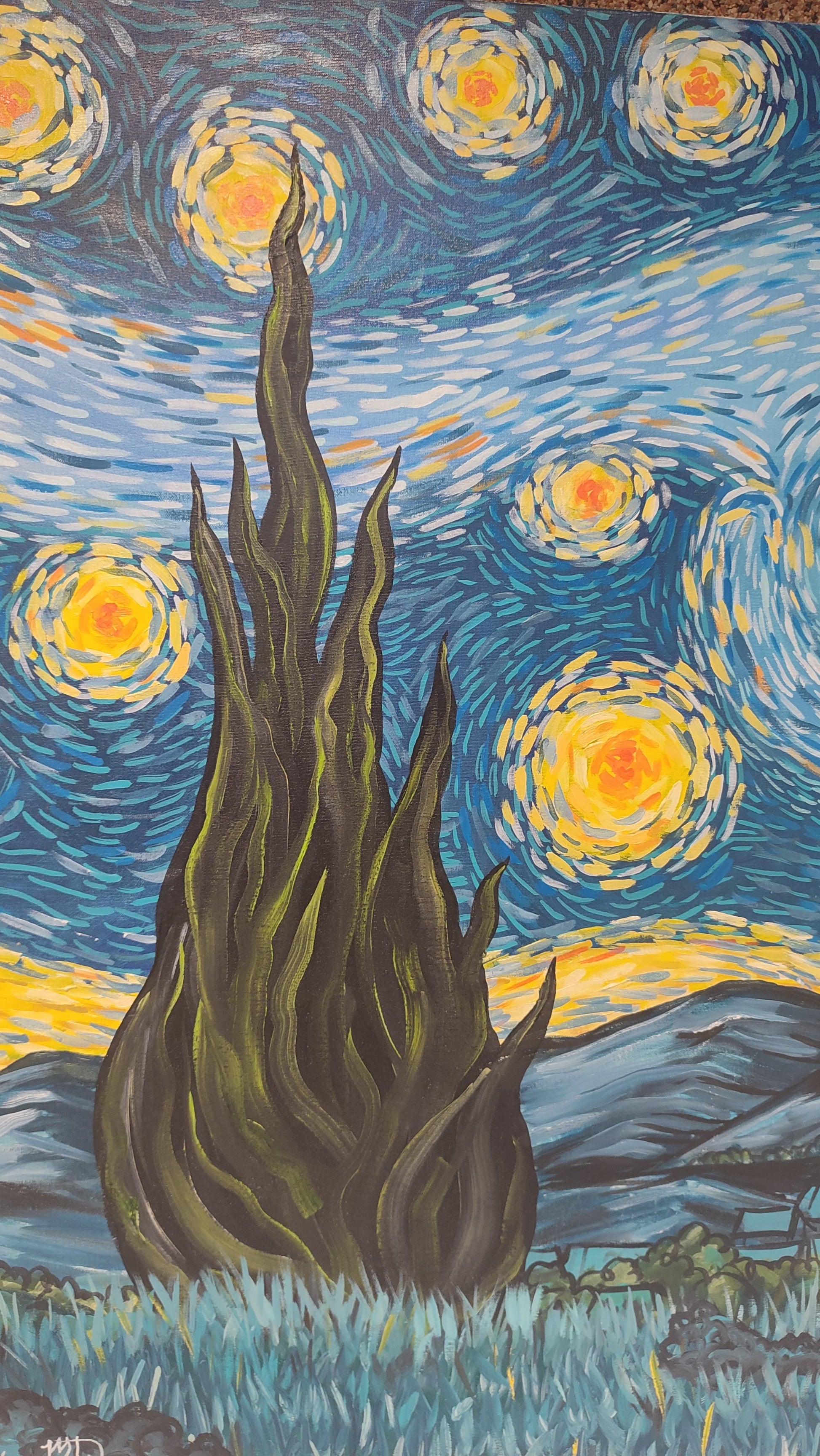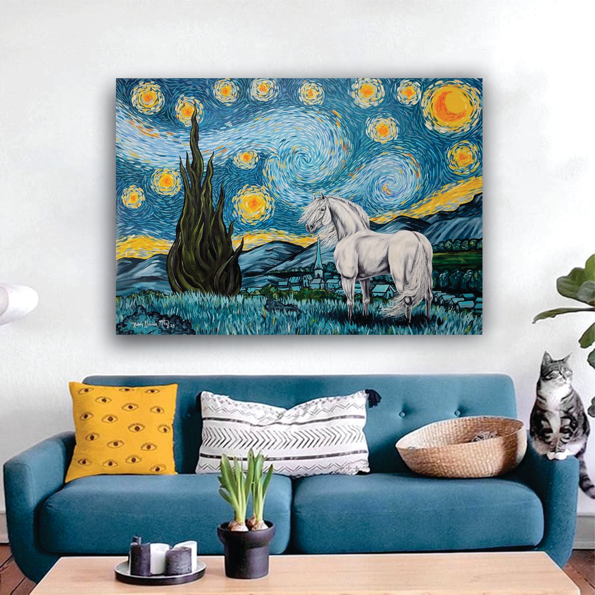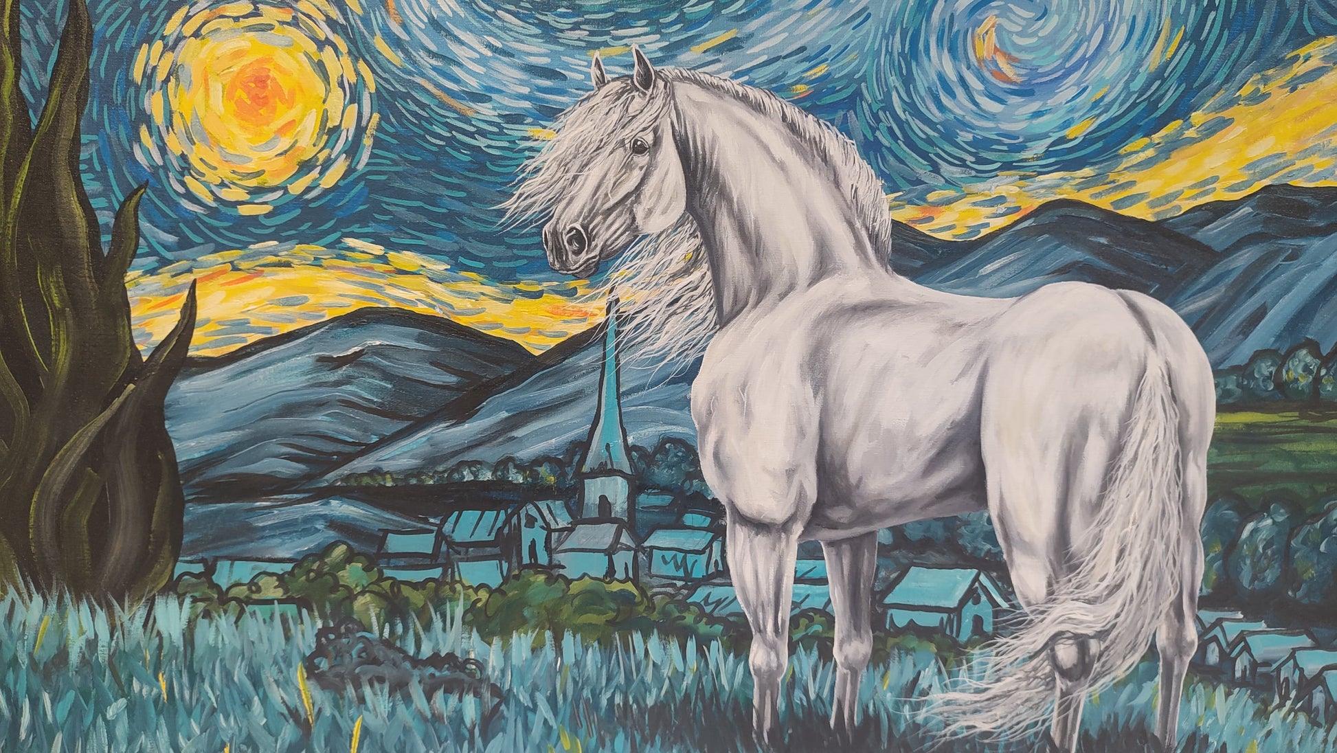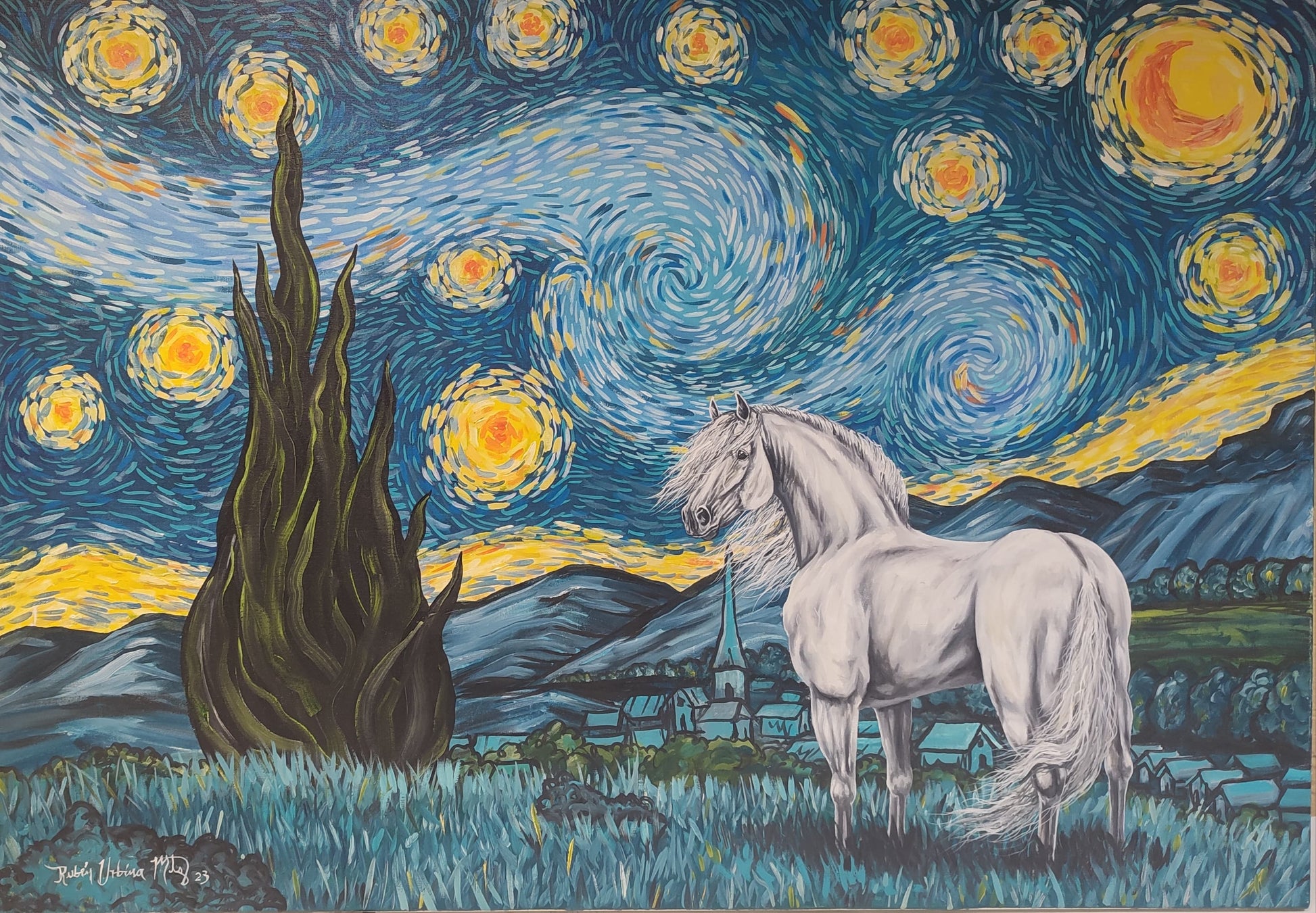 Obra pictórica inspirada en la famosa pintura del artista Vincent Van Gogh, donde se añade un toque personal y único, un precioso caballo español tordillo que mira el pueblo de Arles en la misma perspectiva que alguna vez lo viera Van Gogh.